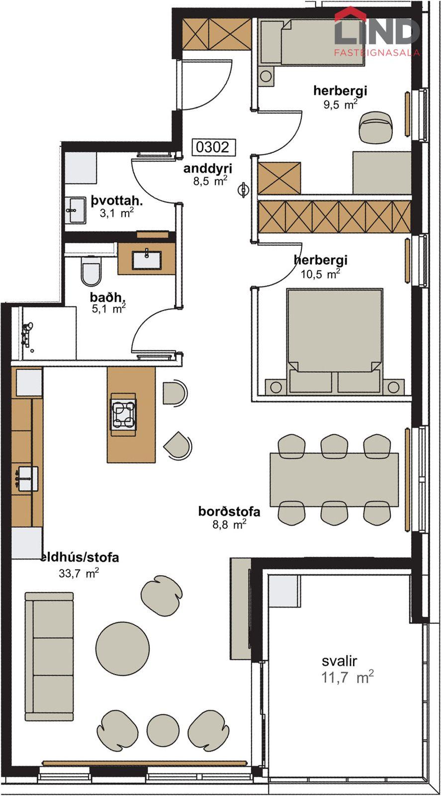 Íbúð 302 er þriggja til fjögurra herbergja með þvottahúsi og bílastæði í kjallara.