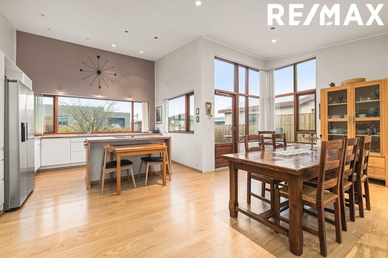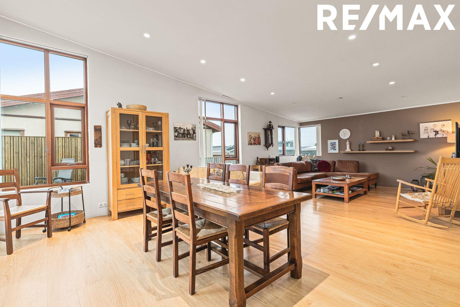 Stofa/Borðstofa: Stofa og borðstofa eru saman í flæðandi og rúmgóðu rými, með útgangi út á sólpall.