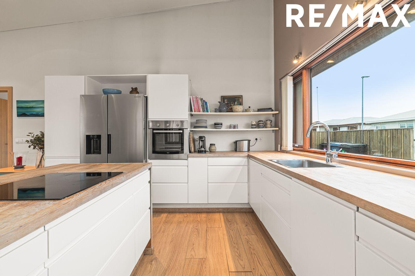 Eldhúsi: Er bjart og opið með stórum gluggum, góðu skúffu- og skápaplássi ásamt eyju með helluborði, bakaraofn er í vinnuhæð.