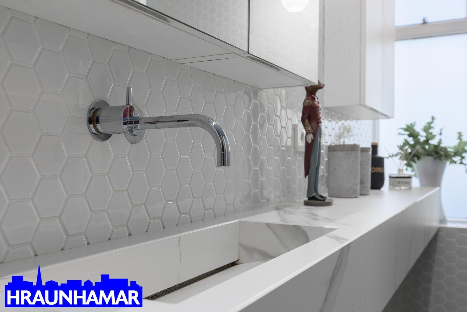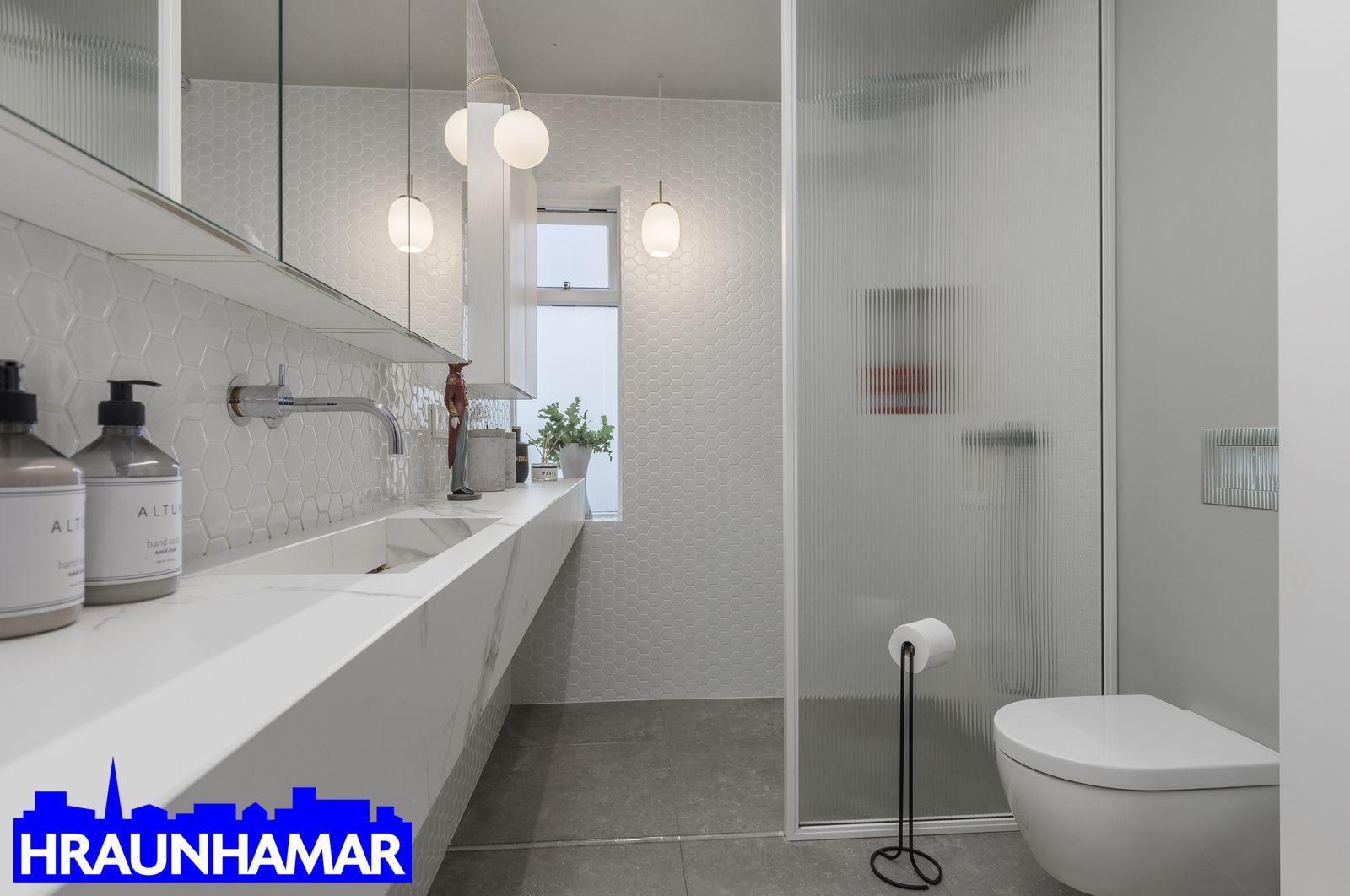 Baðherbergi: Mikið endurnýjað baðherbergi, upphengt salerni, náttúrusteinn í borði og vask, opin sturta, handklæðaofn. Flísar á gólfi og hluta af veggjum.