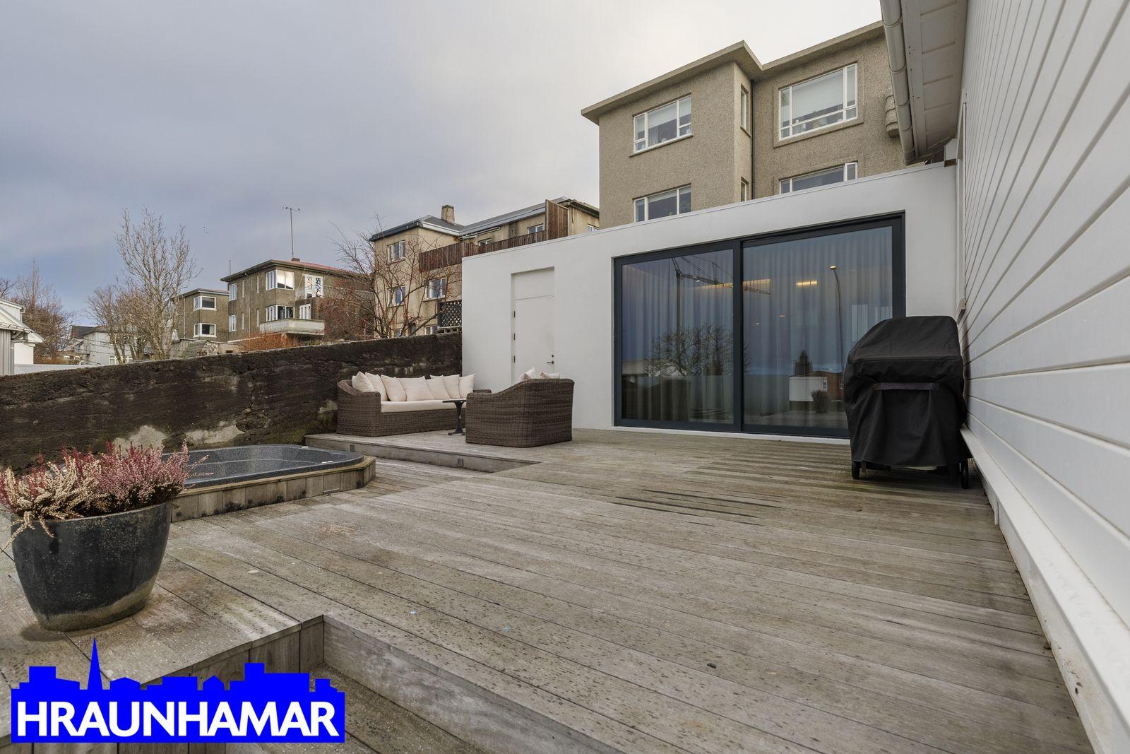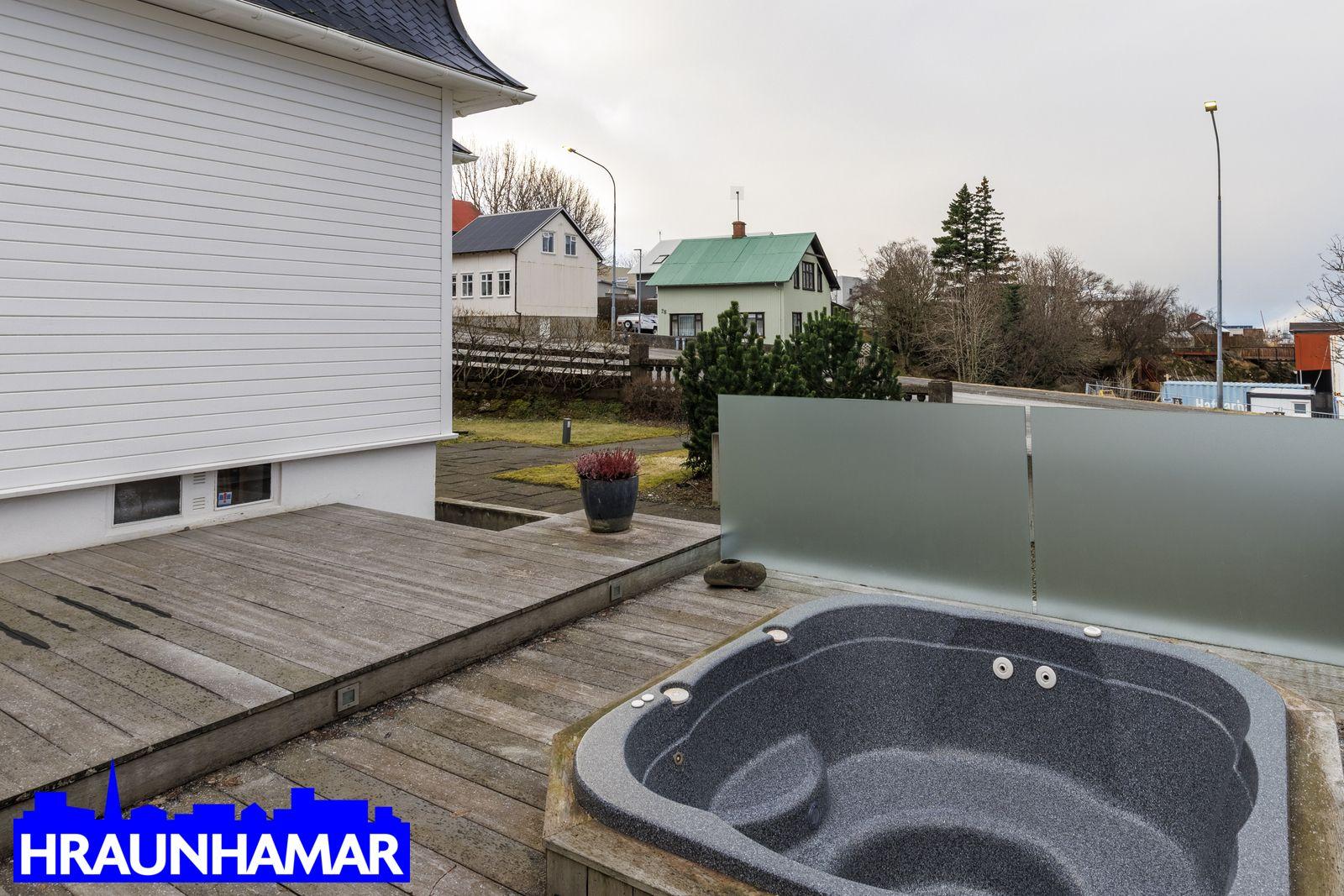 Sólpallur: Stór og góður sólpallur með heitum potti.