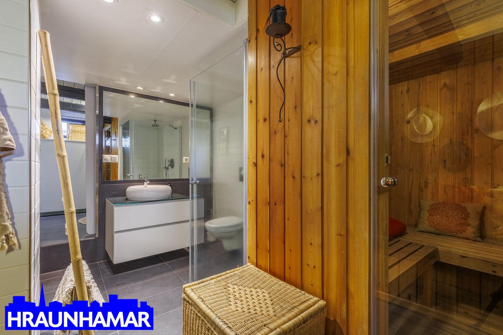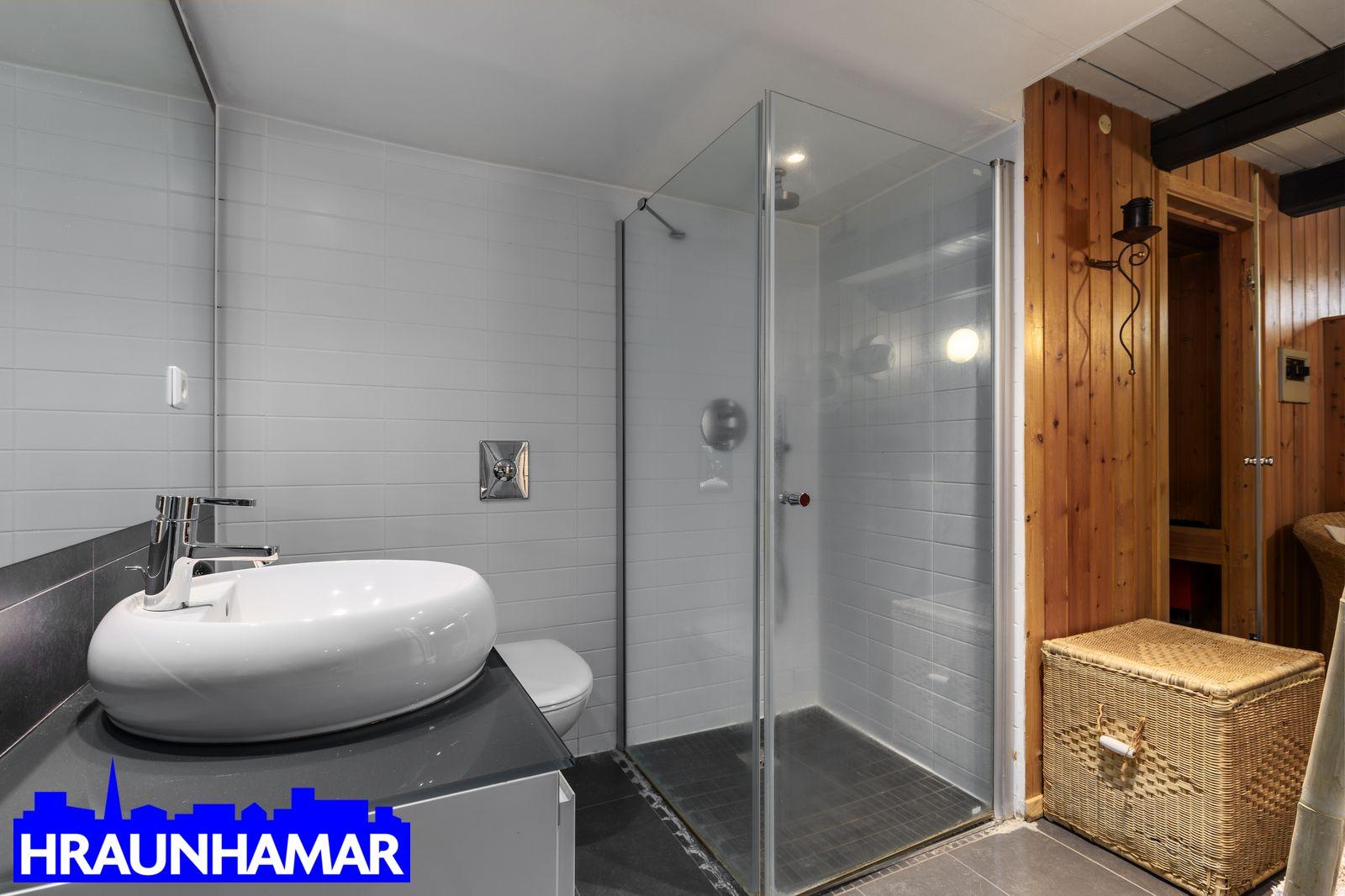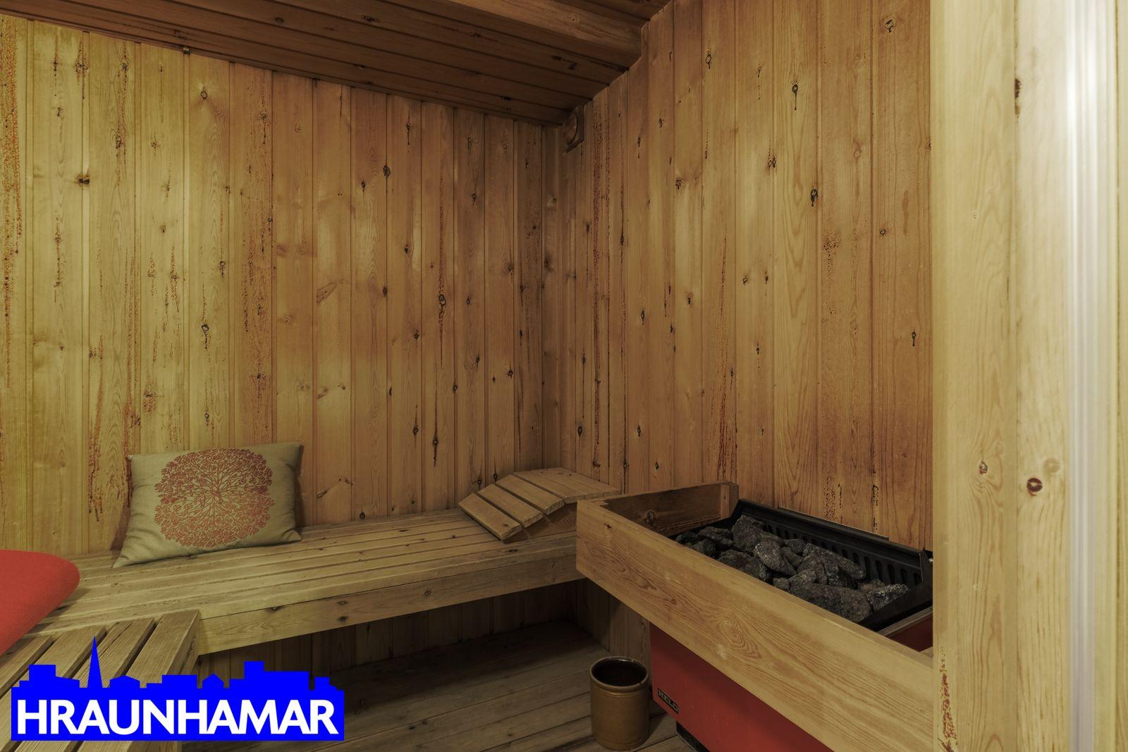 Gufa/baðherbergi: Gengið er eitt þrep niður og þá eykst lofthæðin í þessu rými. Þarna má finna sturtu, upphengt salerni og saunu með setrými fyrir framan. Flísar á gólfi.