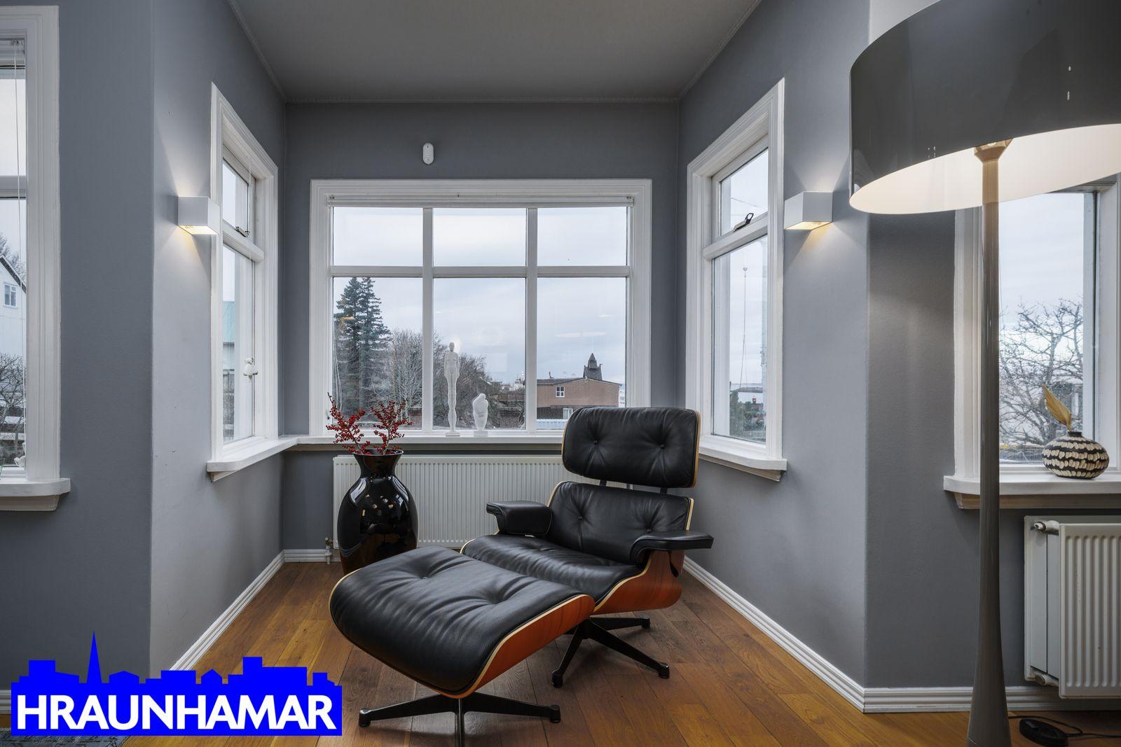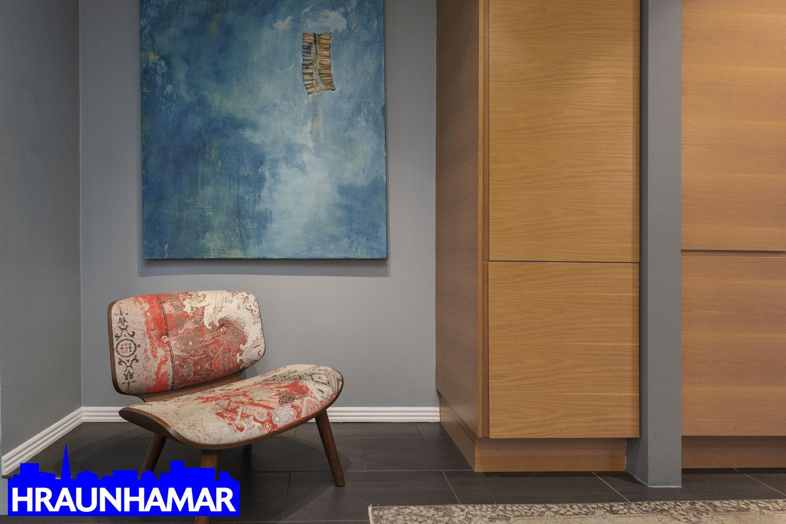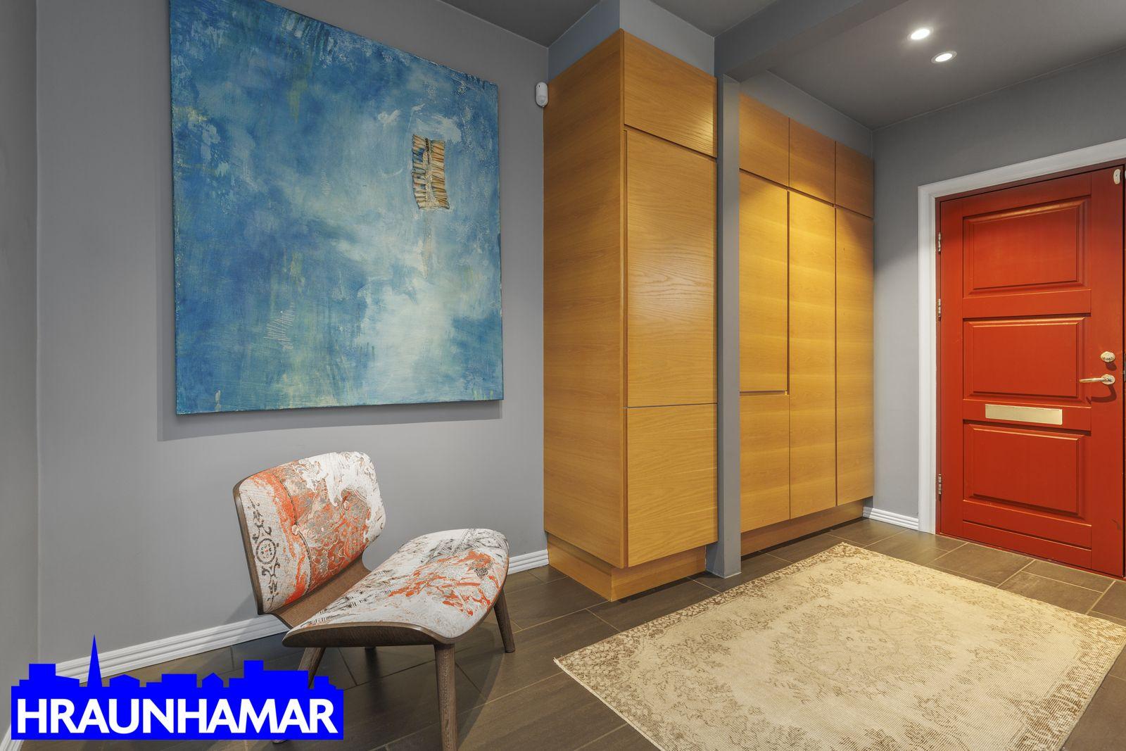 Stofa: Hlýleg, opin og björt með innfelldri lýsingu, góðri lofthæð, gegnheilt parket á gólfi.