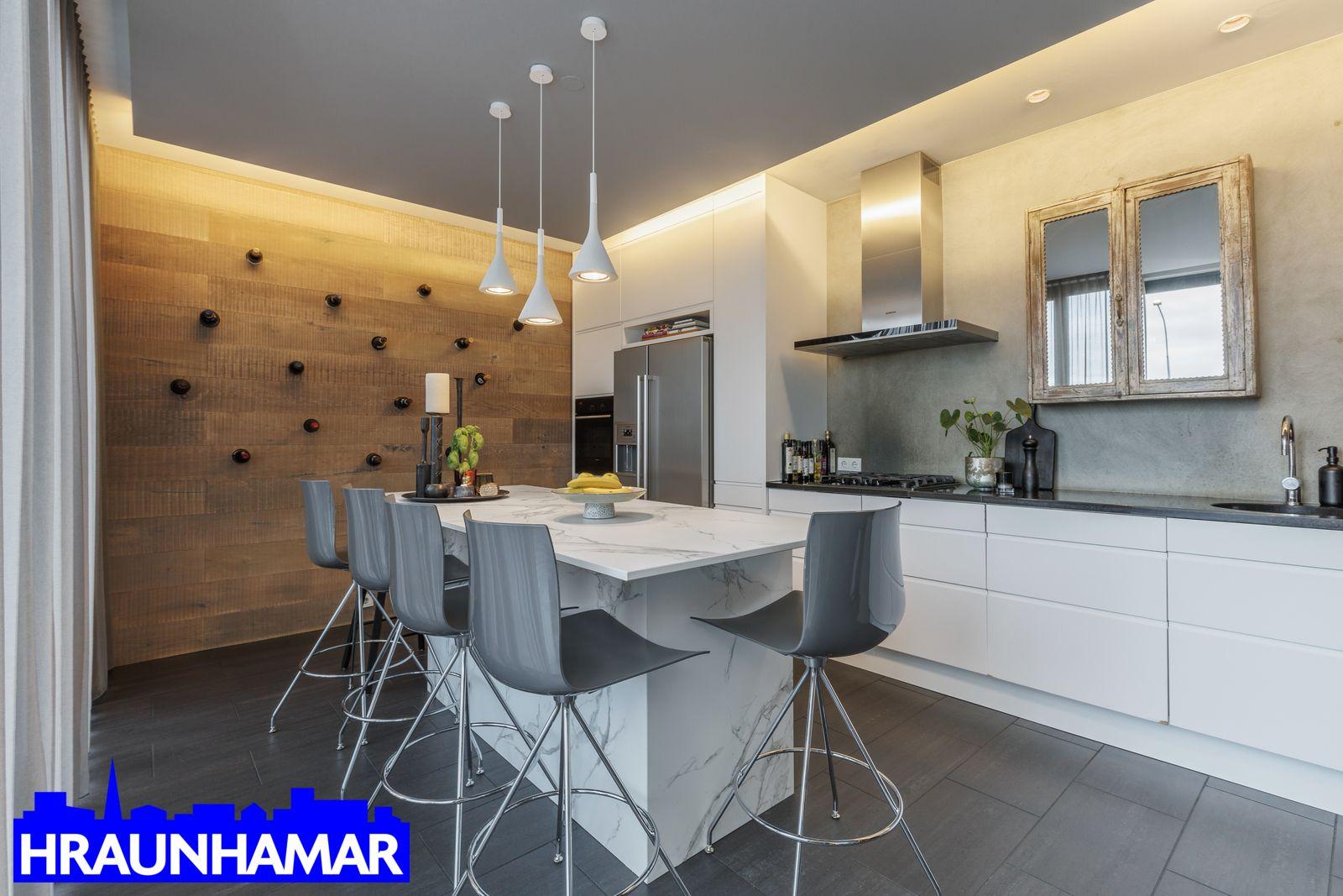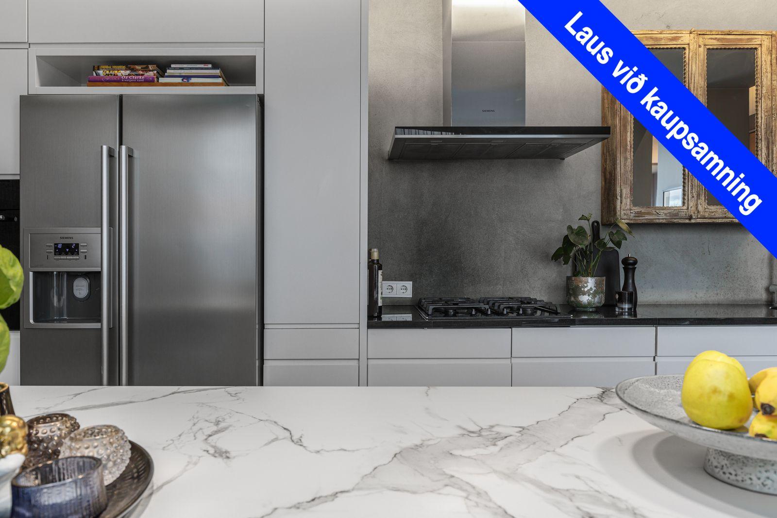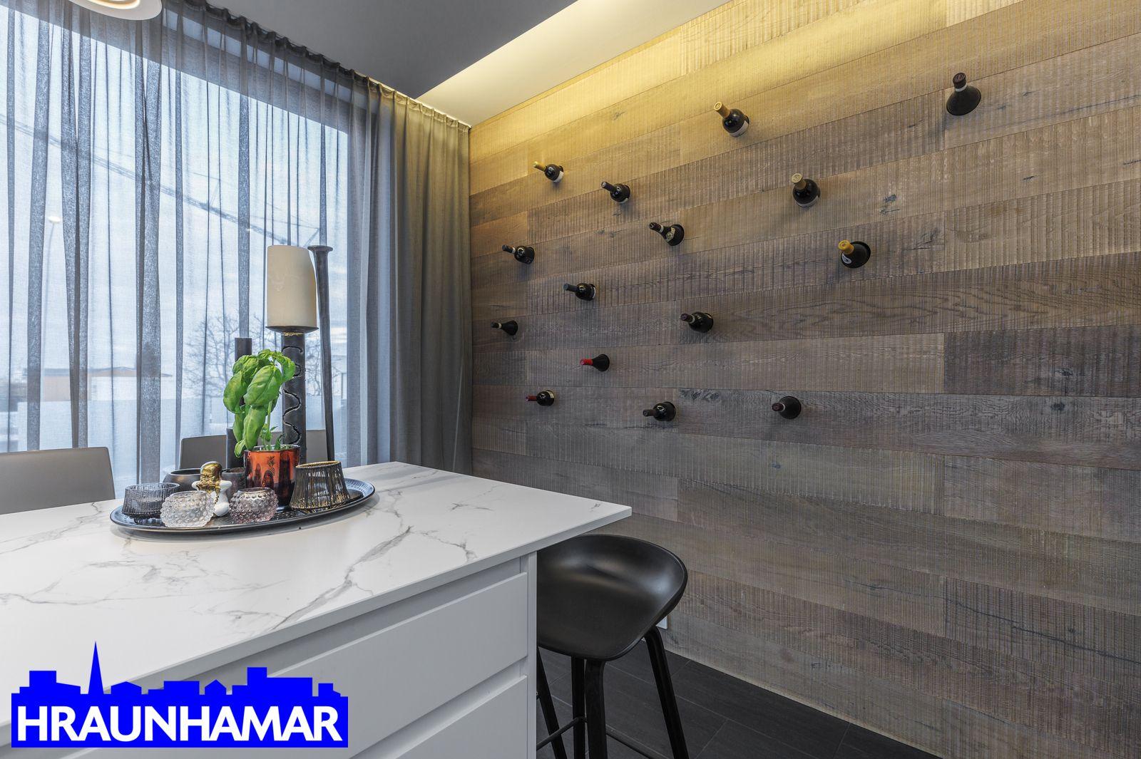 Stofa: Hlýleg, opin og björt með innfelldri lýsingu, góðri lofthæð, gegnheilt parket á gólfi.