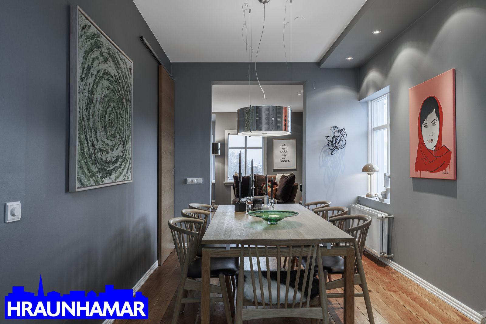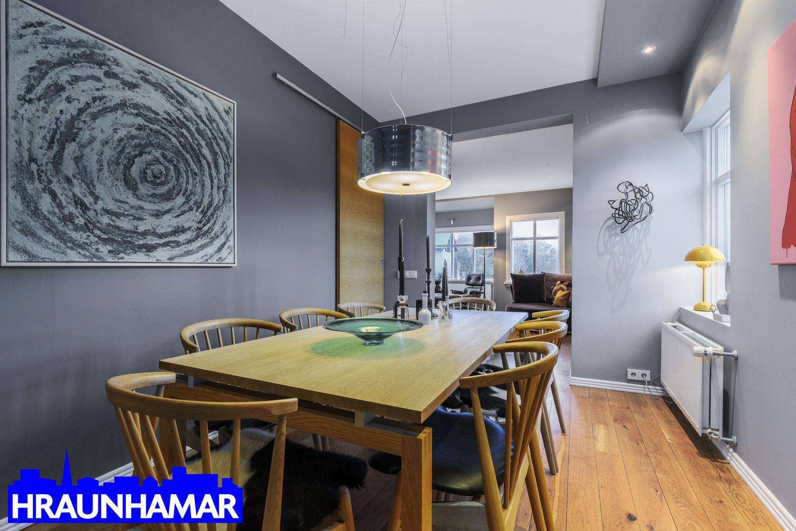 Borðstofa: Opið rými sem tengir saman stofu og eldhús. Gegnheilt viðargólf. Gengið niður í kjallara úr borðstofu úr rennihurð.