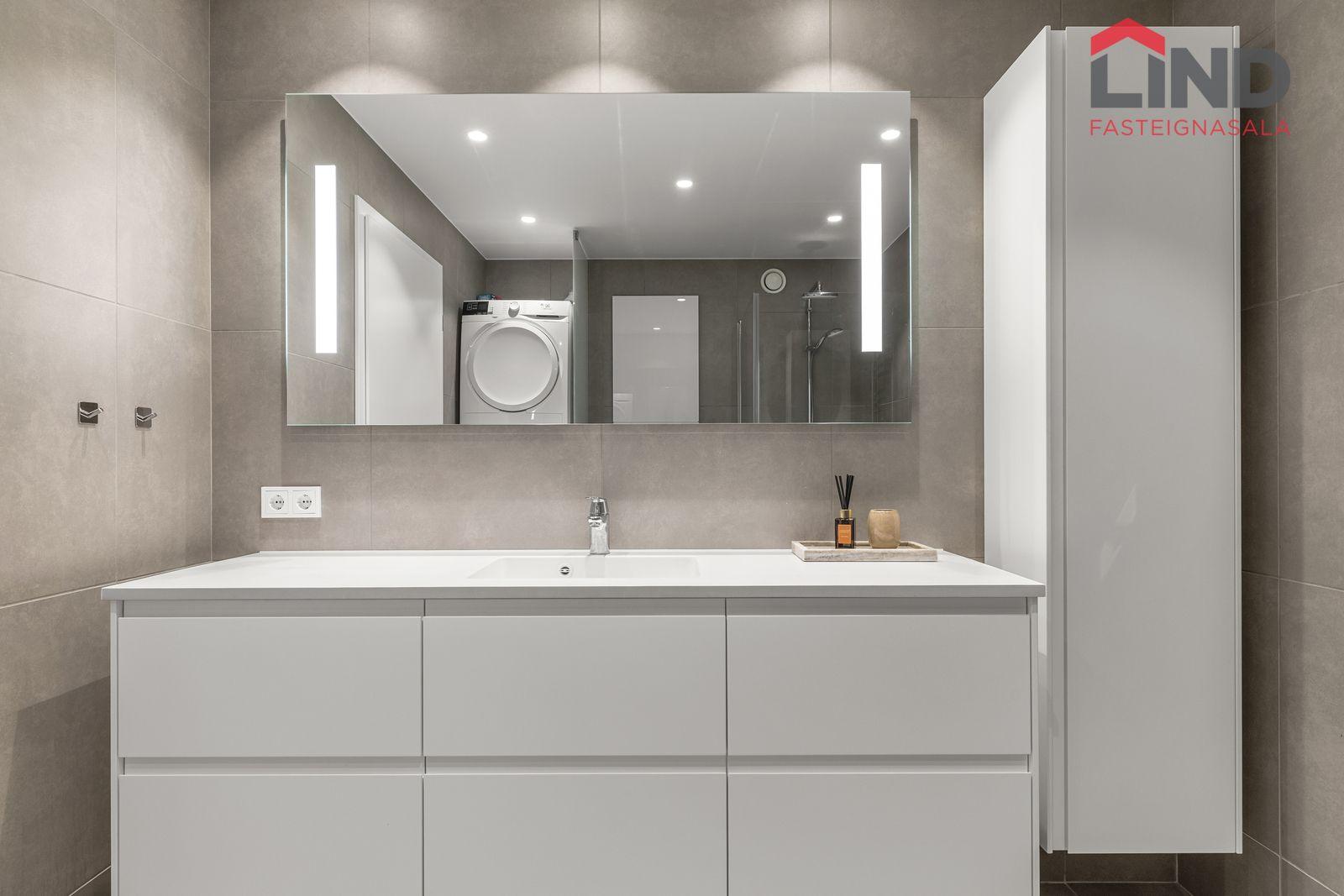 Baðherbergi: rúmgott, flísalagt hólf í gólf. Með hvítri upphengdri innréttingu með vaski og spegli með lýsingu fyrir ofan. Flísalögð sturta, handklæðaofn og upphengt salerni.