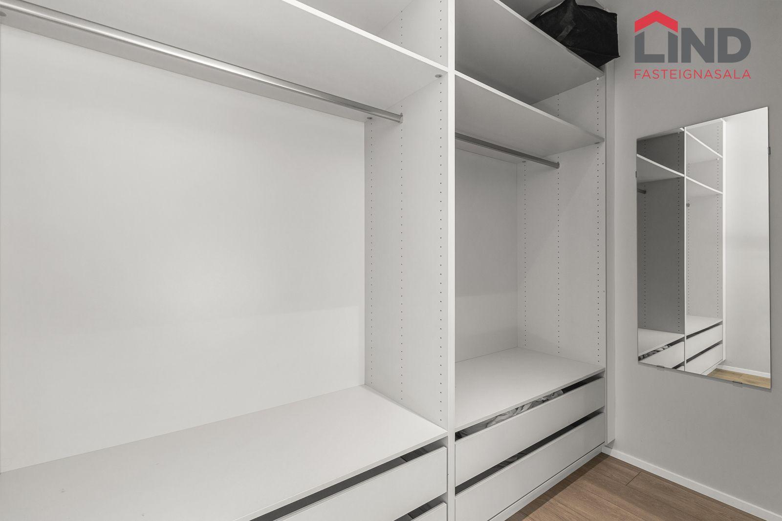 Hjónaherbergi: rúmgott með fataherbergi. Harðparket á gólfi.