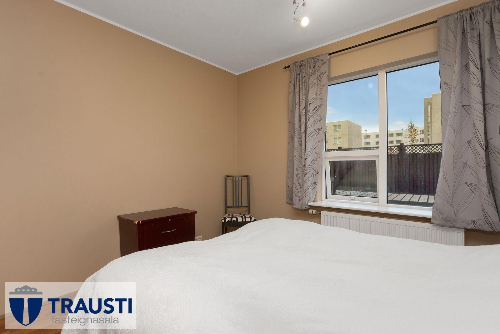 Nánari lýsing: Forstofa með parket á gólfi og góðan yfirhafnaskáp. Stofa/borðstofa er mjög rúmgóð með parket á gólfi. Útgengt á stóran sólarpall til suðurs. Eldhús með snyrtilegri innréttingu, tengi fyrir uppþvottavél, viftu yfir helluborði og borðkrók. Hjónaherbergi er mög rúmgott með parket á gólfi og góðan fataskáp. Svefnherbergi II er rúmgott með parket á gólfi og fataskáp. Baðherbergi er flísalagt í hólf og gólf með innréttingu, upphengt salerni og baðkar með sturtu. Þvottahús og geymsla eru hlið við hlið innan íbúðar.