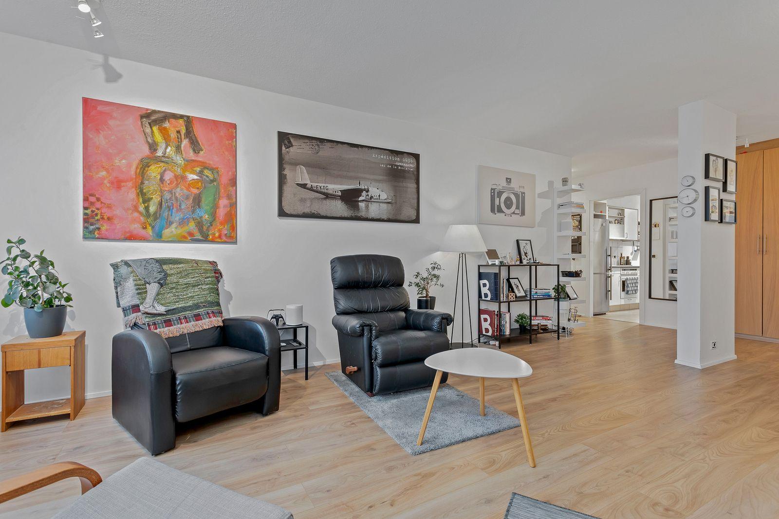 Stofan er rúmgóð með útsýni og svölum til suðurs. Stofan er með harðparketi á gólfi.