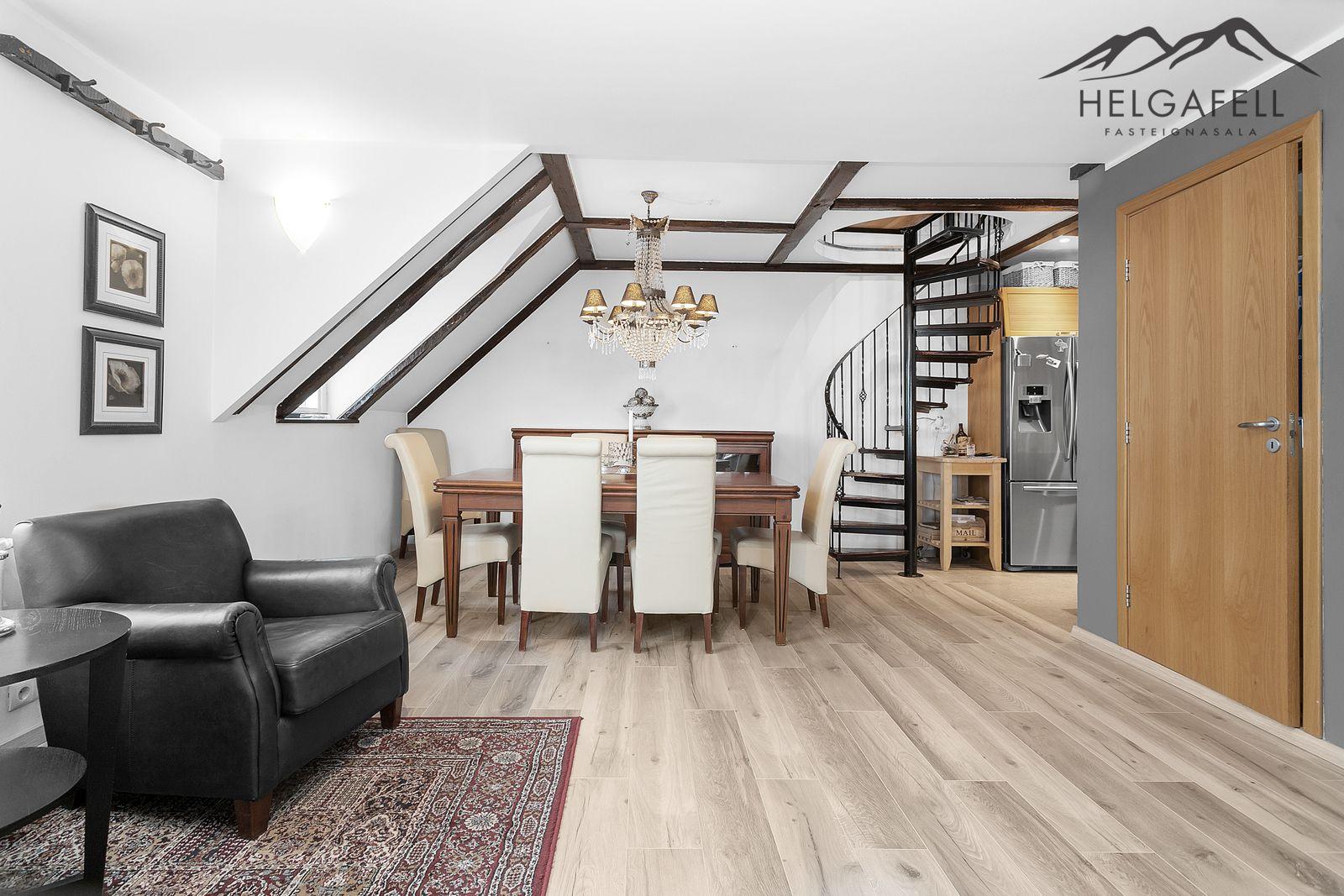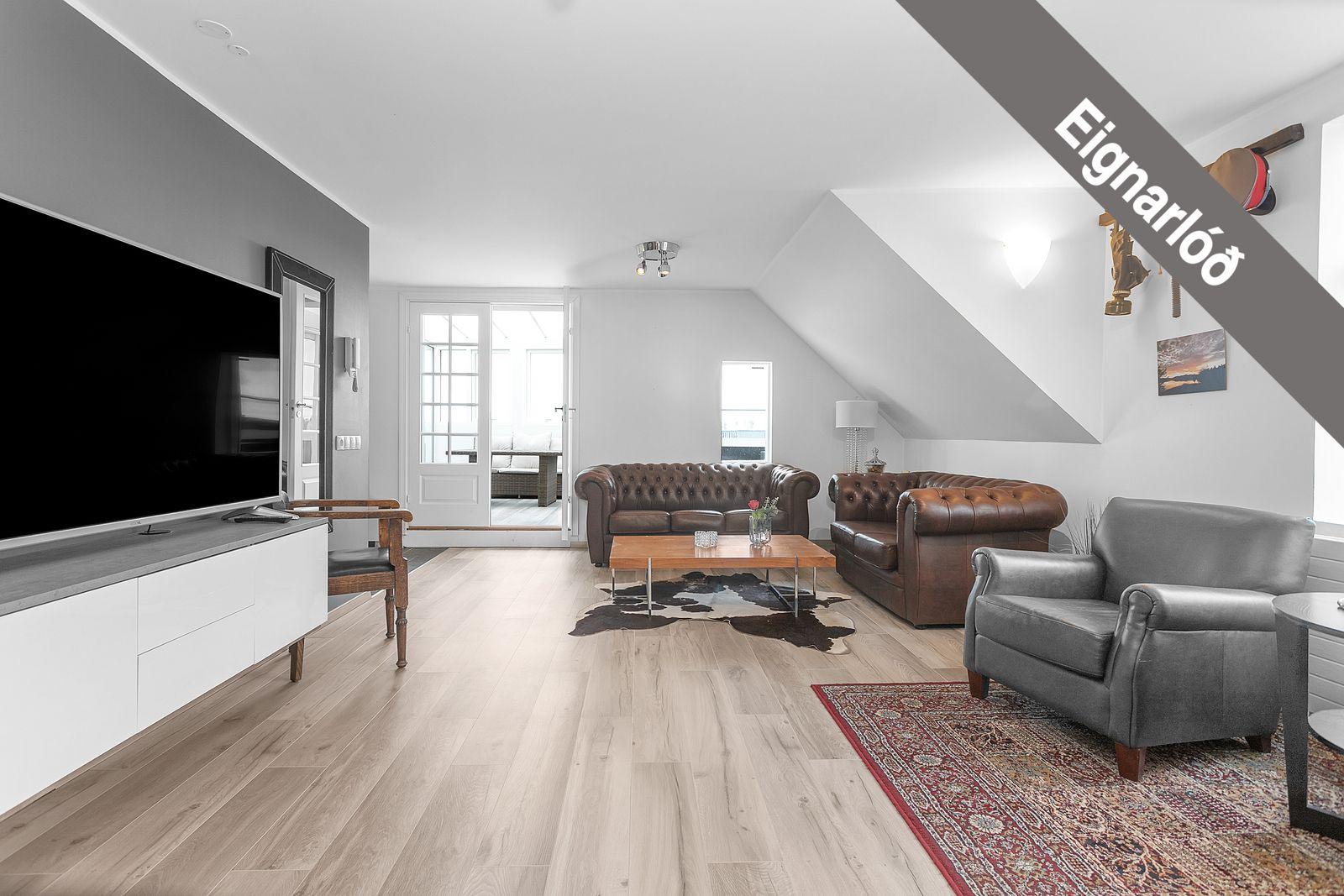 A stunning top-floor apartment with an attic and approximately 60 sqm rooftop terrace offering breathtaking views over downtown Reykjavík and Austurstræti.