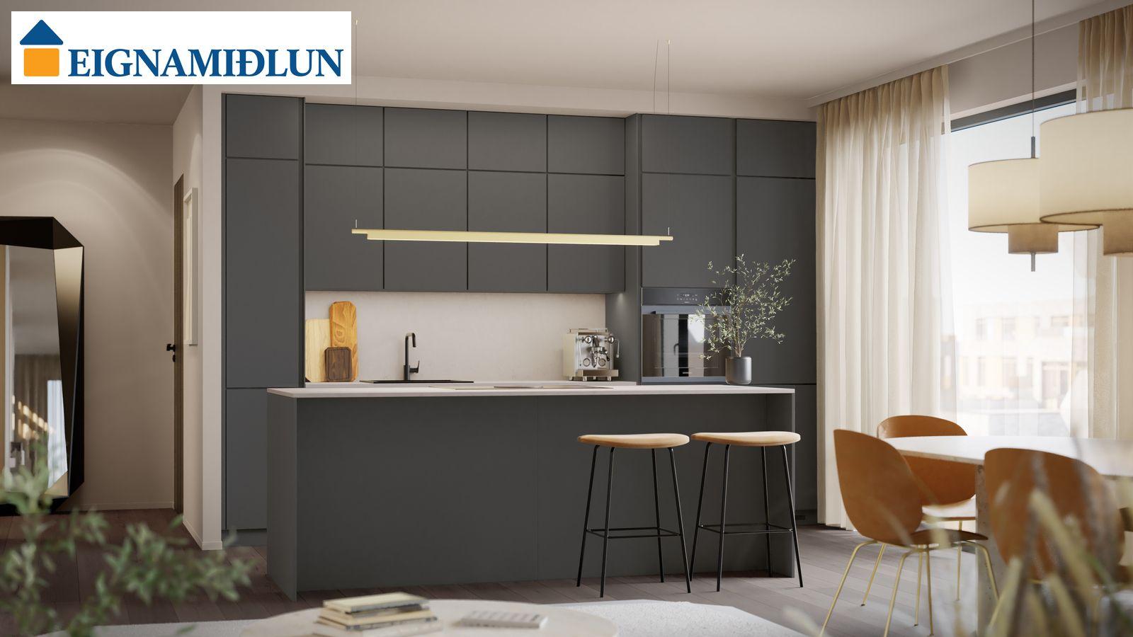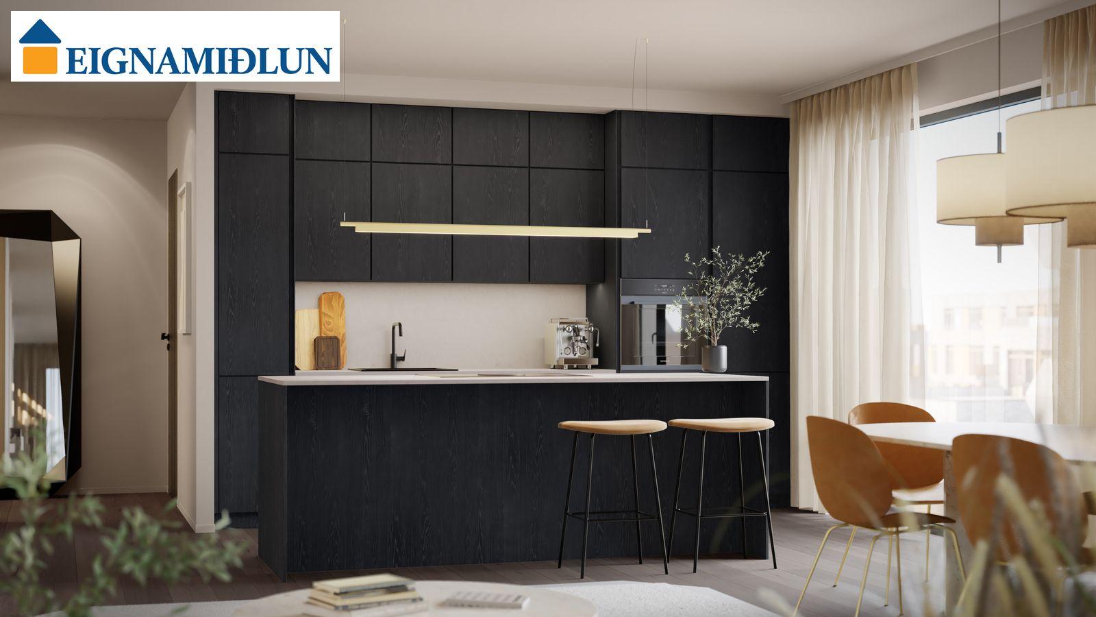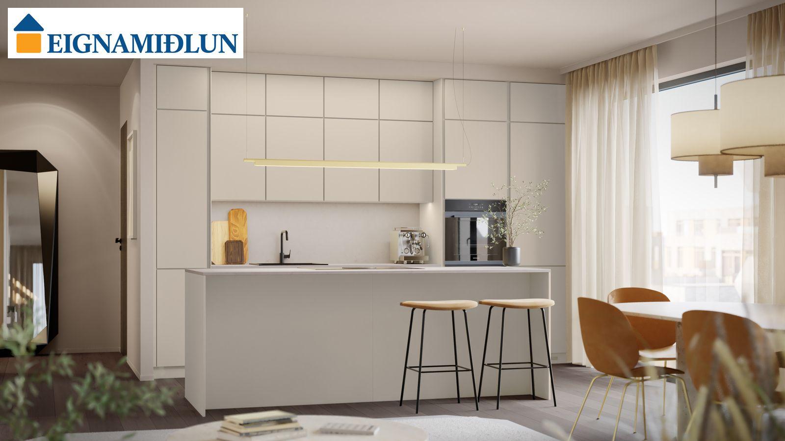 Innréttingaþema er Safír harmónía (500). Val þegar kemur að innréttingum og frágangi. Fimm innréttingaþemu frá Nobilia (Lser). Steinn á borðum. Vönduð eldhústæki frá Siemens, Elica og Bora.