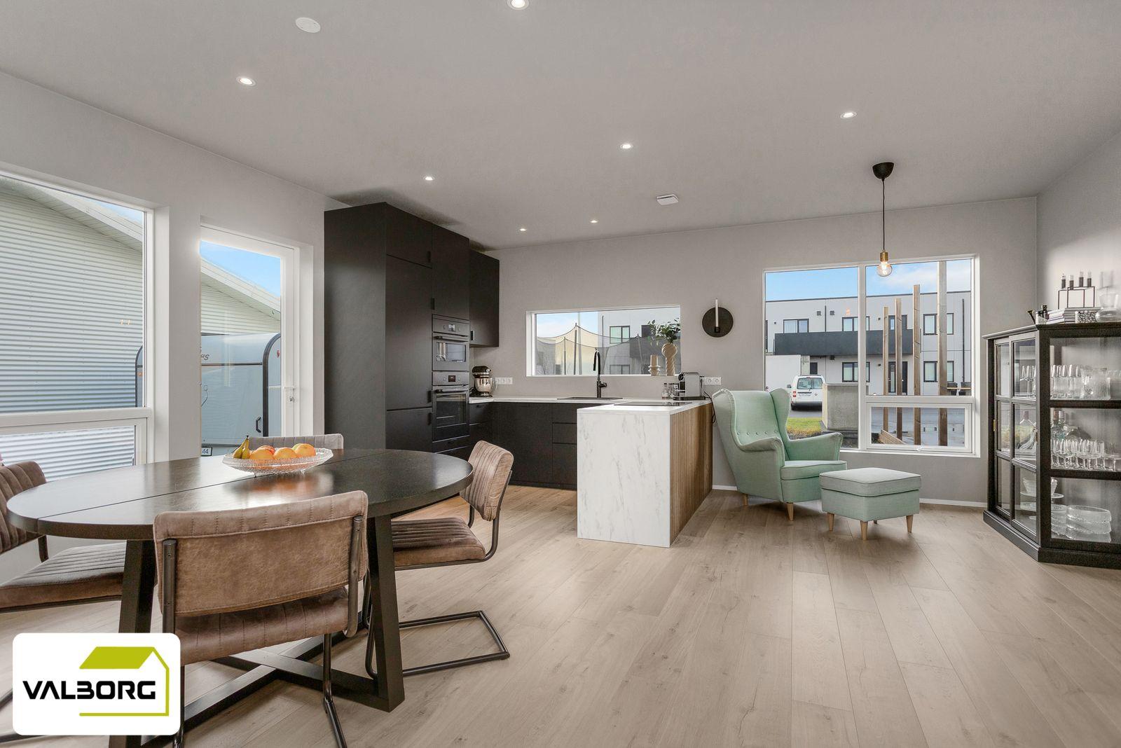 Eldhús er opið inní stofu. Gott skúffupláss er í innréttingu, bakarofn í vinnuhæð, helluborð, innbyggð uppþvottavél og innbyggður ísskápur.