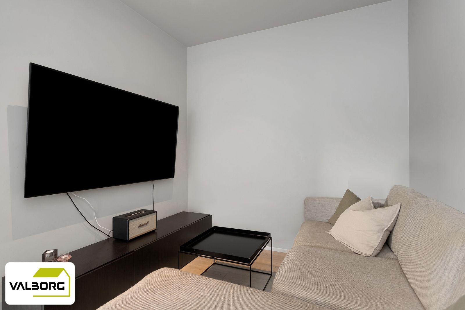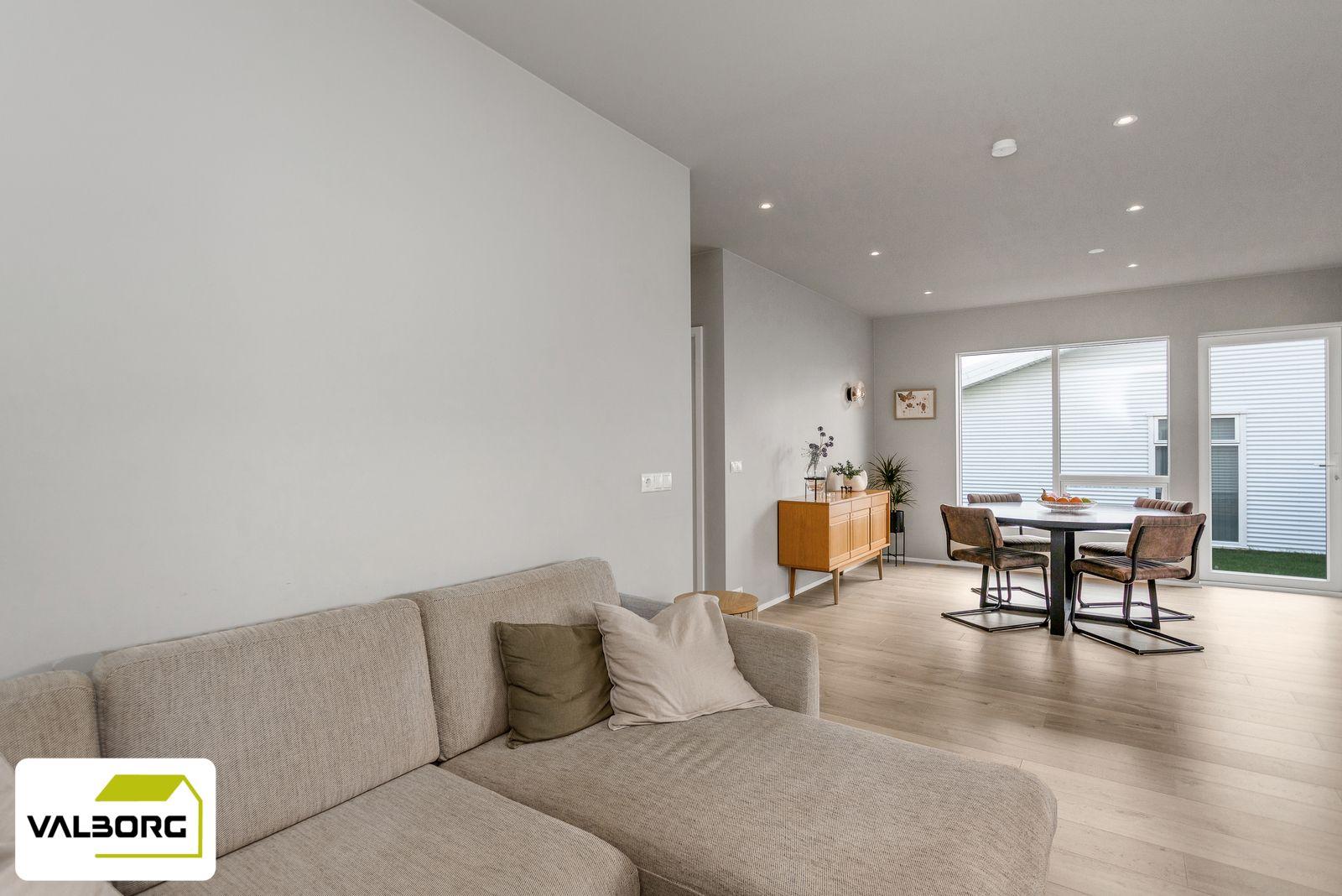 Stofa eldhús, stofa og sjónvarpshol eru saman í opnu rými. Frá stofu er útgengt á lóð.