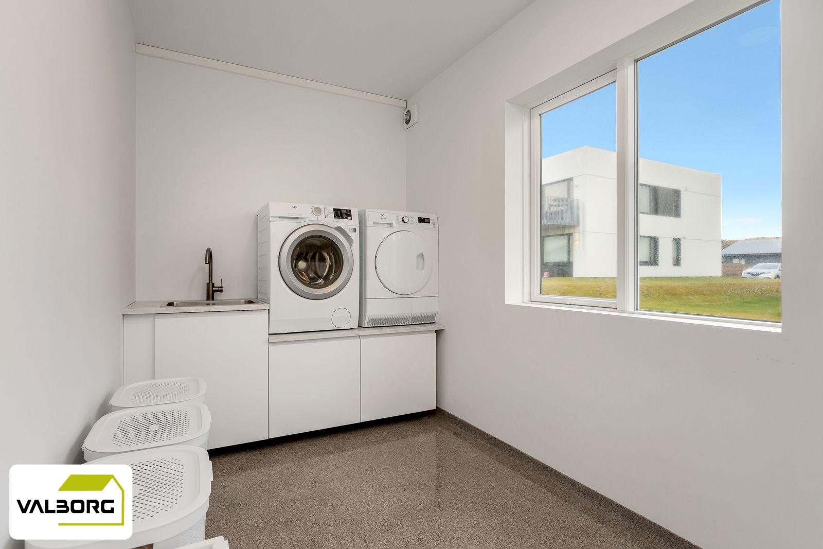 Þvottahús er inn af bílskúr með útgengt á baklóð. Innrétting með skúffum og skolvaski. Pláss fyrir þvottavél og þurkara. Epoxý á gólfi.