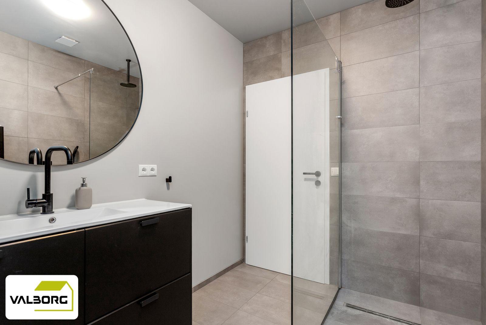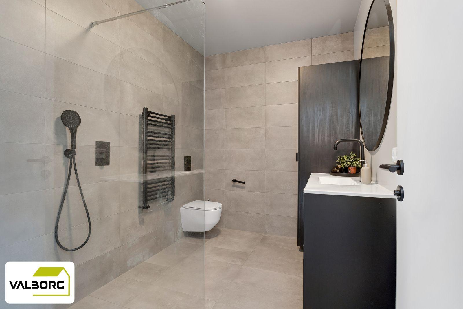 Baðherbergi er flísalagt, vegghengt wc, "walk-in sturta", innrétting með handlaug og góðu skápaplássi, handklæðaofn. Vélrænt útsog.
