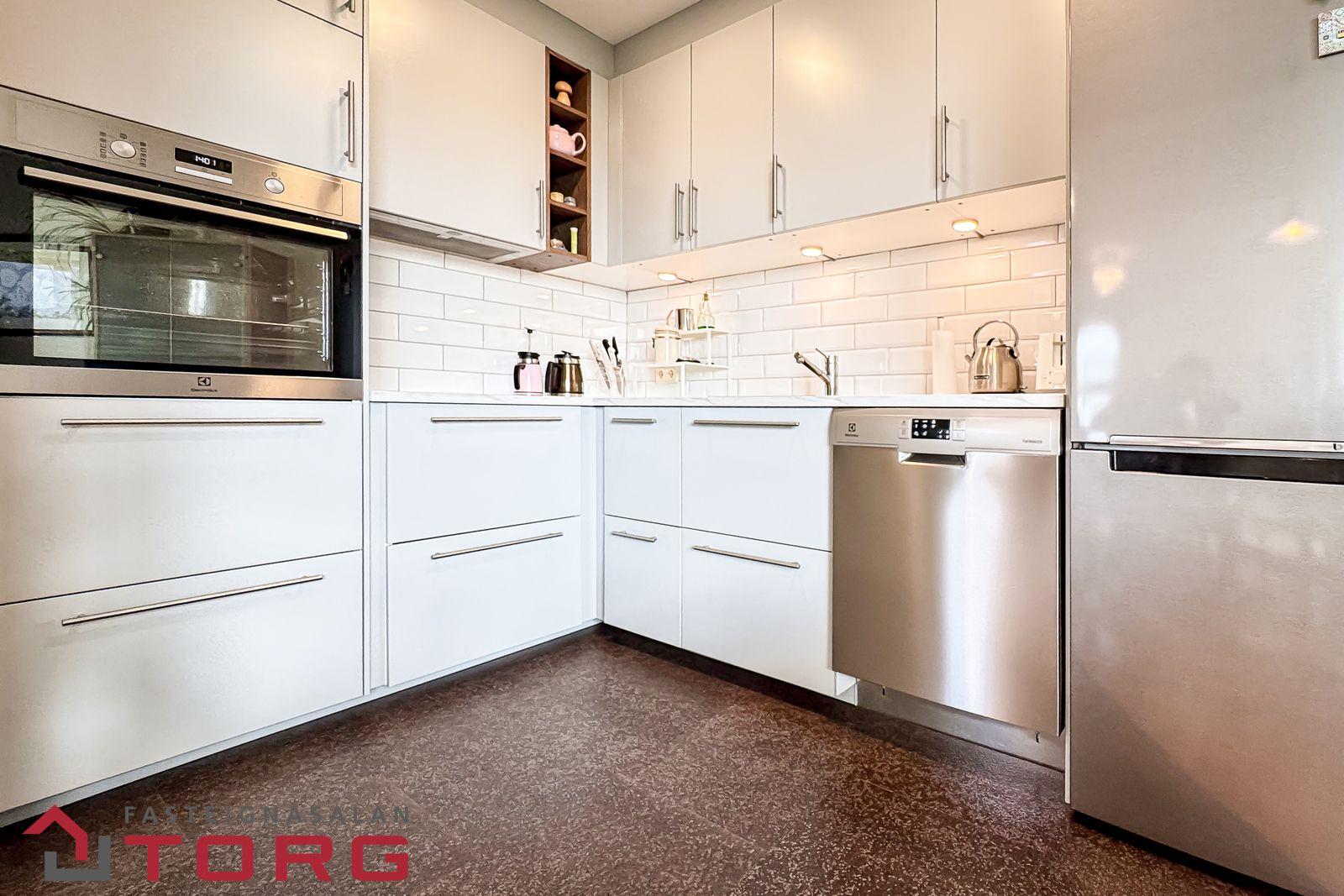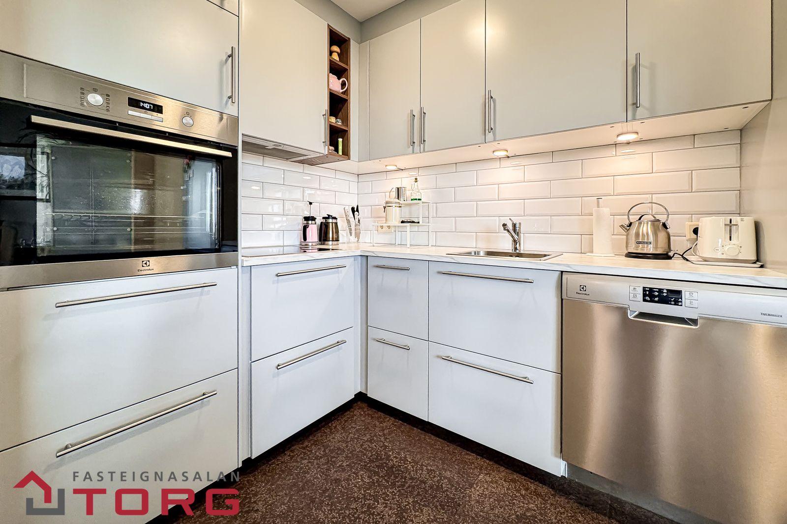 Eldhús er með nýlegri innréttingu og eldunartækjum. Gæða korkur á gólfi, eldunarofn í vinnuhæð og flísar milli skápa í innréttingu.