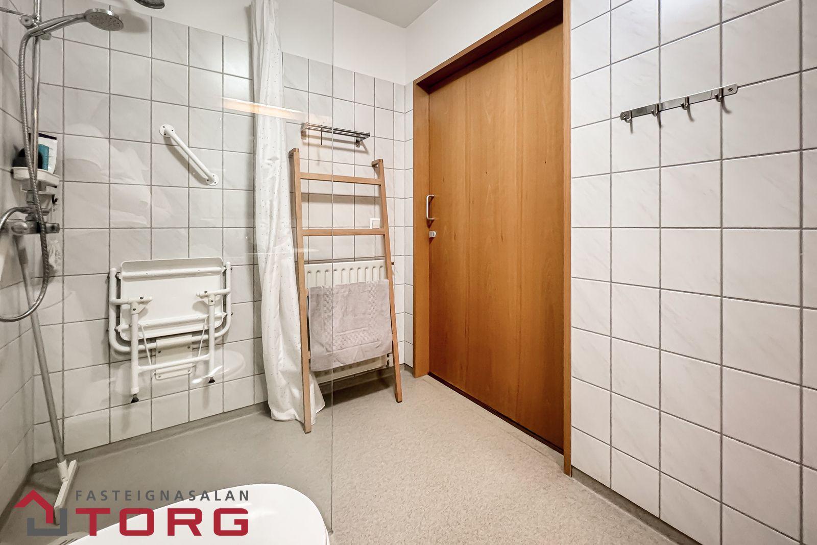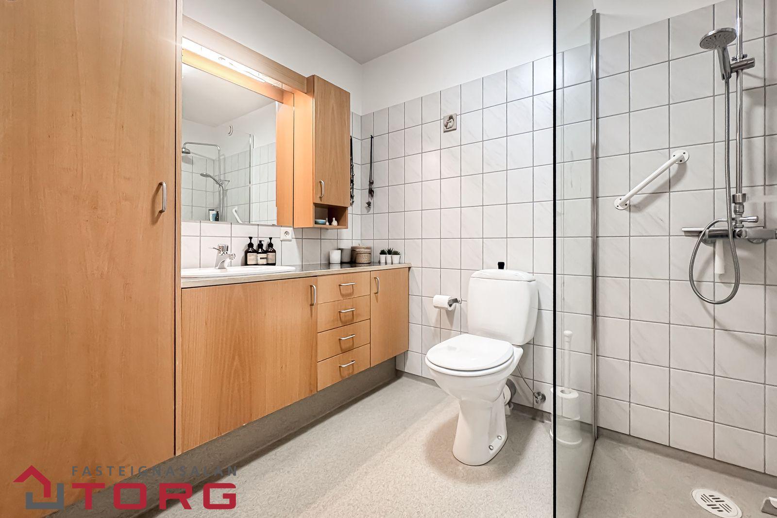 Baðherbergi með "walk in" sturtu, vandaðri innréttingu með góðu skápaplássi, dúkur á gólfum og flísar á veggjum.