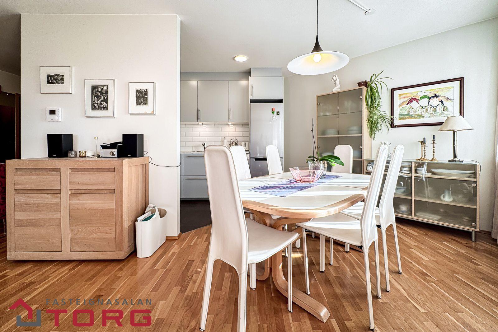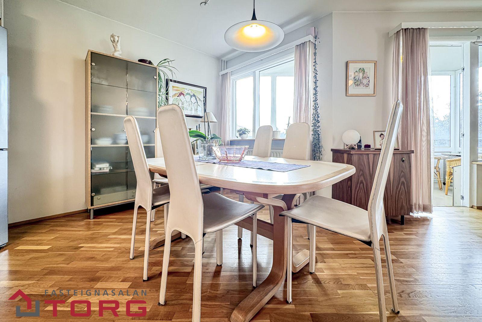 Borðstofa er björt og með viðarparketi á gólfi.