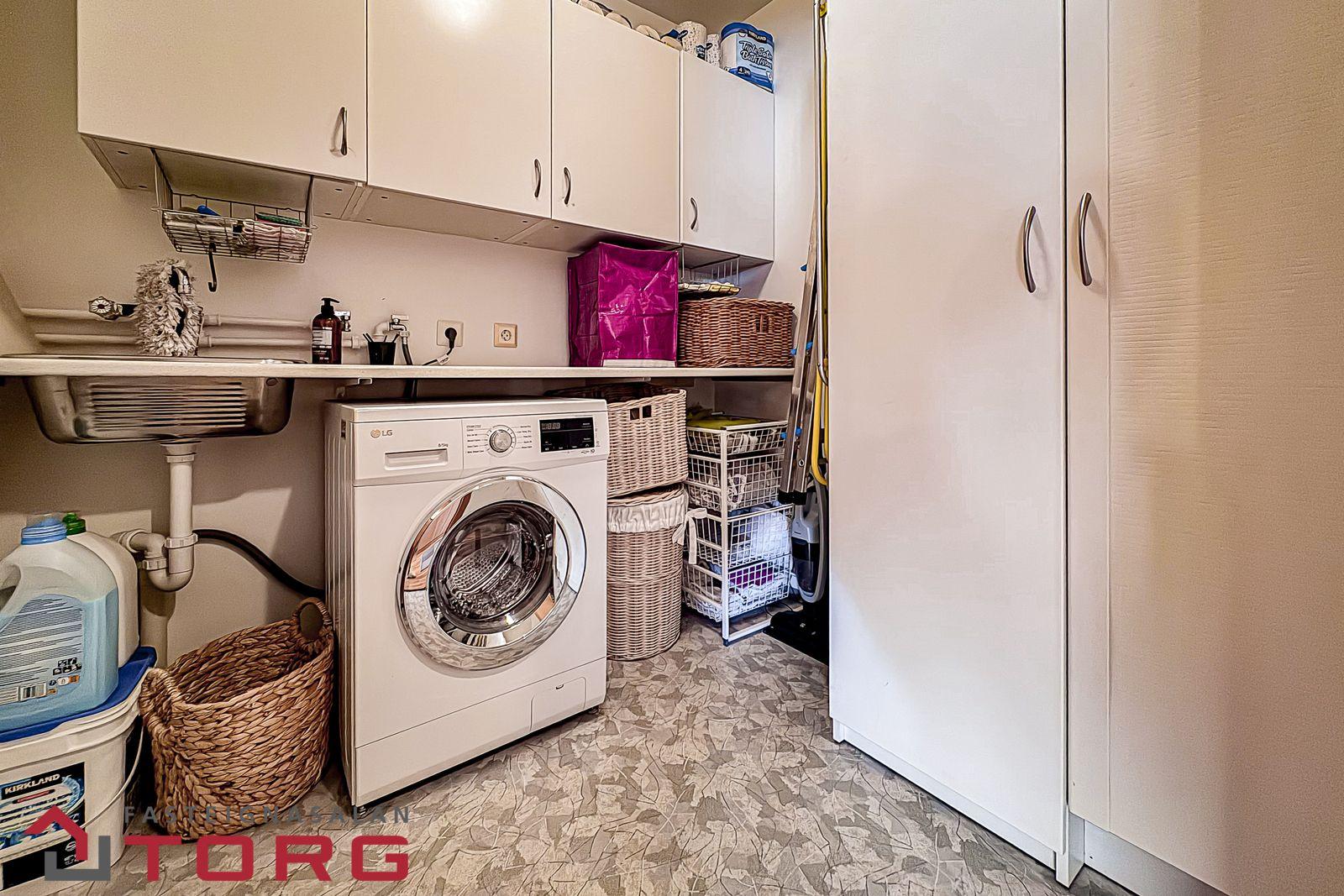 Þvottahús innan íbúðar með góðum vaski, góðum skápum og innréttingu.