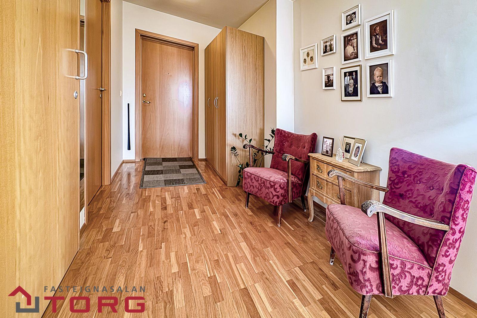 Forstofa er með vönduðum fataskáp og viðarparketi á gólfi.