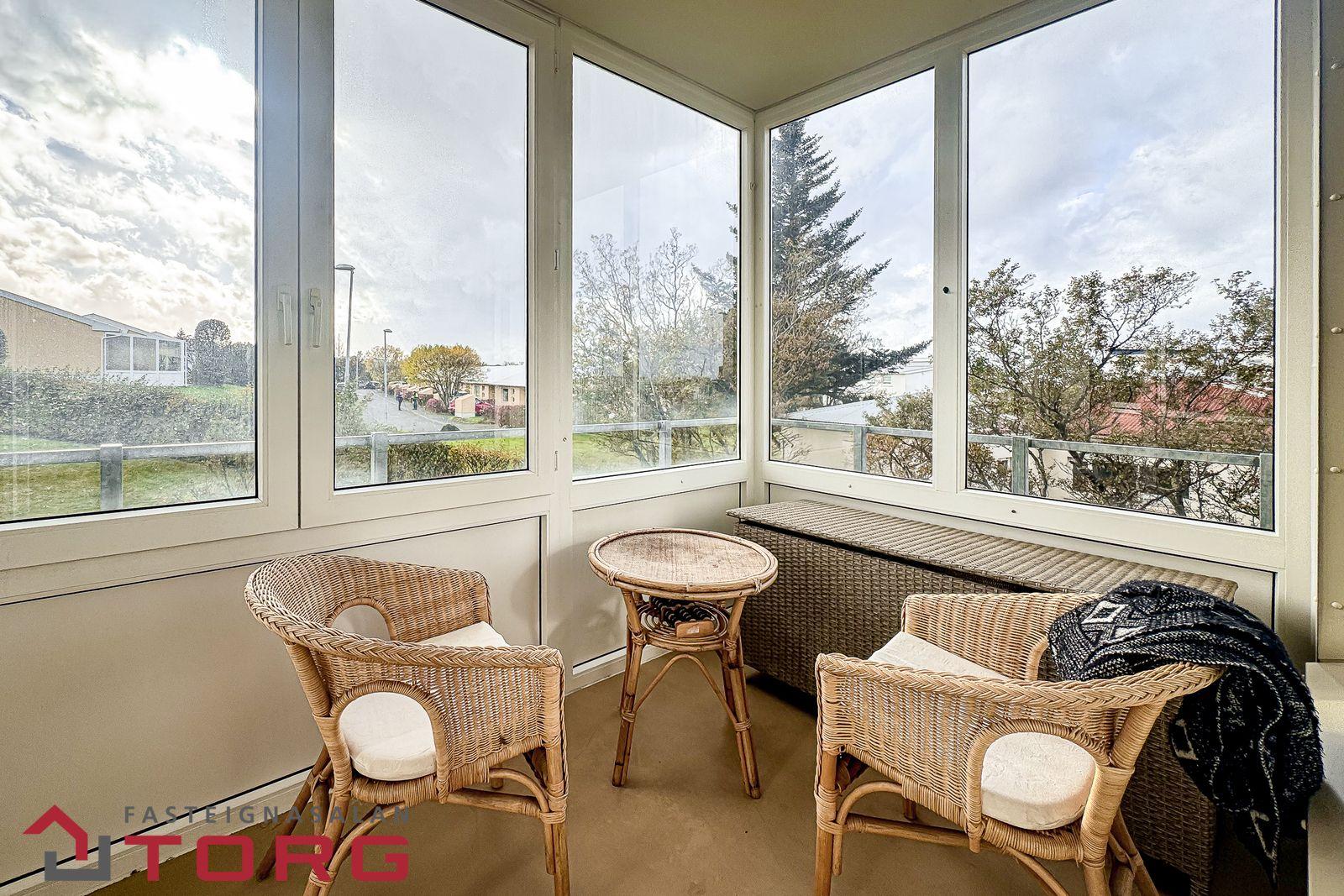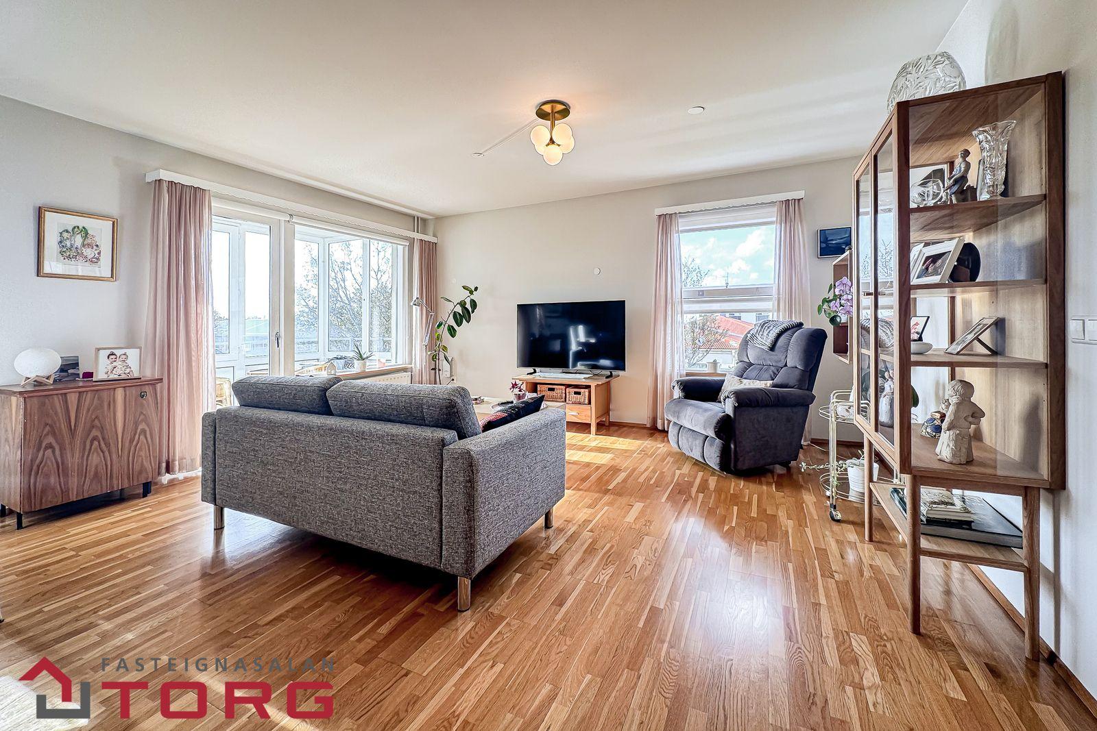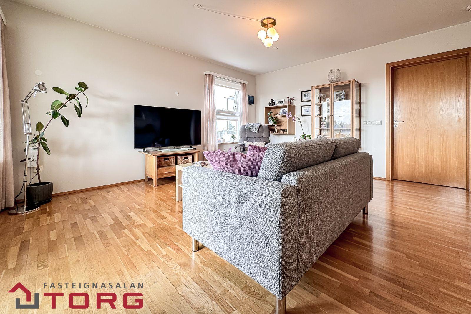 Stofa er rúmgóð og björt með glugga á tvo vegu, þar sem útgengi er á svalir með svalalokun. Viðarparket á gólfi.