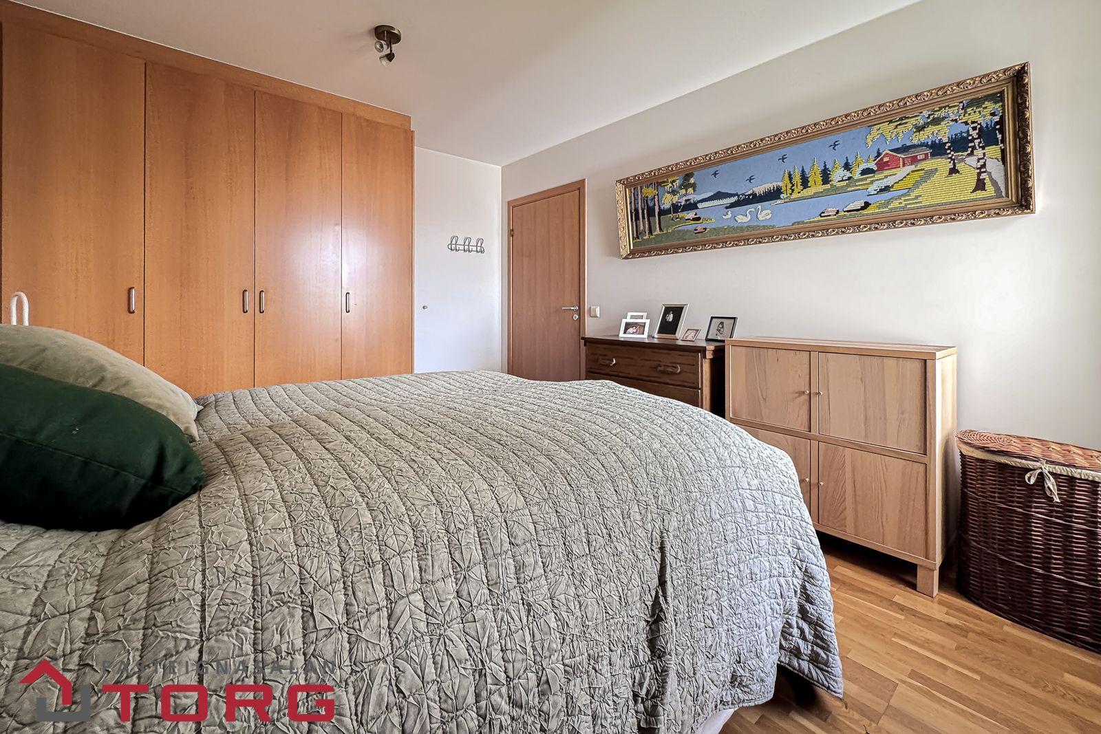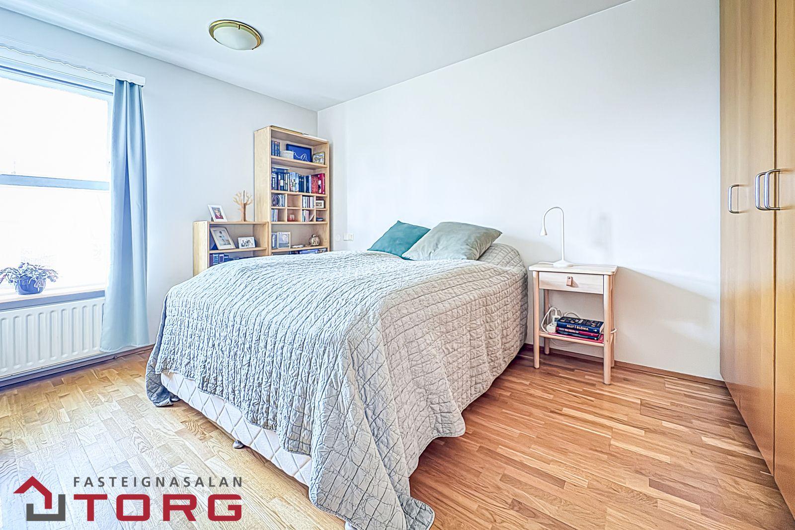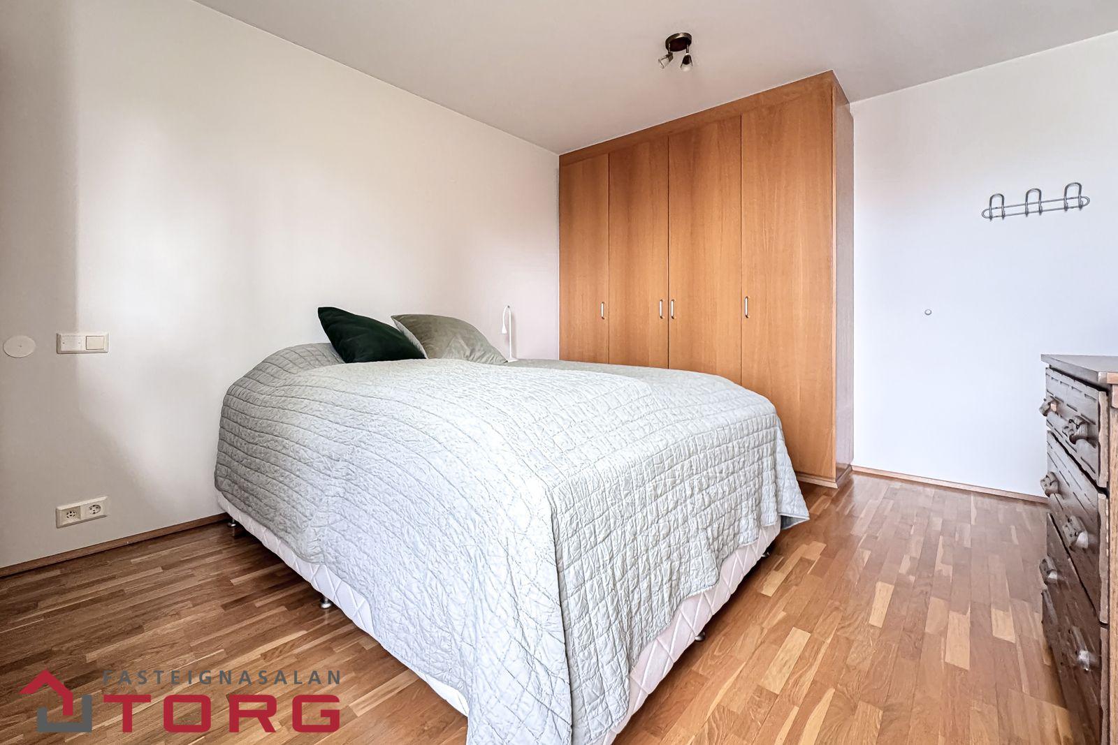 Svefnherbergi er með vönduðum fataskáp. Viðarparket á gólfi.