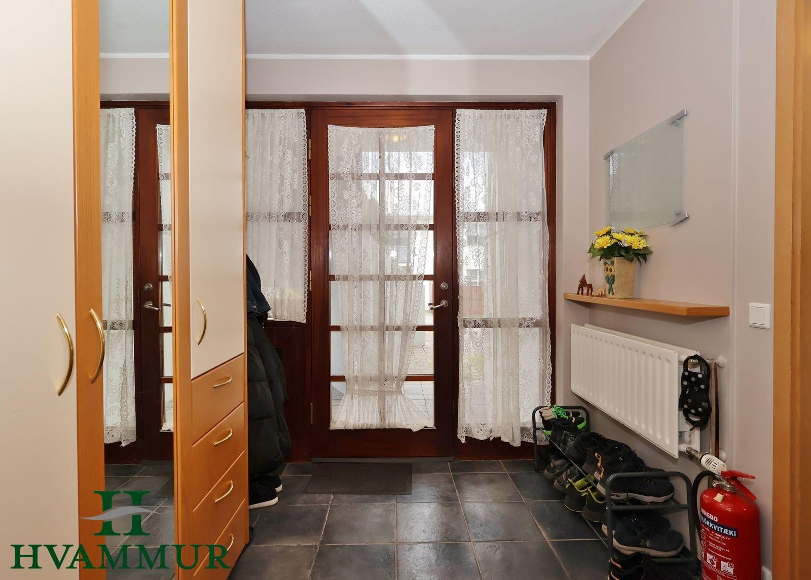 Stofa er björt og með ljósu parketi á gólfi. Gengið er úr stofu til vesturs út á hellulagða verönd.