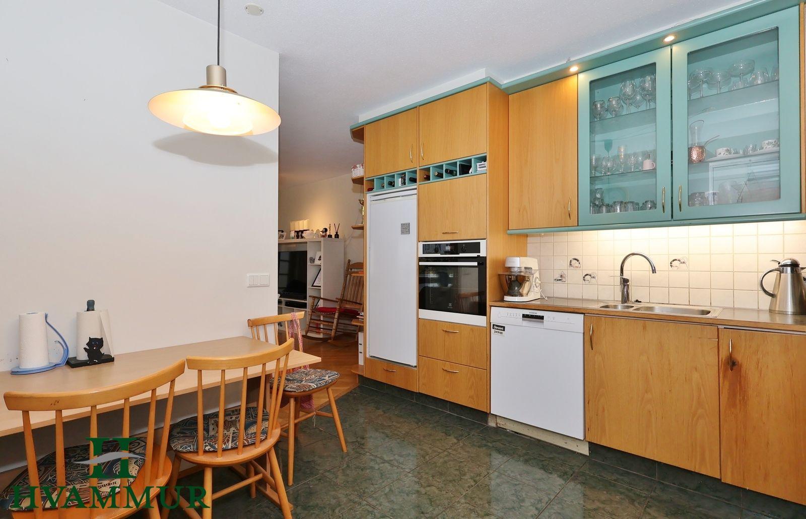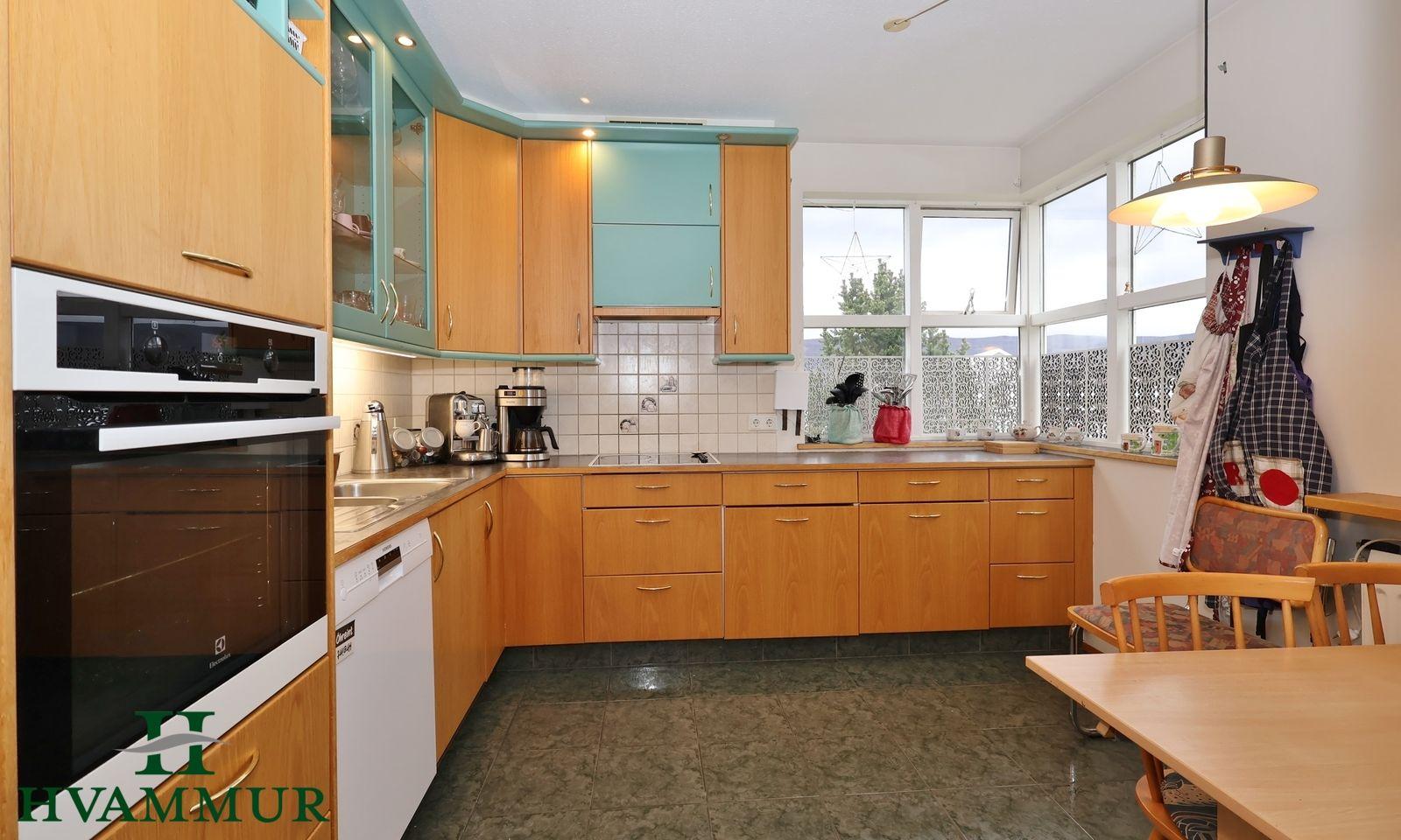Eldhús, tvílit innrétting, spónlögð og sprautulökkuð og með flísum á milli skápa. Stæði er í innréttingu fyrir uppþvottavél og ísskáp.