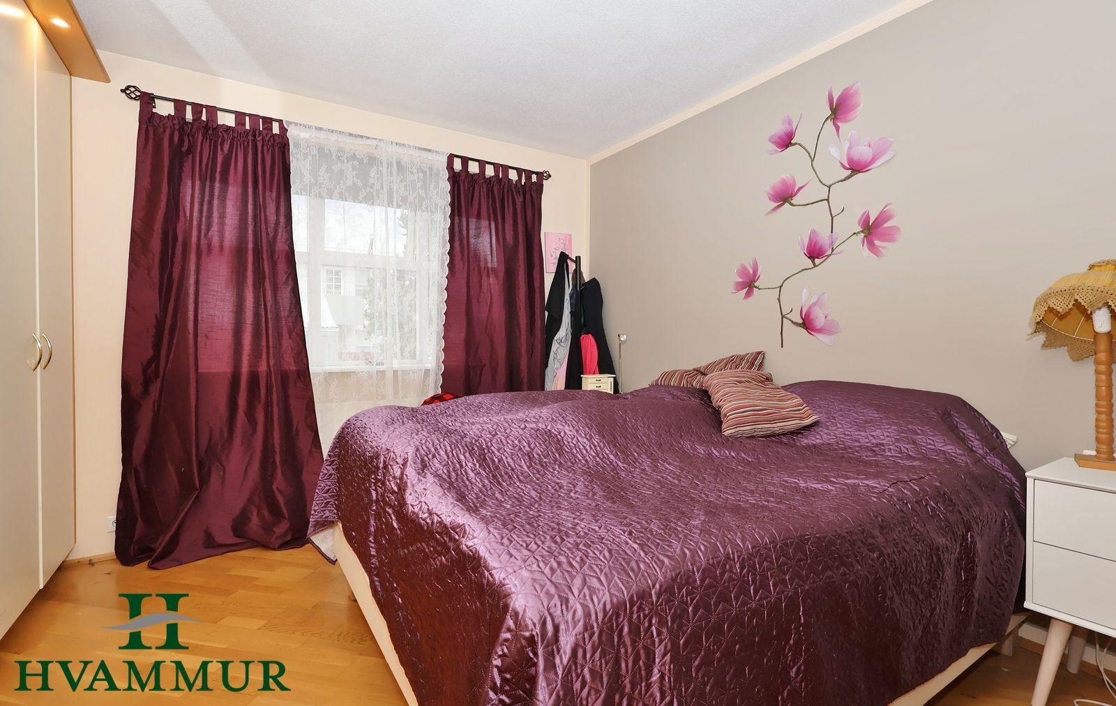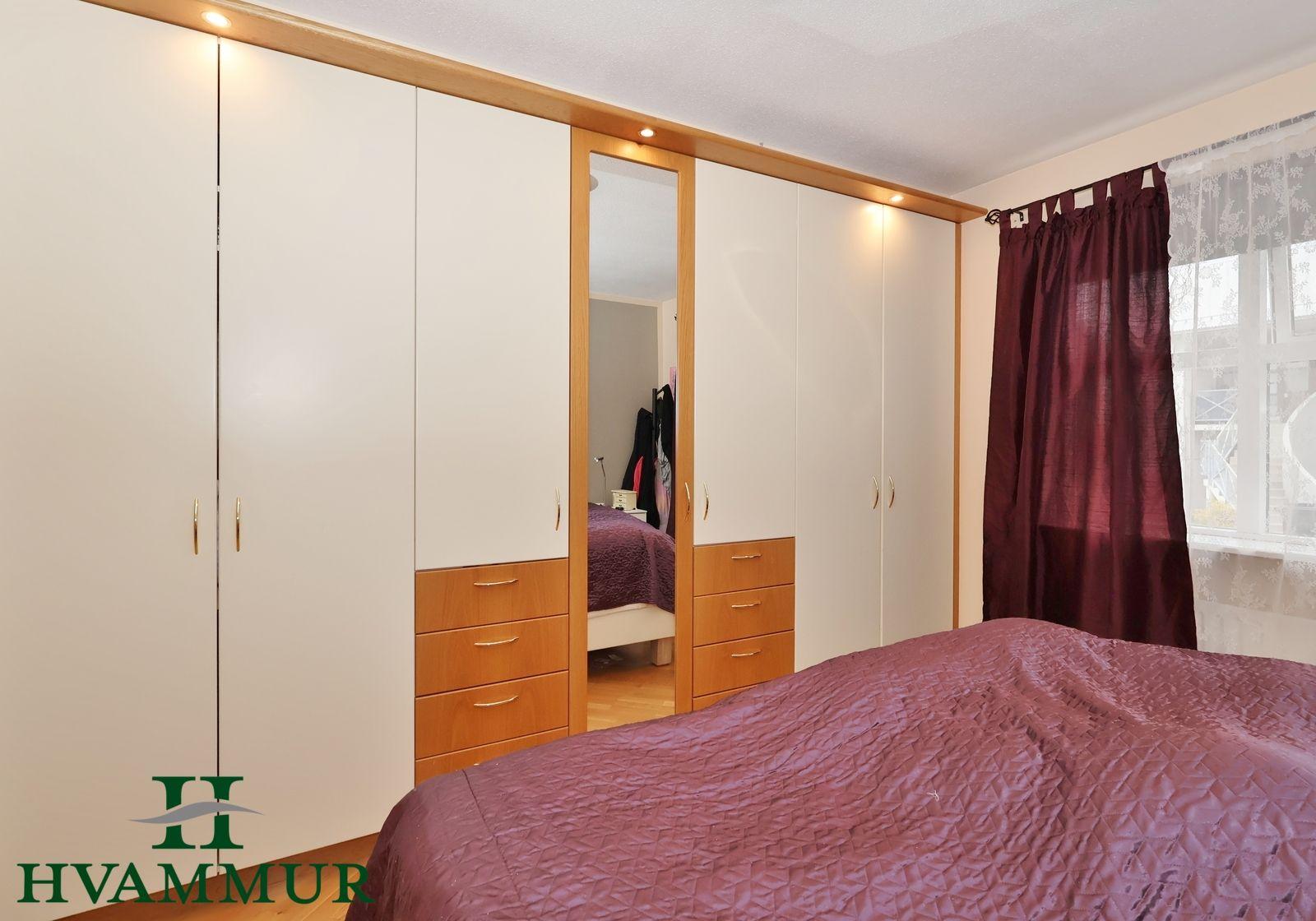 Svefnherbergin eru þrjú, öll með ljósu parketi parketi á gólfi og föstum fataskápum.