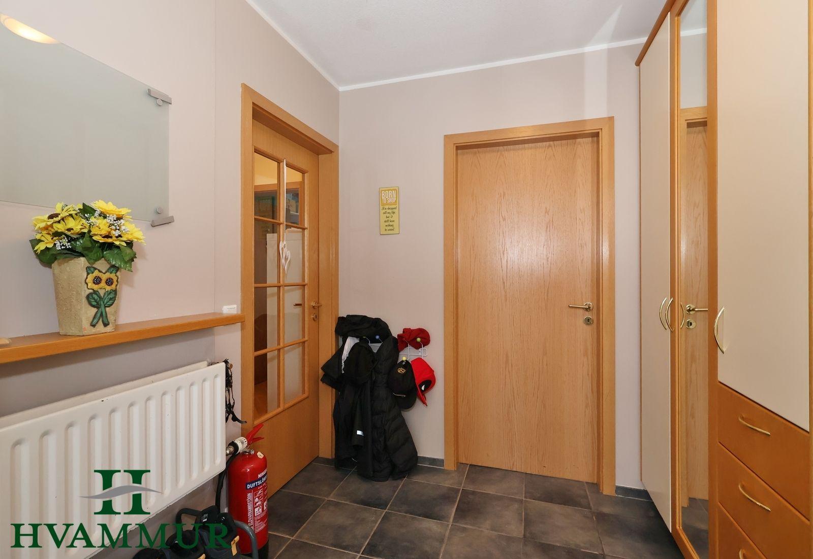 Forstofa er með flísum á gólfi og þreföldum skáp.