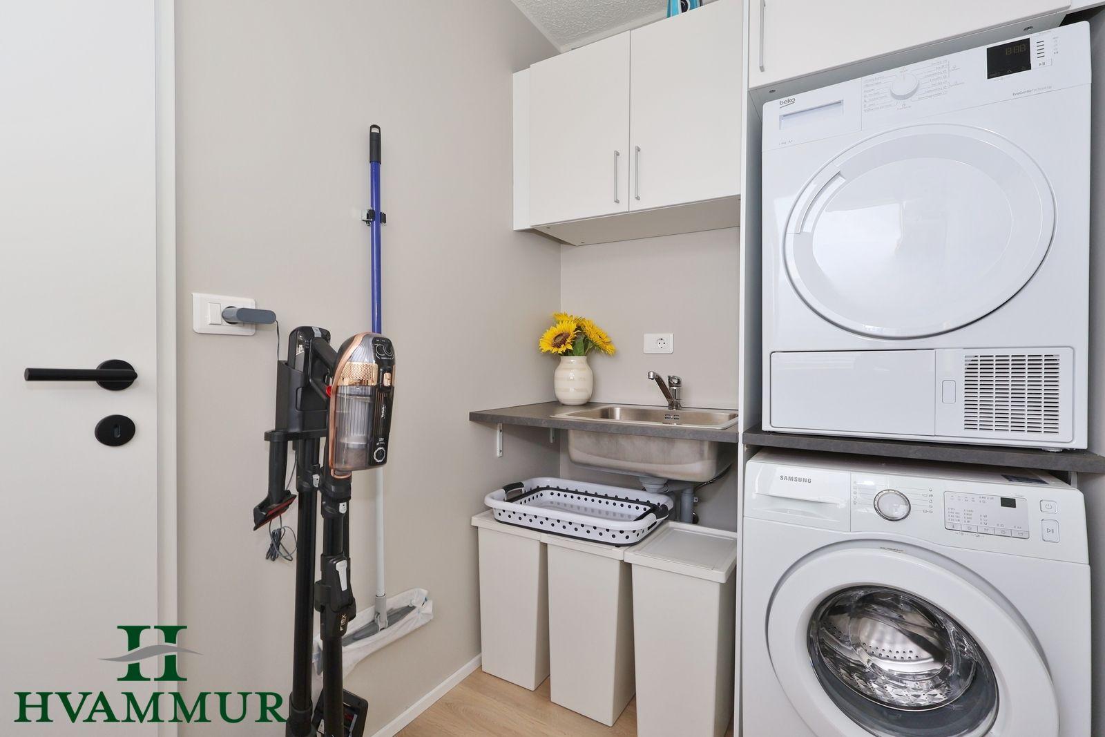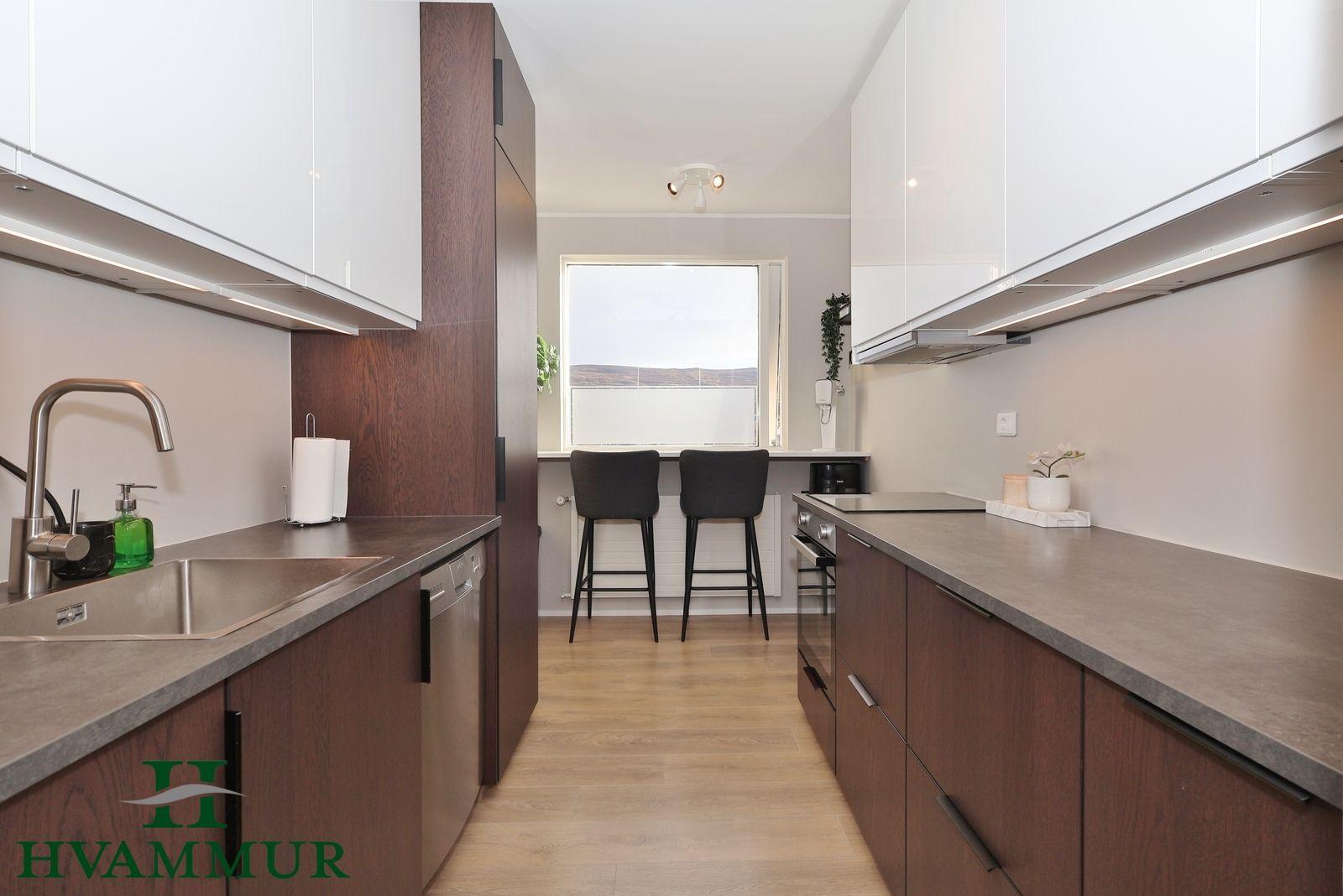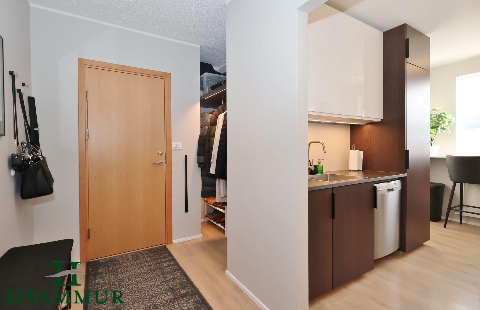 Eldhús falleg innrétting, dökkir neðri skápar, grá bekkplata og hvítir efri skápar. Ísskápur er innfelldur í innréttingu og fylgir með við sölu eignar. Úr eldhúsi er gengið inn í þvottahús.