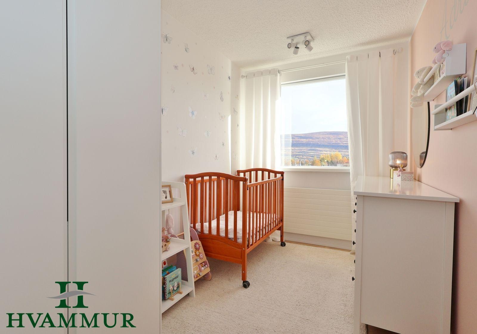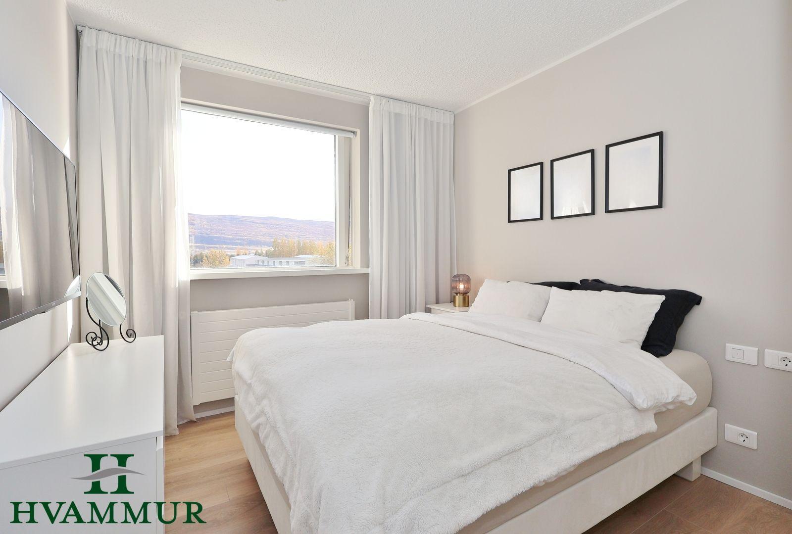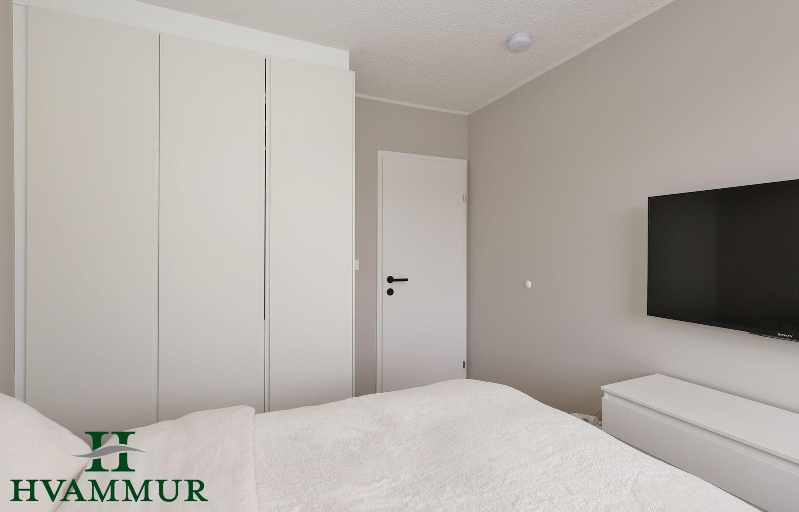 Svefnherbergin eru tvö, bæði með nýlegu harð parketi á gólfi og hvítum nýjum fataskápum.