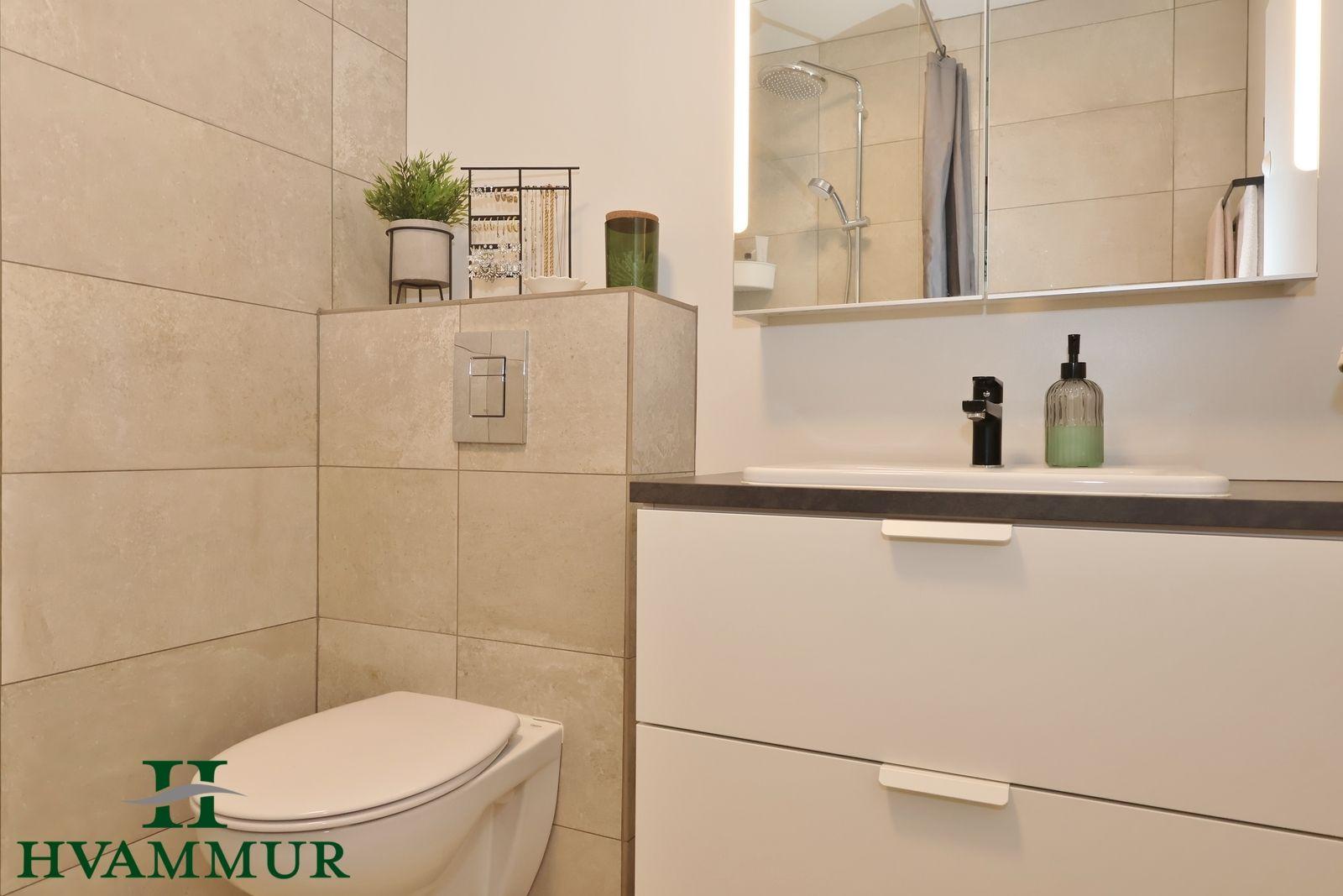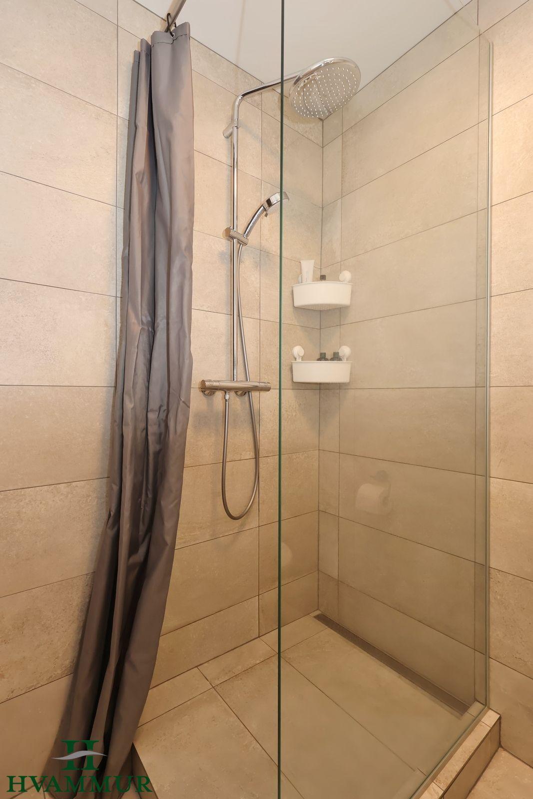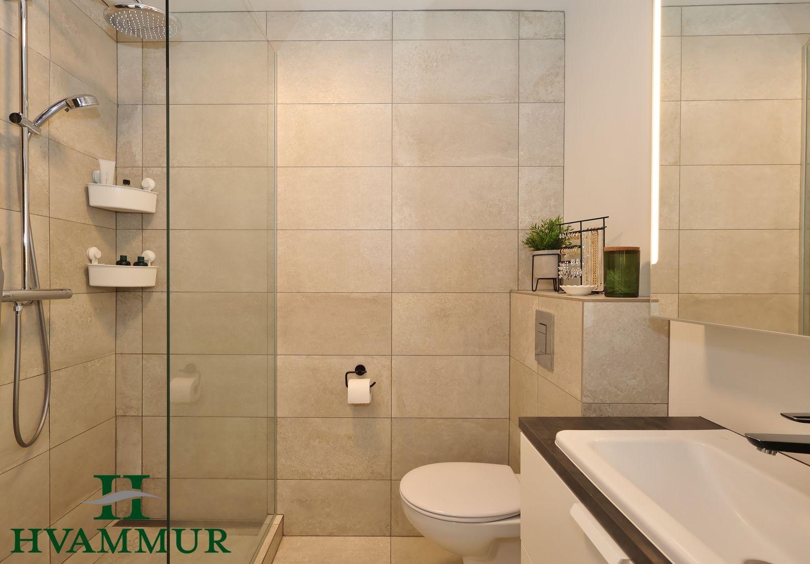 Baðherbergi hefur verið endurnýjað, flísar á gólfi og hluta veggja, hvít innrétting og speglaskápur, upphengt wc og sturta.