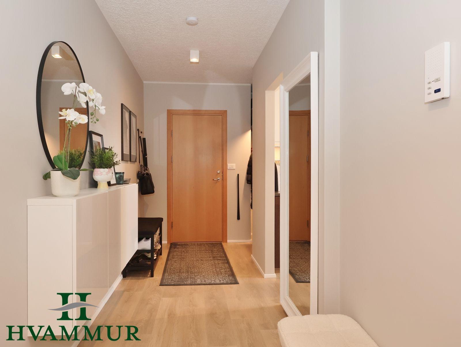 Forstofa og gangur eru með opnu hengi og nýlegu harð parketi á gólfi.