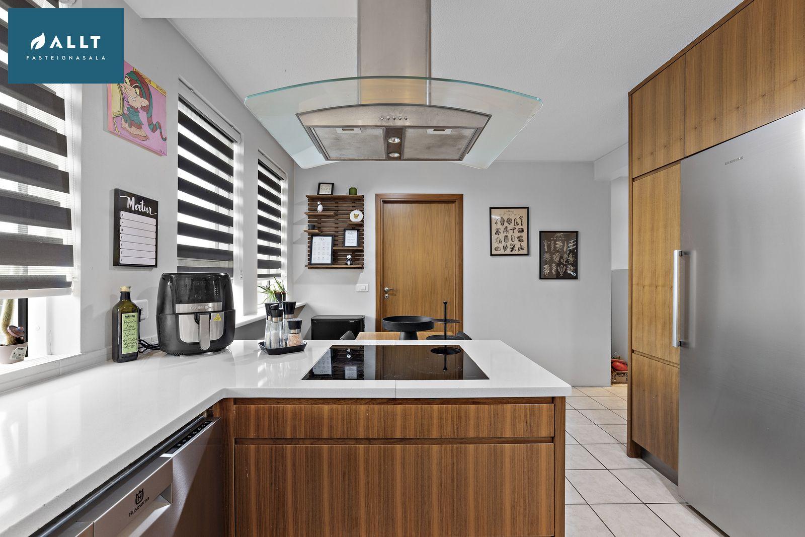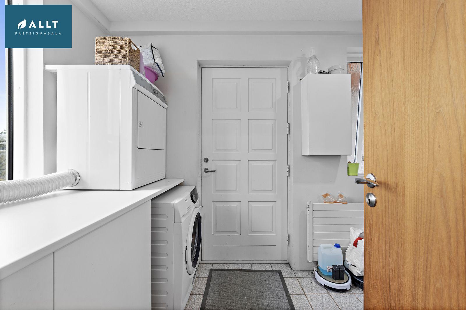 Þvottahús er inn af eldhúsi. Þar eru flísar á gólfi og innrétting með góðu skápaplássi.
