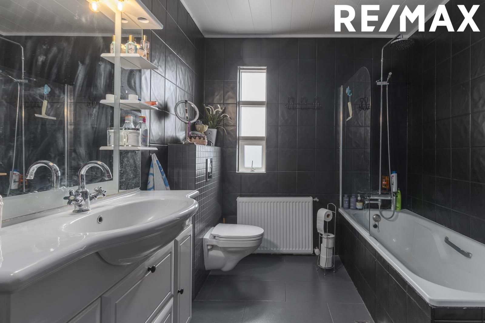 Baðherbergi: Flísalagt í hólf og gólf. Baðkar með sturtutæki. Upphengt salerni. Hvít innrétting með handlaug. Gluggi er í rýminu.