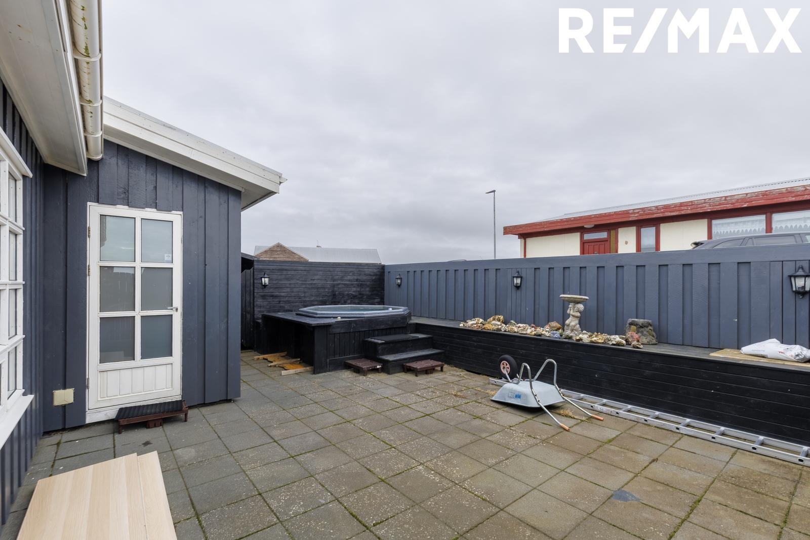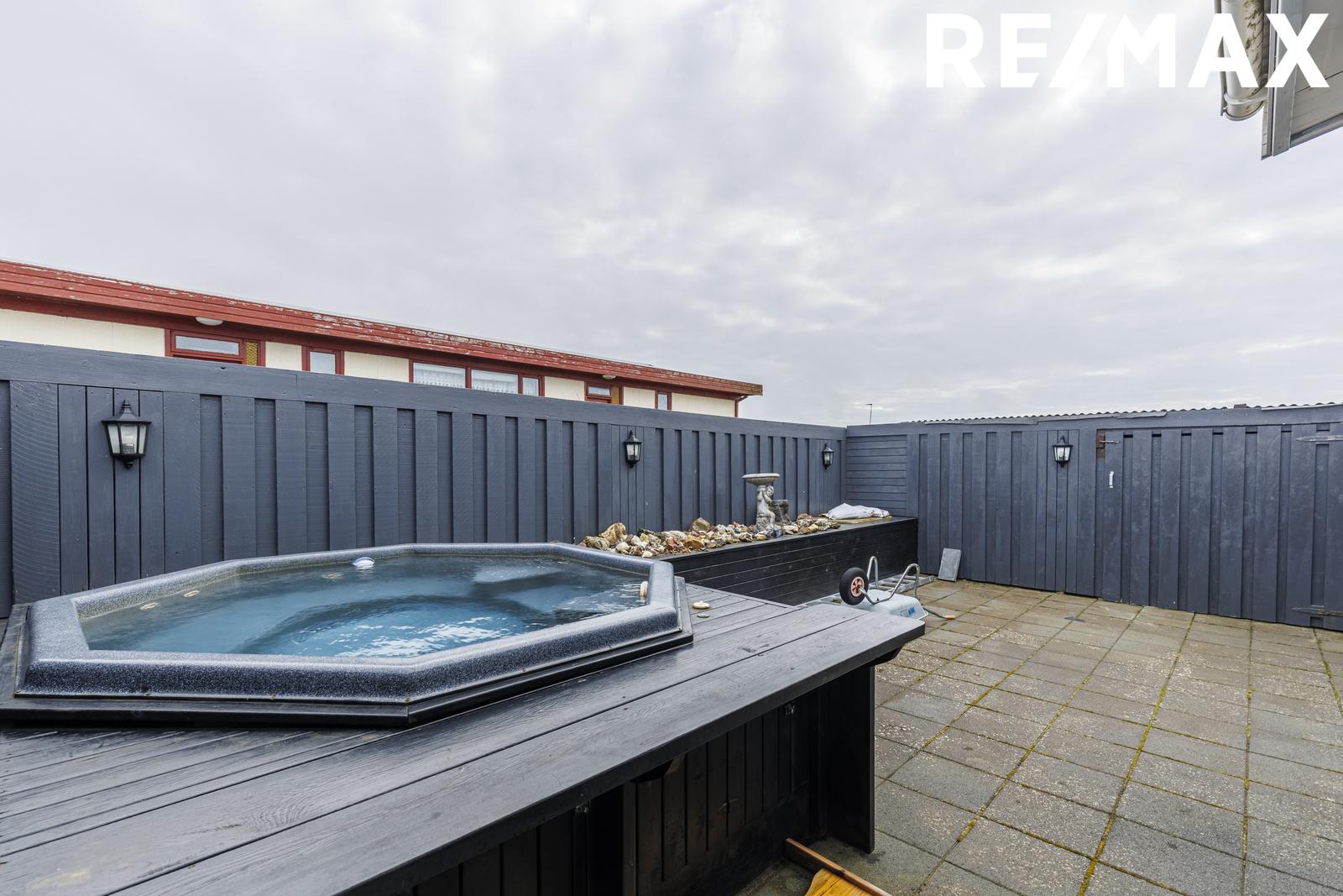 Lóðin: Tyrft lóð. Góður hellulagður pallur með góðum skjólveggjum og heitum potti. Góð útigeymsla við enda pallsins.