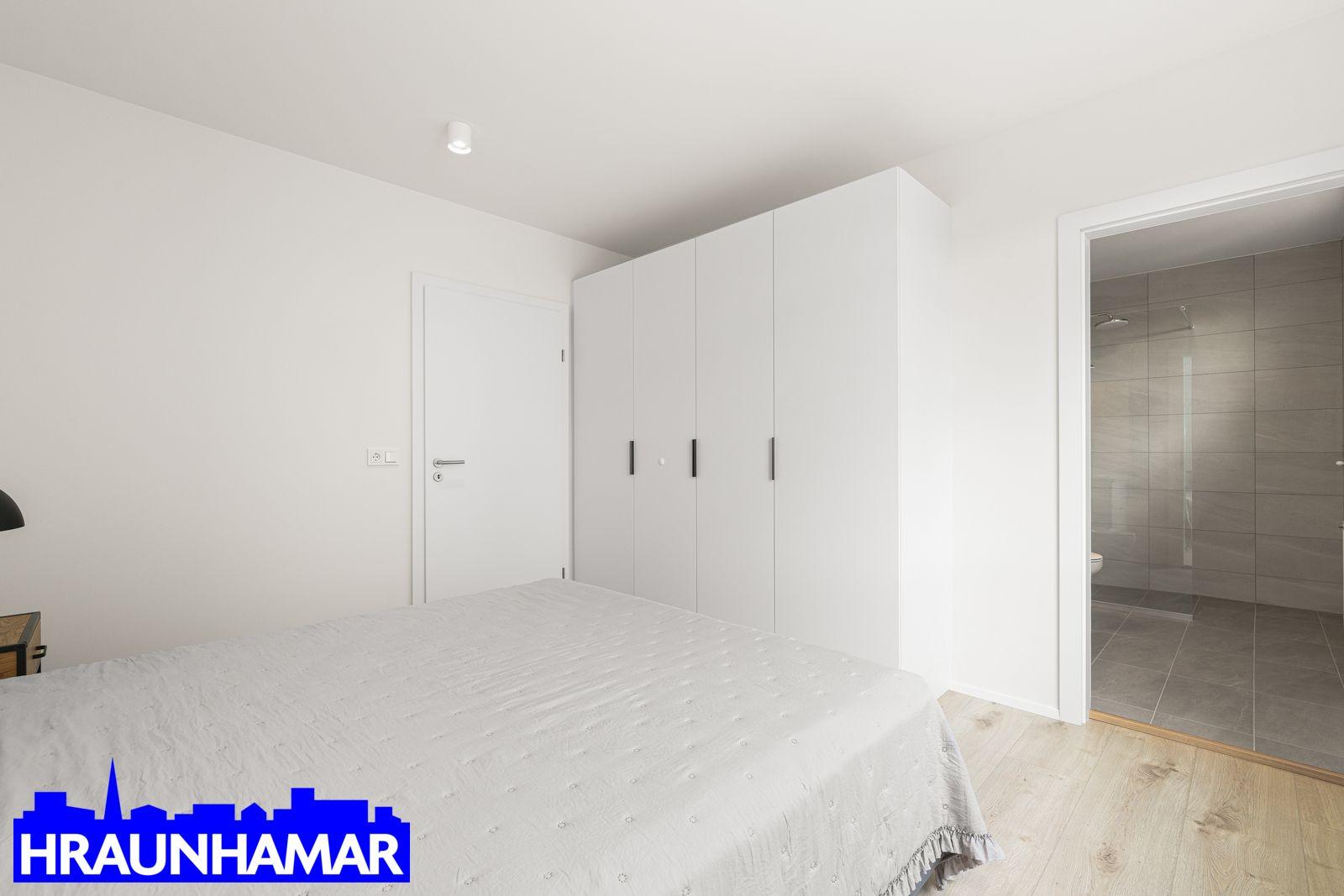 Rúmgott hjónaherbergi með fataskápum.