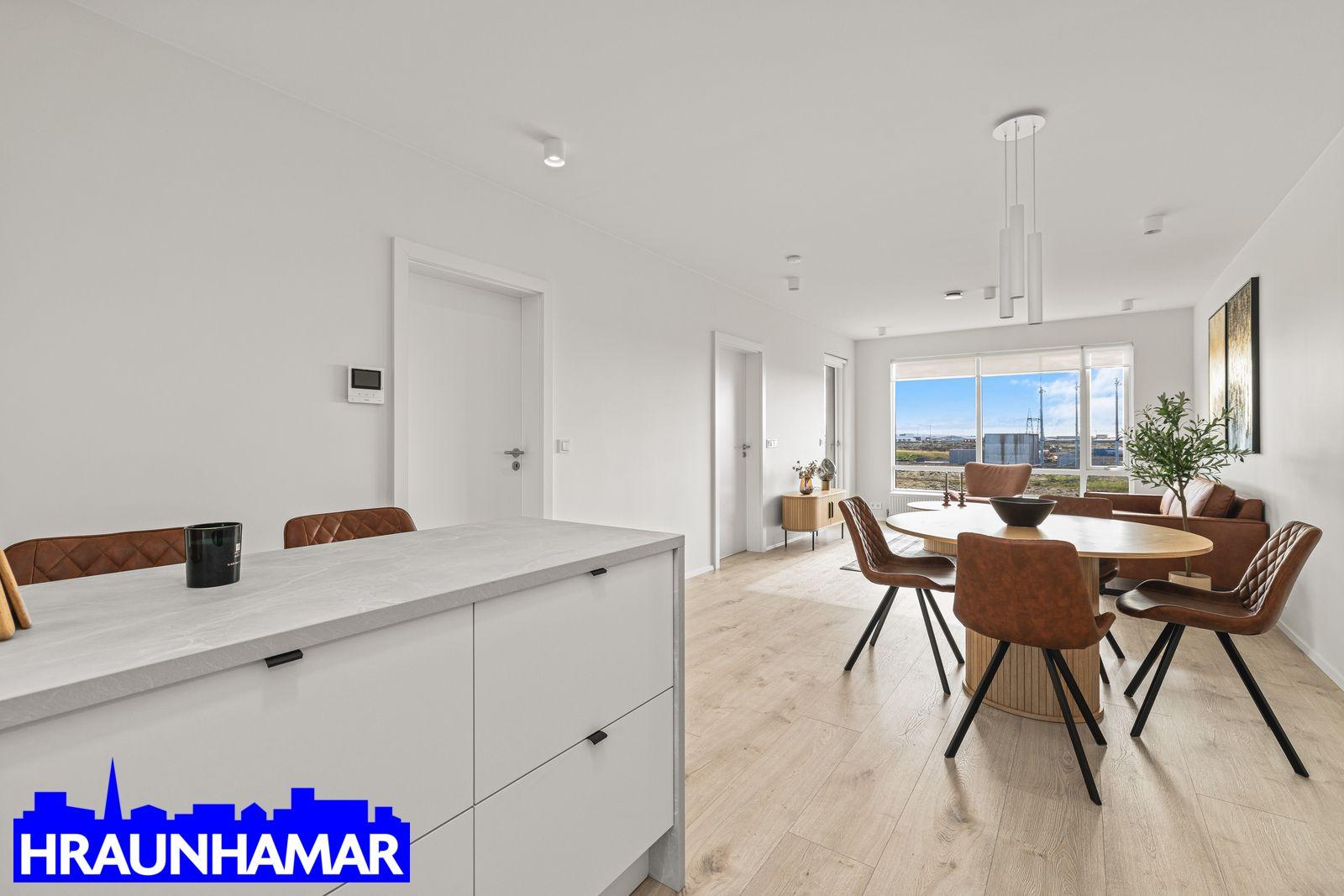 Hraunhamar kynnir: Glæsilega þriggja herbergja íbúð á 4. hæð með svölum á frábærum stað í nýju vönduðu lyftuhúsi í Hamraneshverfinu í Hafnarfirði, þar sem stutt er í alla helstu þjónustu. Íbúðirnar afhendast fullbúnar með gólfefnum. Afhending við kaupsamning.