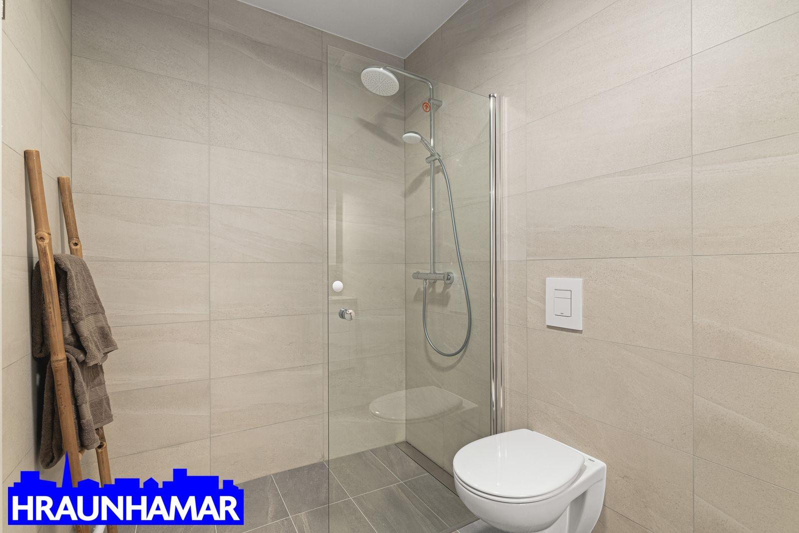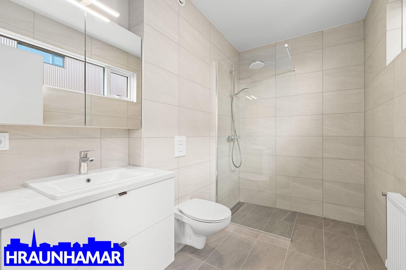 Flísalagt baðherbergi með innréttingu, upphengdu salerni og sturtu, þar er þvottaaðstaða.