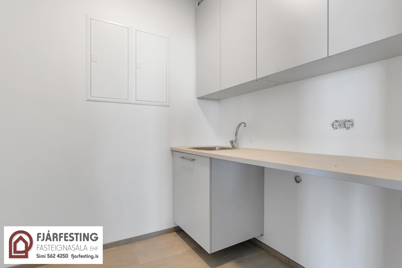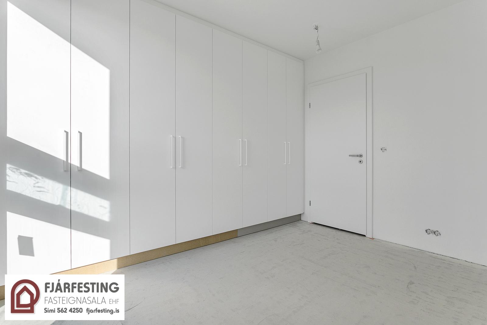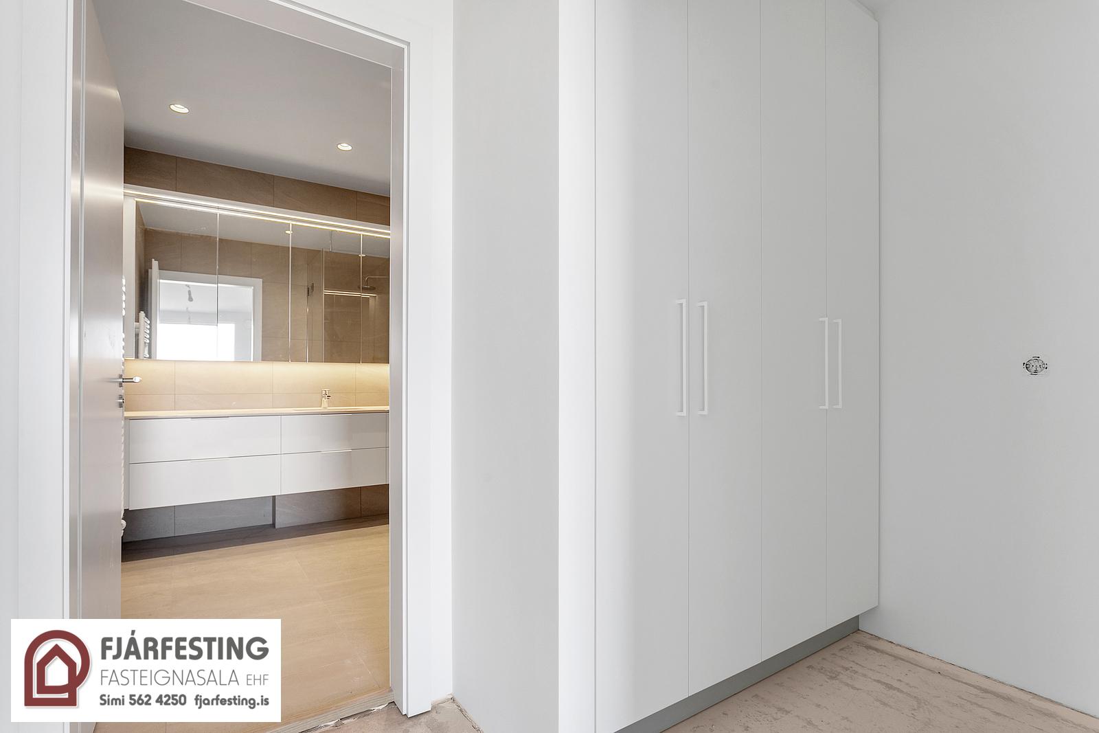 Íbúðin er öll hin glæsilegasta með fallegum innréttingum og fataskápum frá Brúnás. Blöndunartæki frá Tengi og AEG eldhústæki.
