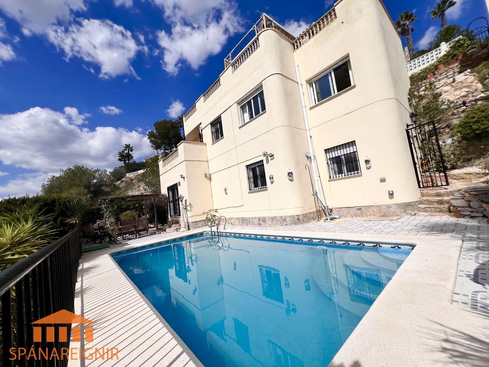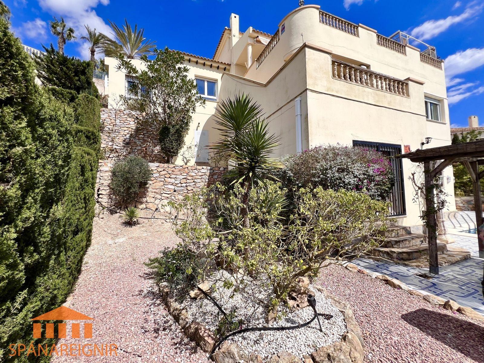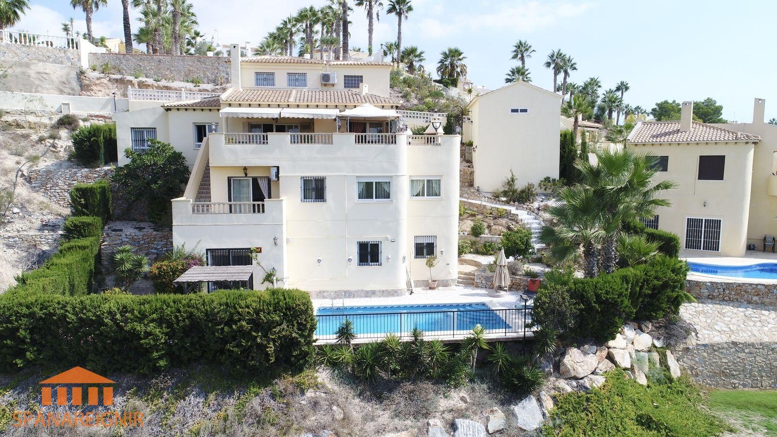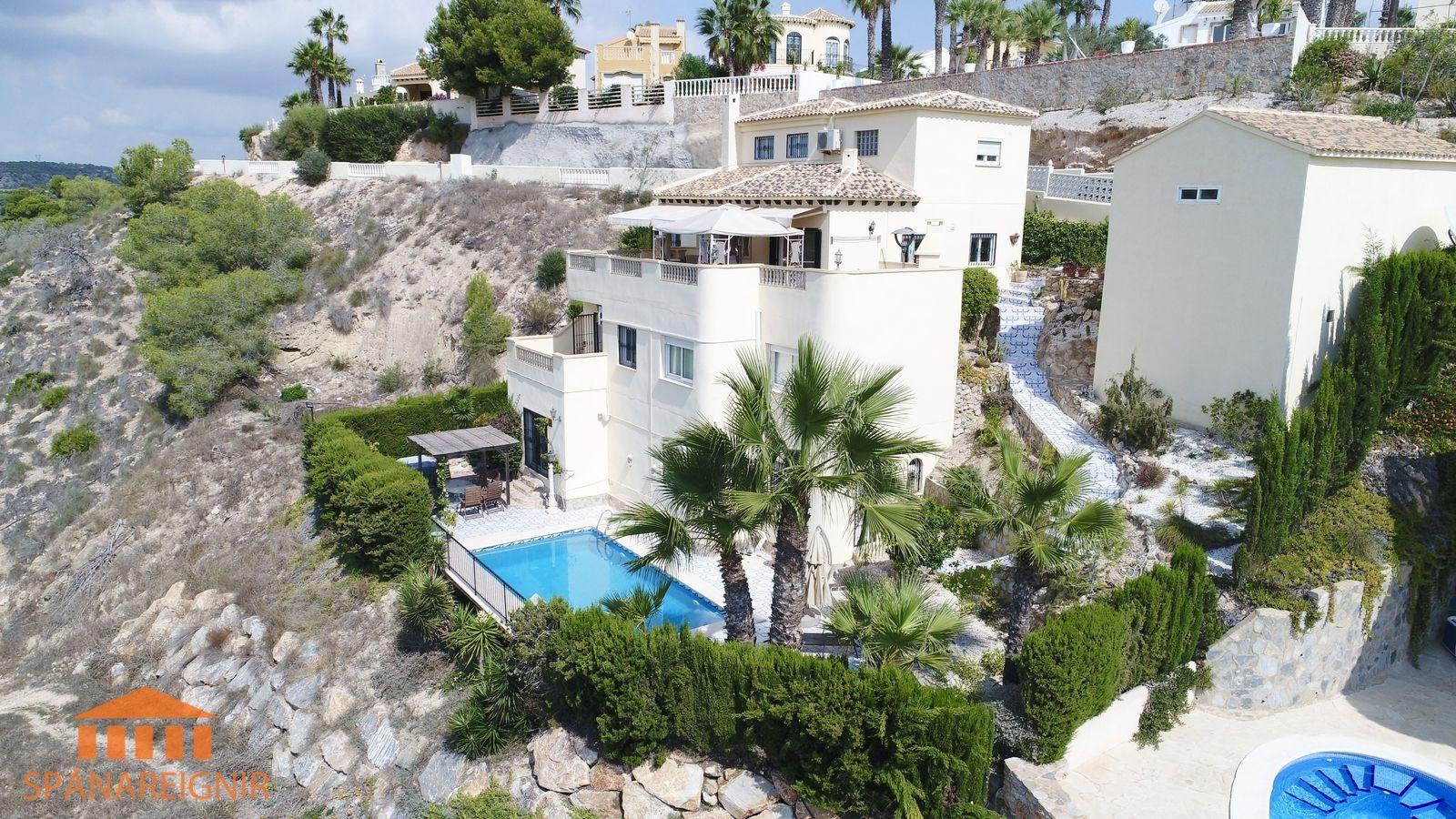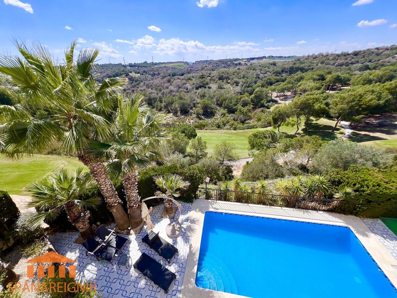 SPÁNAREIGNIR KYNNIR: *EINSTÖK VILLA Á FRÁBÆRUM ÚTSÝNISSTAÐ* *STAÐSETT Á FYRSTU LÍNU Á LAS RAMBLAS GOLFVELLINUM*Stórglæsilegt, rúmgott einbýlishús með bílskúr. Einstakt útsýni, stórri lóð með einkasundlaug í fyrstu línu við hinn vinsæla Las Ramblas golfvöll, um 50 mín akstur suður af Alicante. Húsið er á þremur hæðum, og auk þess þakherbergi, þar sem nú er skrifstofa. Einn eigandi frá upphafi.SJÁ MYNDBAND HÉR: https://youtu.be/ilB9L57in-8?si=loUULH6pEDUlXaFwAllar upplýsingar gefa