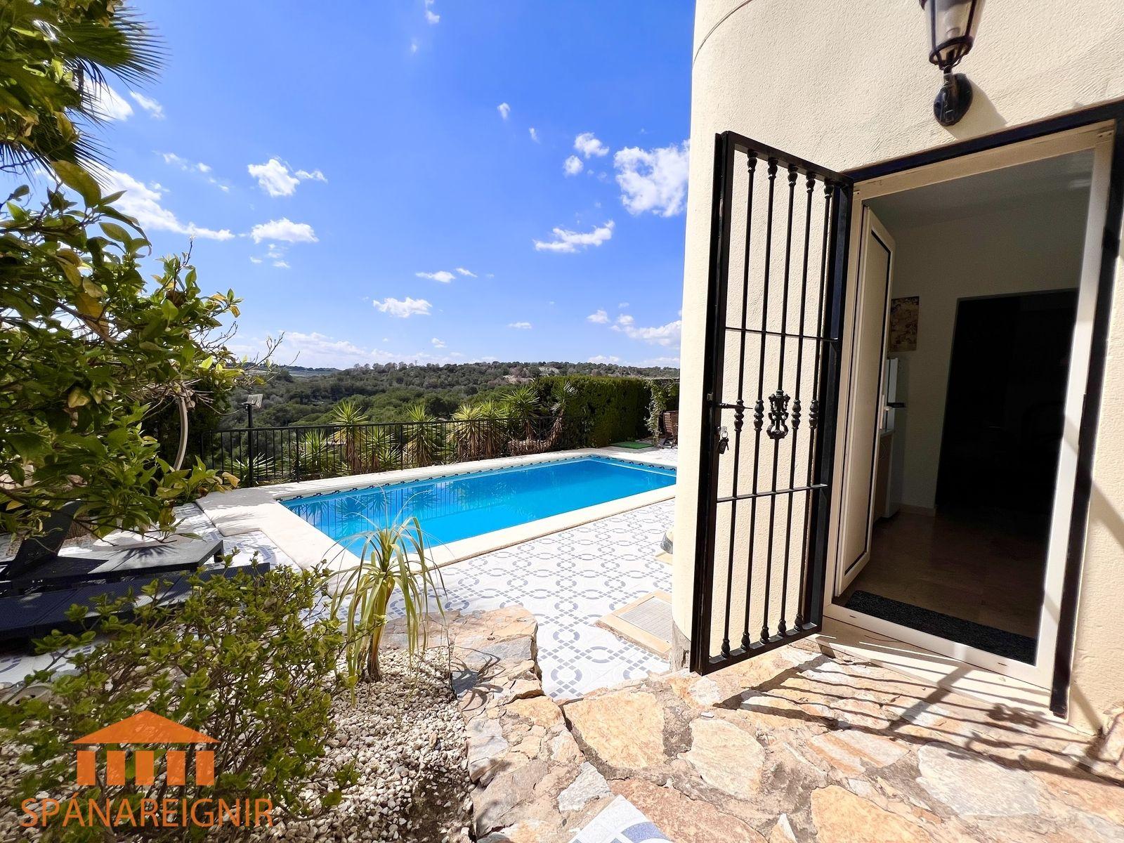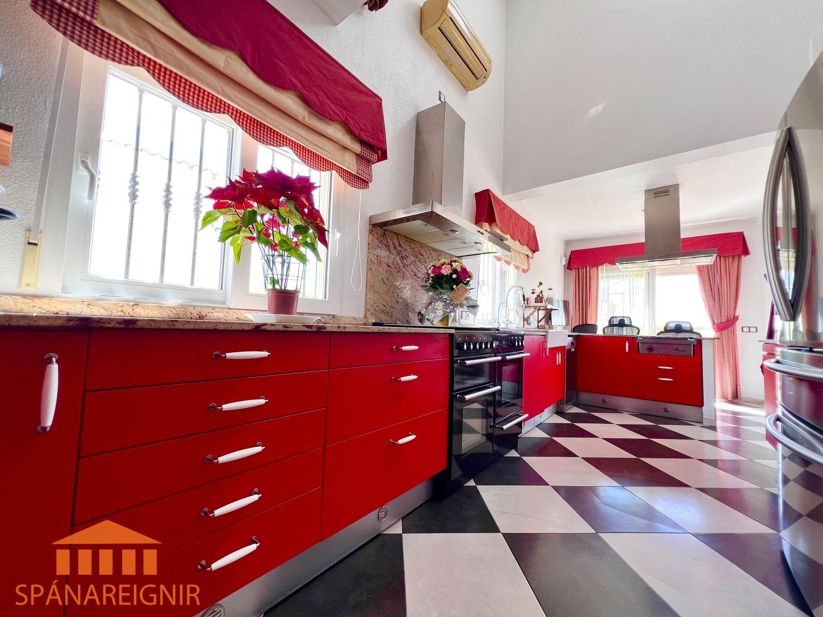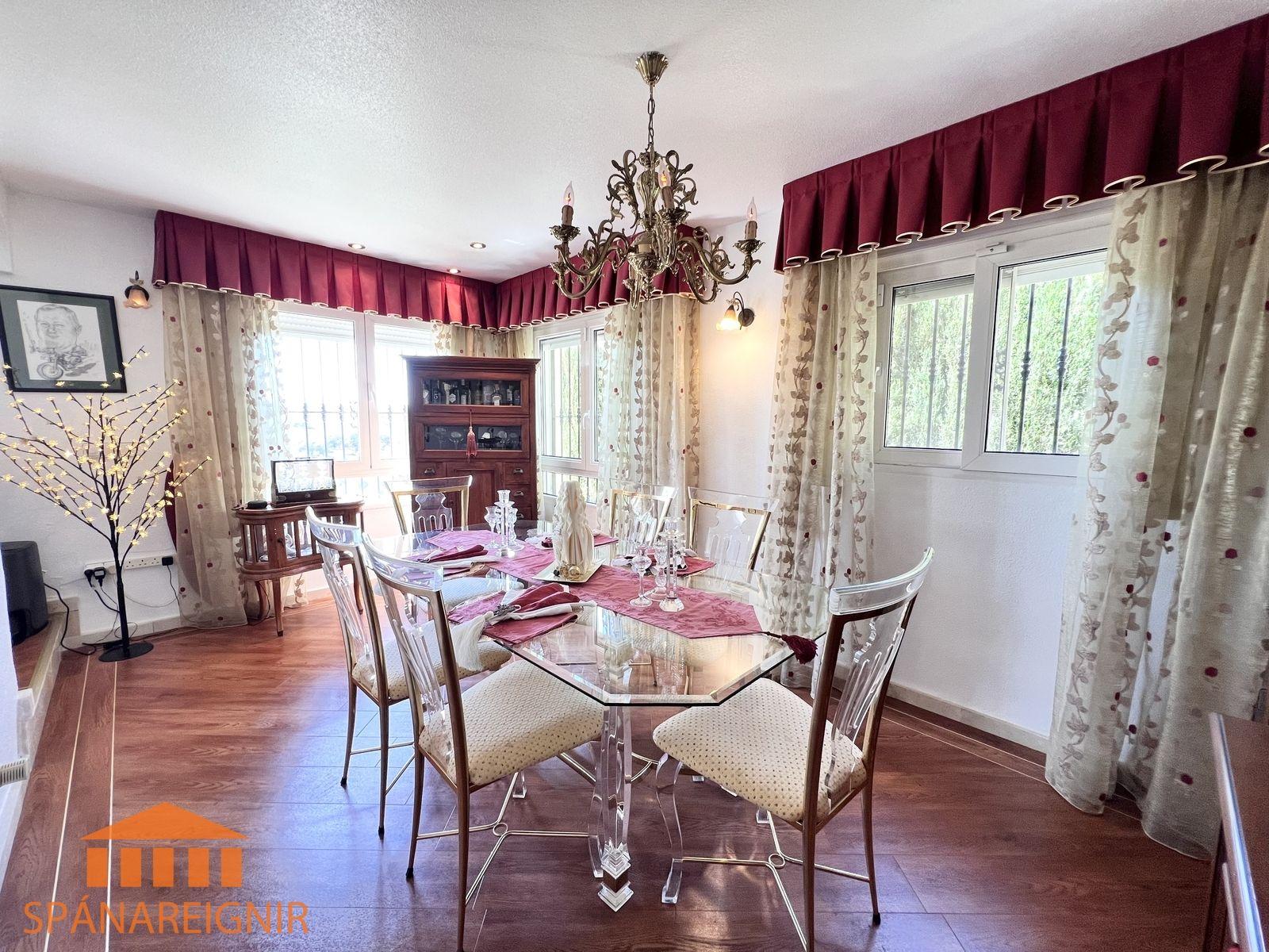 Húsið er mjög vel útbúið; arinn, loftkæling, hiti og öryggiskerfi. Öryggisgrindur fyrir gluggum. Sérstæður bílskúr. Einkasundlaug. Selst með húsgögnum.