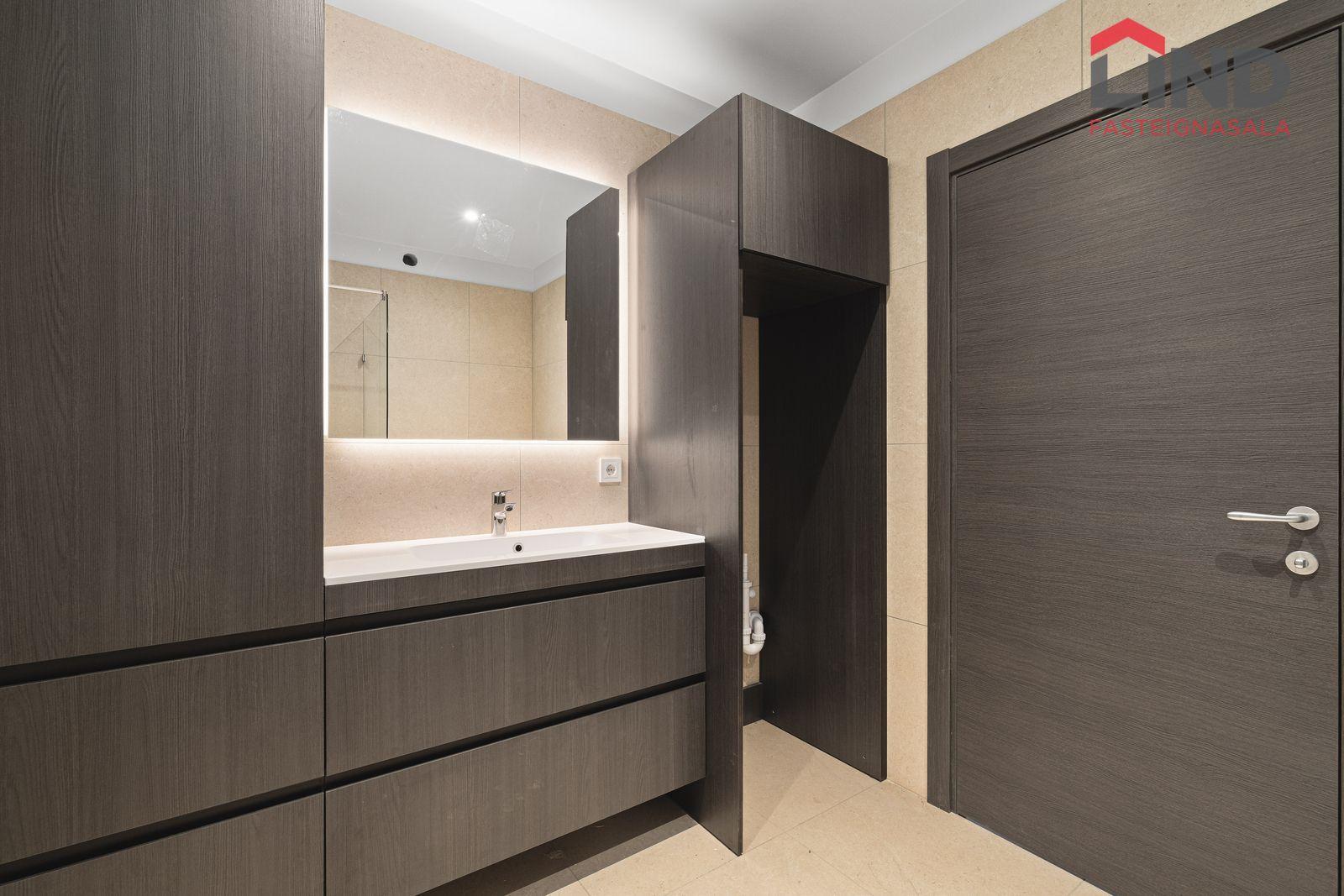 3 AM. Salerni er upphengt, handklæðaofn og sturta með glerskilrúmi. Gert er ráð fyrir þvottavél og þurrkara á baðherberginu með sérsmíðaðri innrétingu frá