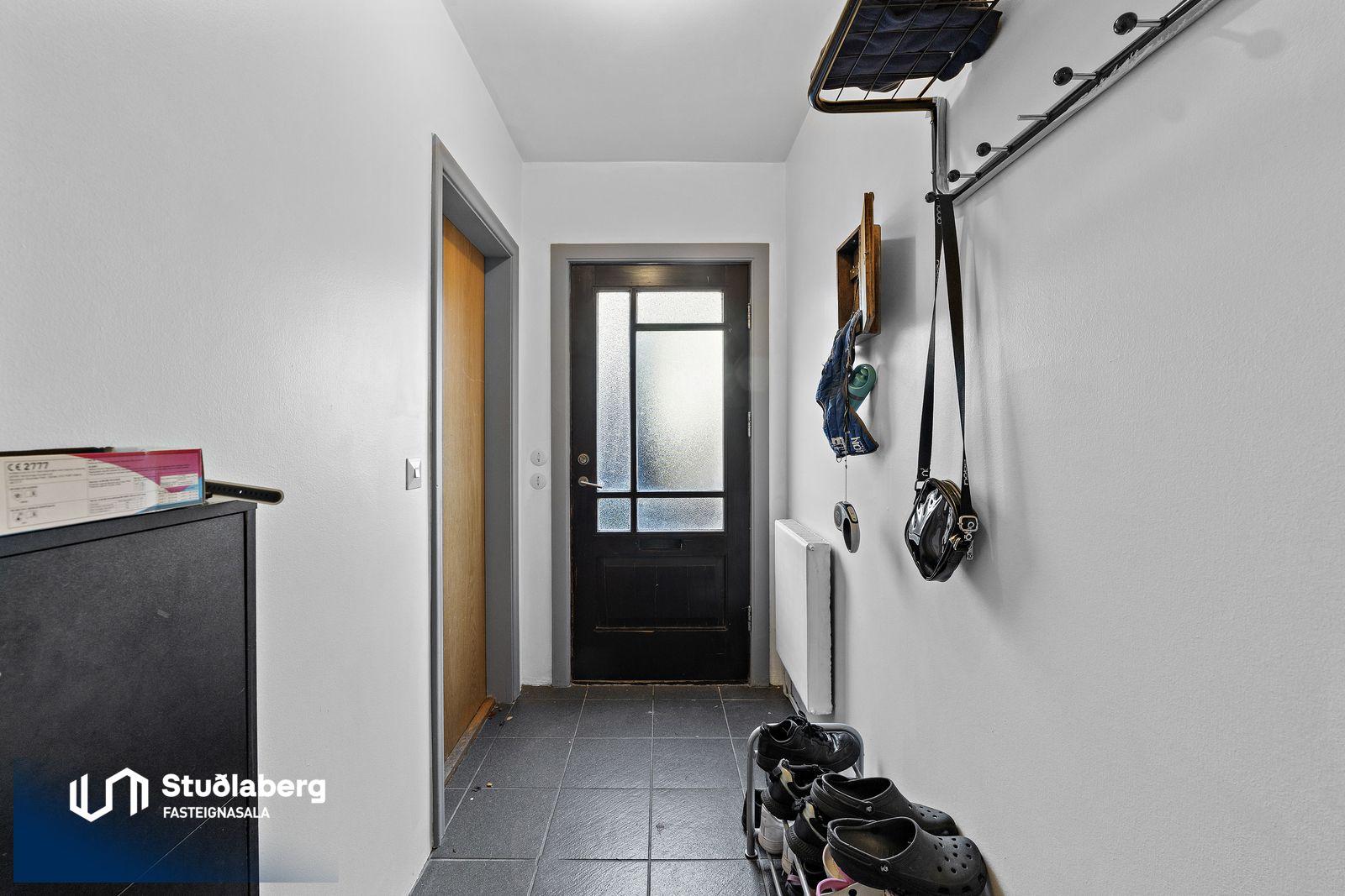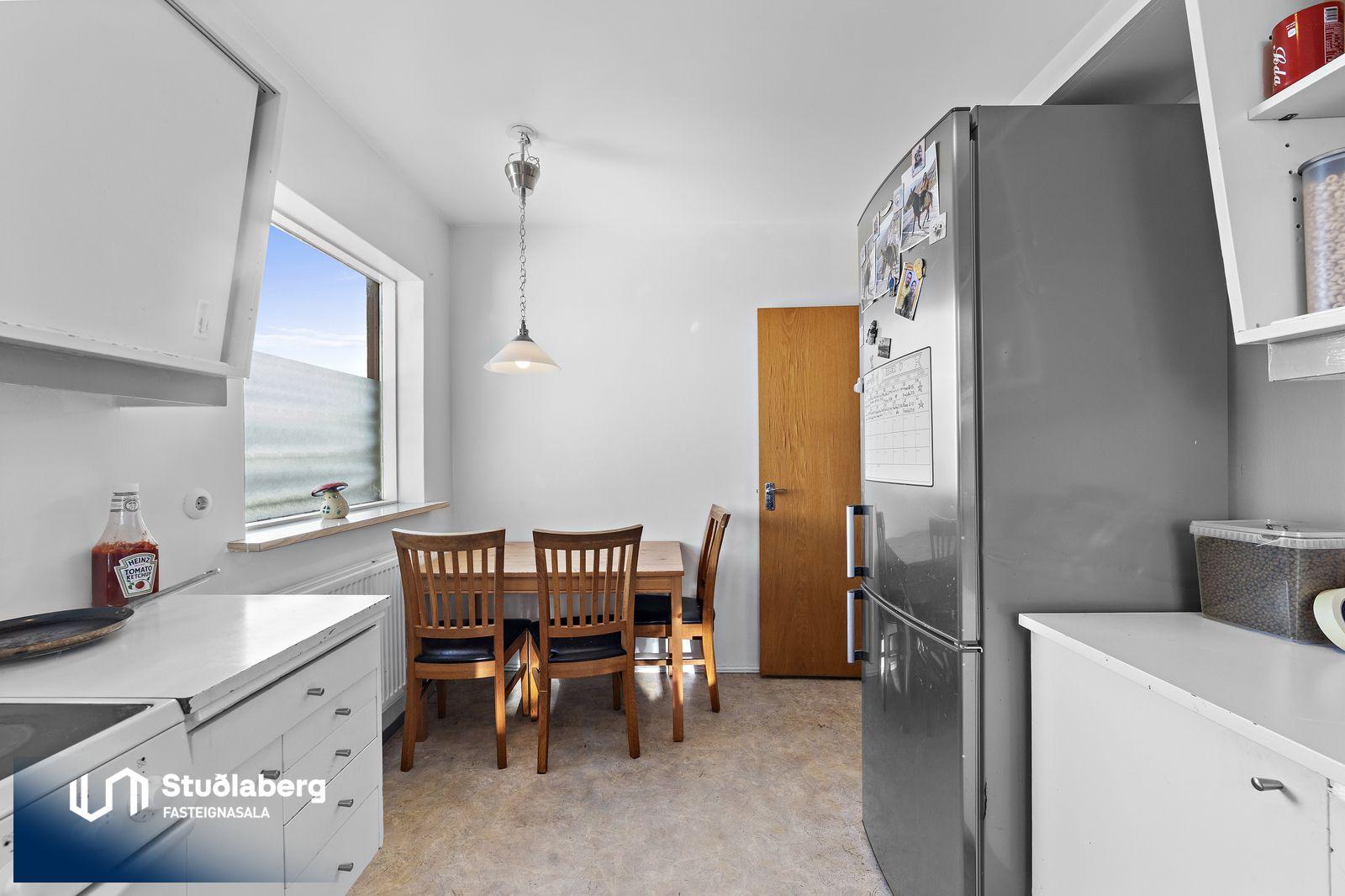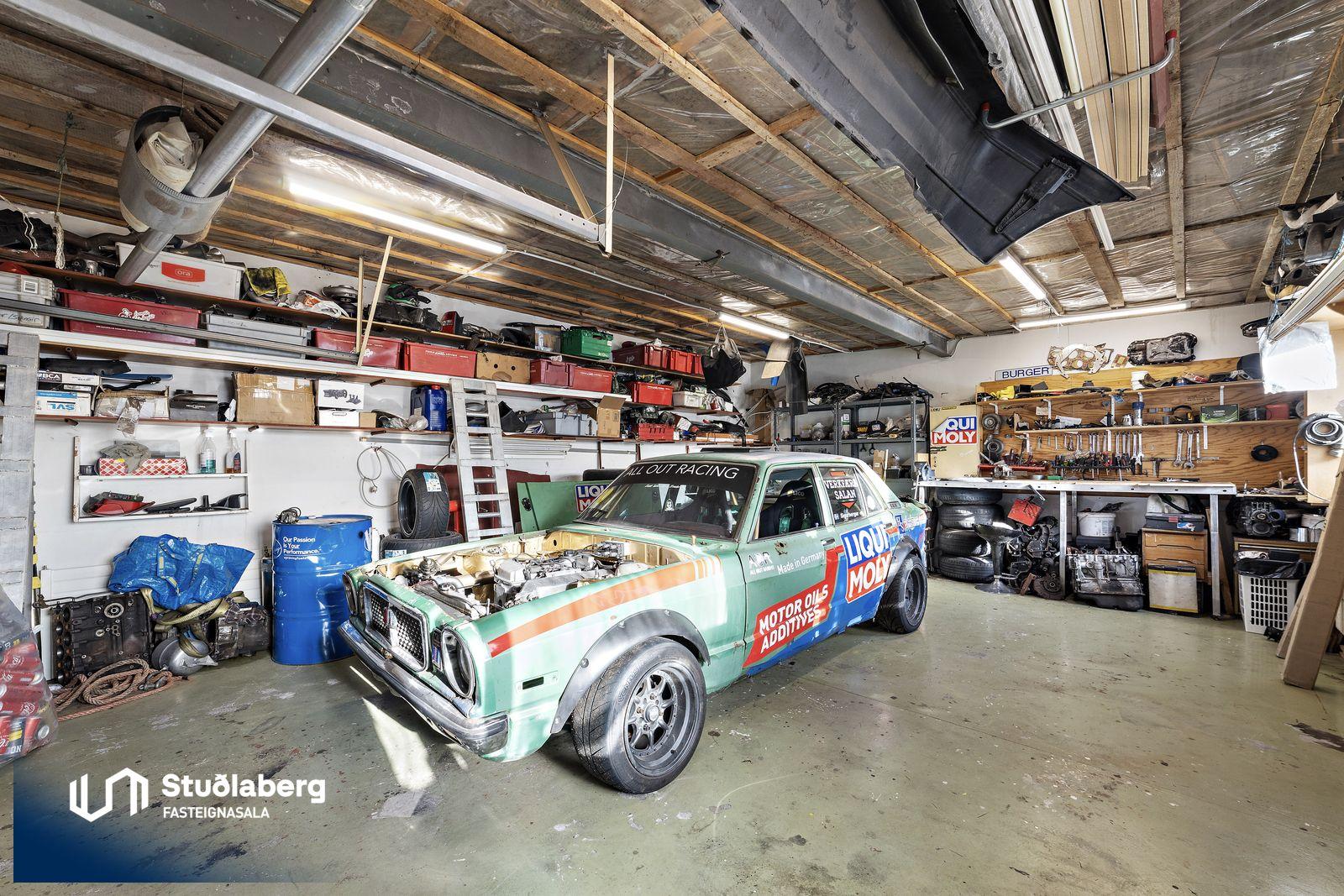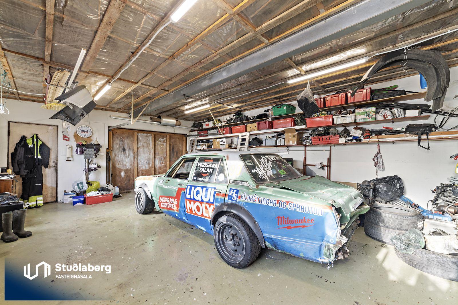Lýsing og skipulag eignar: Forstofa hefur flísar á gólfi. Þvottahús er sameiginlegt og hefur málað gólf. Svefnherbergin eru þrjú og hafa parket á gólfi, plássmikill fataskápur í einu. Baðherbergi með flísalögð í hólf og gólf, baðkar og klósett. Stofan er tvöföld og er möguleiki að stúka niður stofu í herbergi og stofu. Eldhús með dúk á gólfi og innréttingu. Geymsla er undir stiga. Geymsluskúr er 15fm á bakvið hús á steyptri plötu með stórri hurð á gafli og inngöngu hurð á hliðinni. Bílskúr er 48.5 fm með hita og rafmagni.