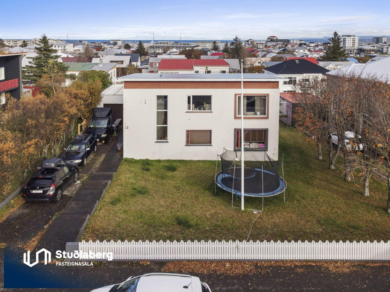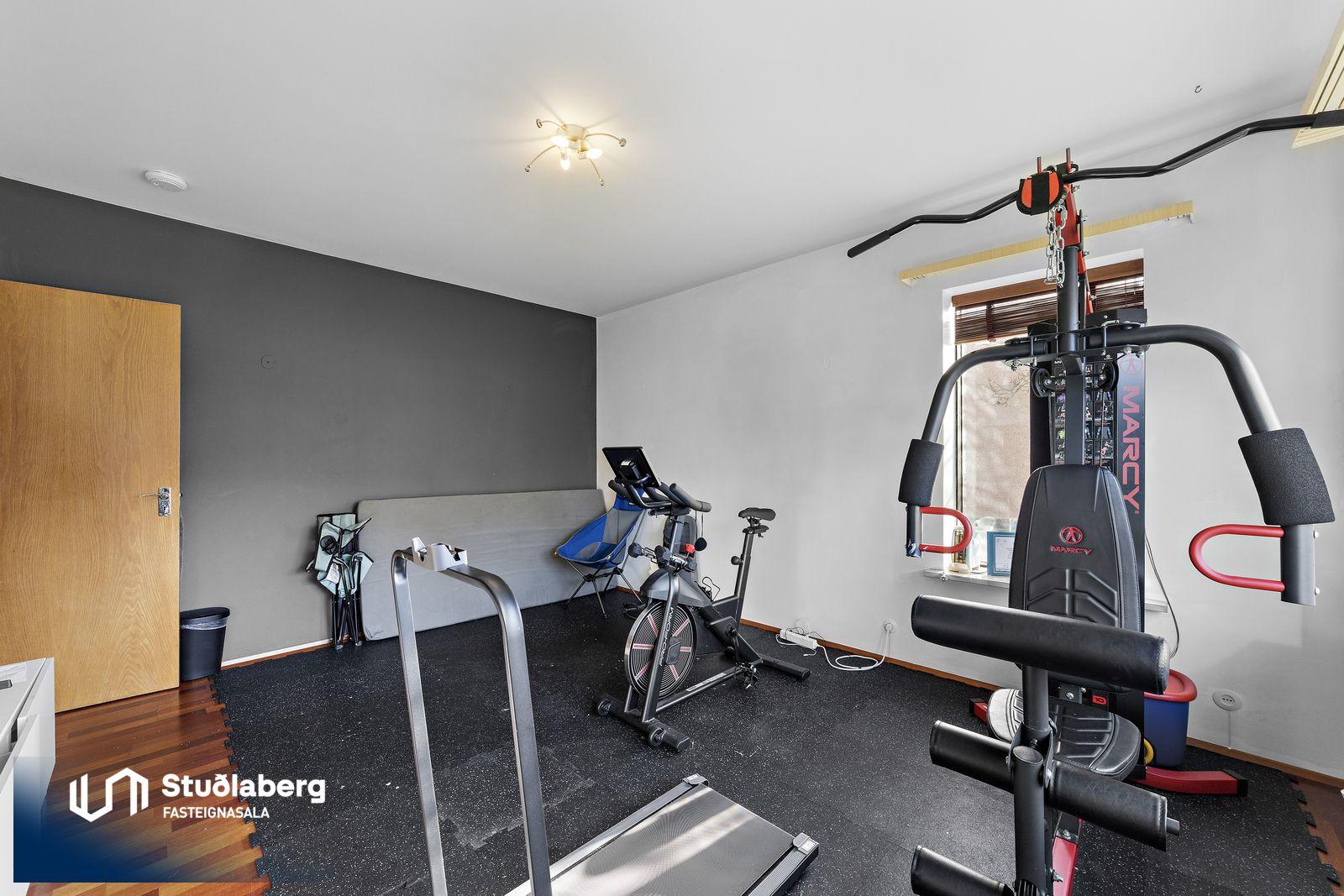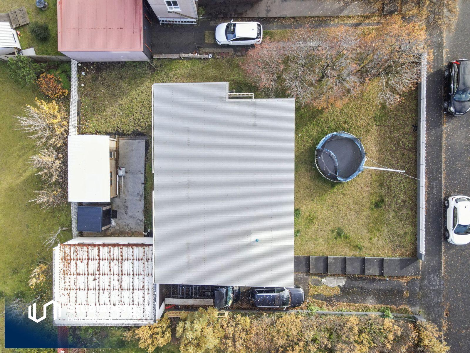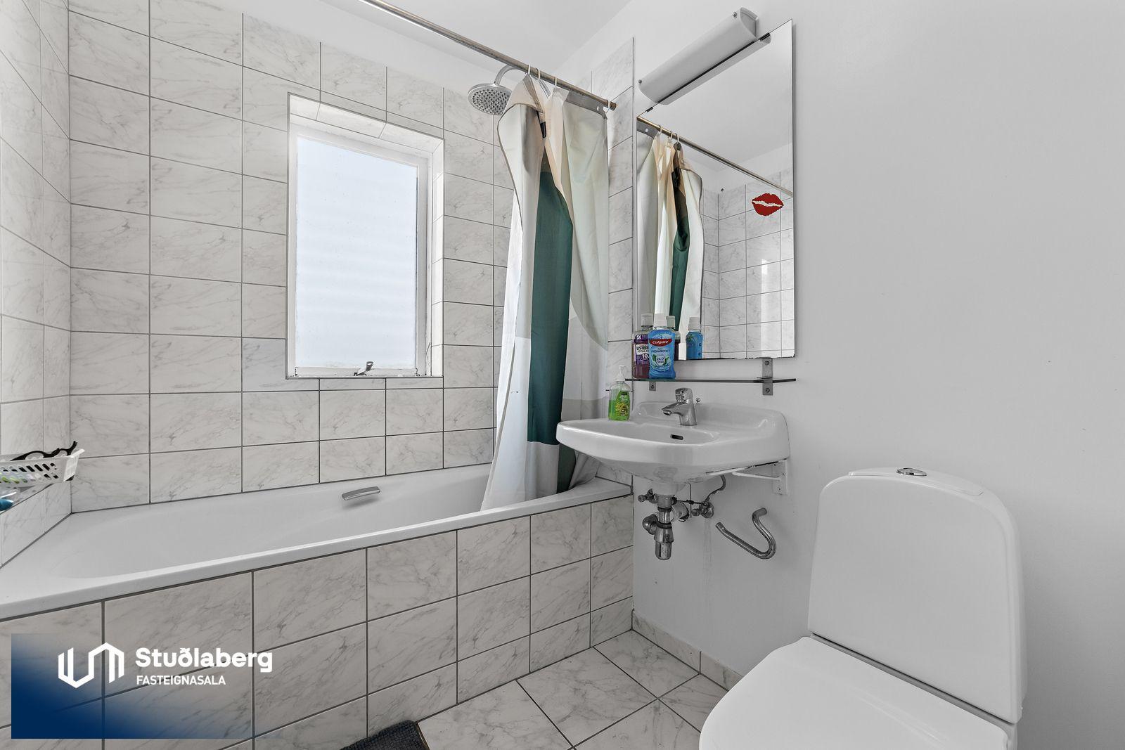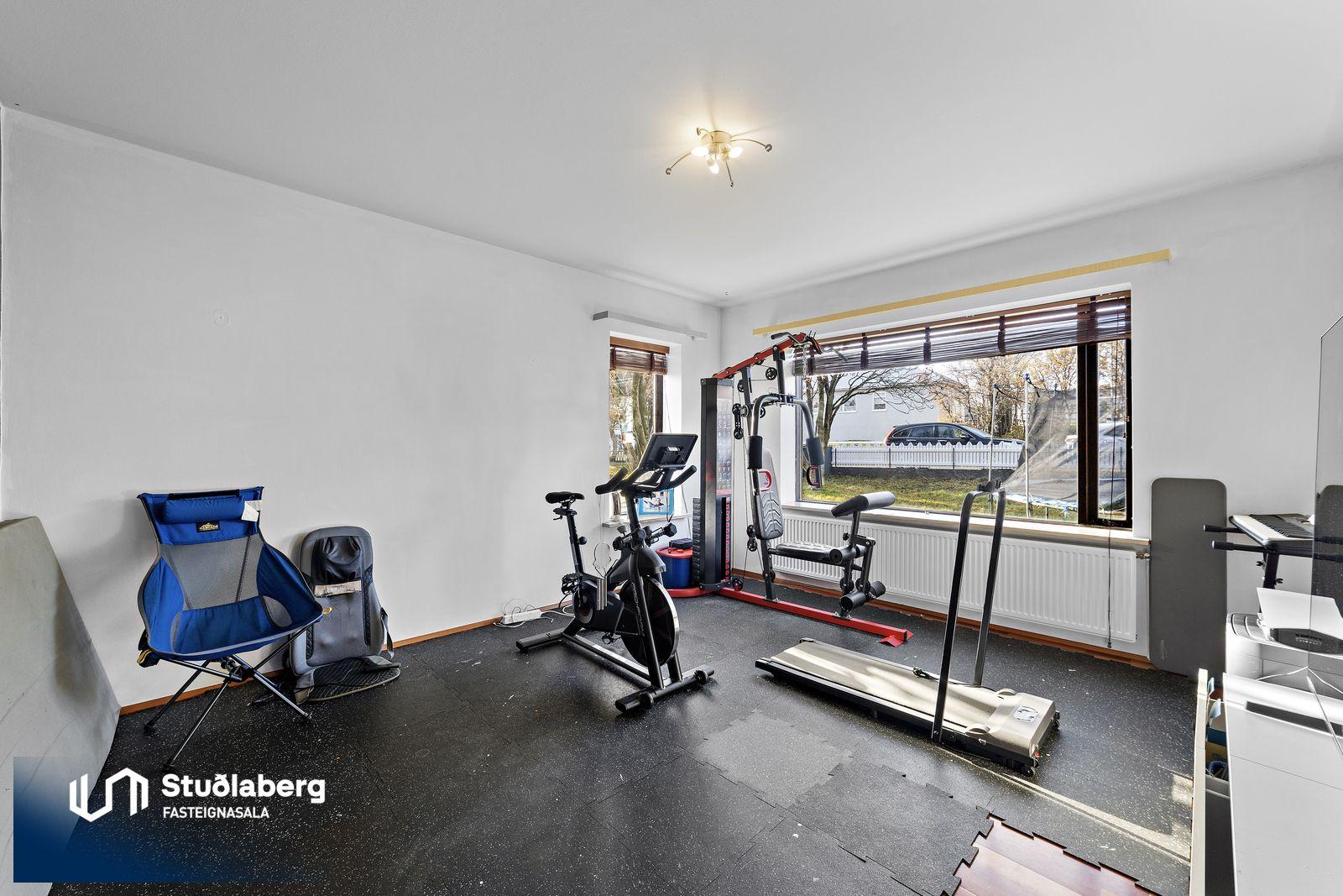 Lýsing og skipulag eignar: Forstofa hefur flísar á gólfi. Þvottahús er sameiginlegt og hefur málað gólf. Svefnherbergin eru þrjú og hafa parket á gólfi, plássmikill fataskápur í einu. Baðherbergi með flísalögð í hólf og gólf, baðkar og klósett. Stofan er tvöföld og er möguleiki að stúka niður stofu í herbergi og stofu. Eldhús með dúk á gólfi og innréttingu. Geymsla er undir stiga. Geymsluskúr er 15fm á bakvið hús á steyptri plötu með stórri hurð á gafli og inngöngu hurð á hliðinni. Bílskúr er 48.5 fm með hita og rafmagni.