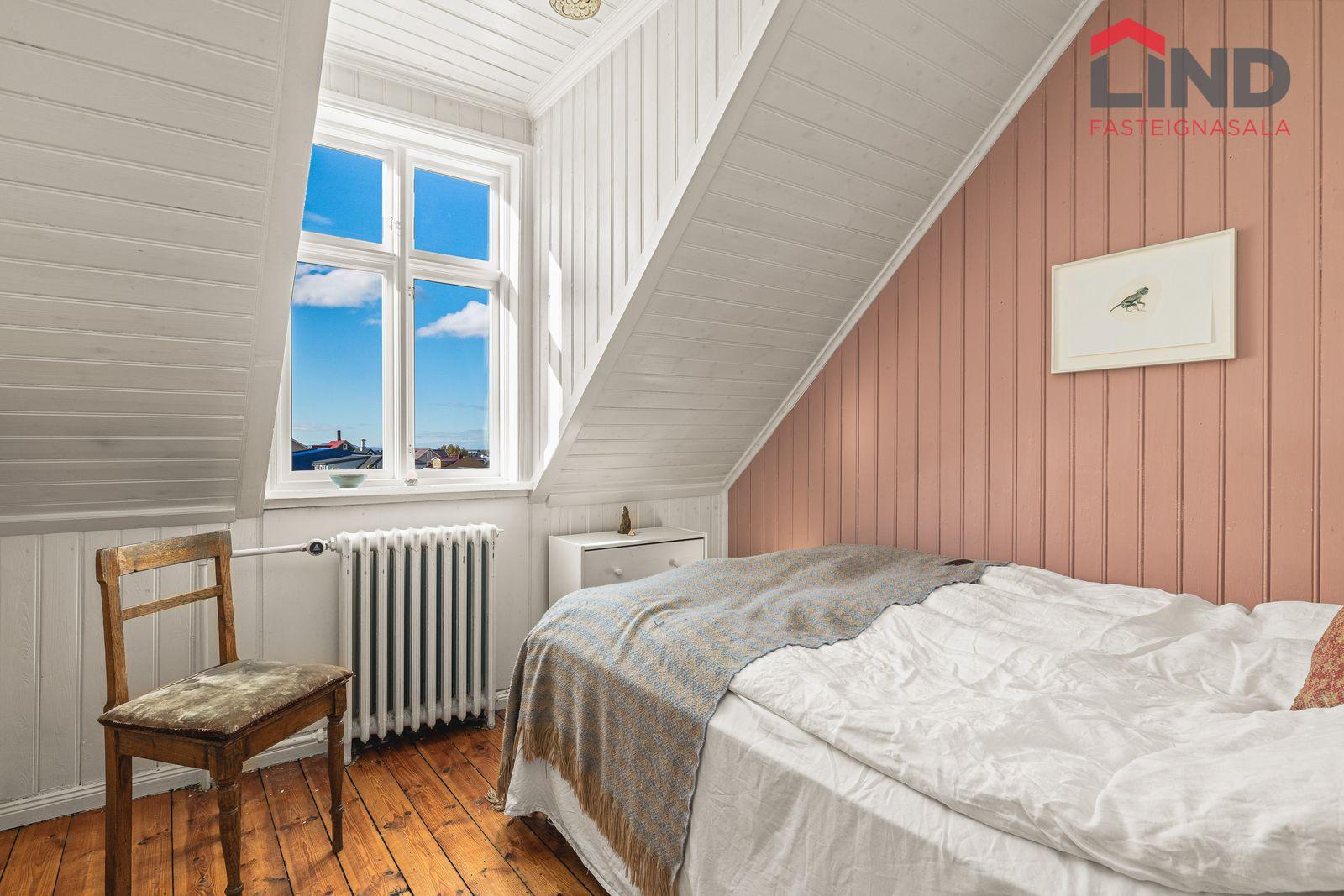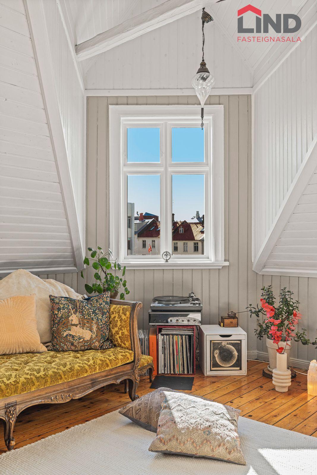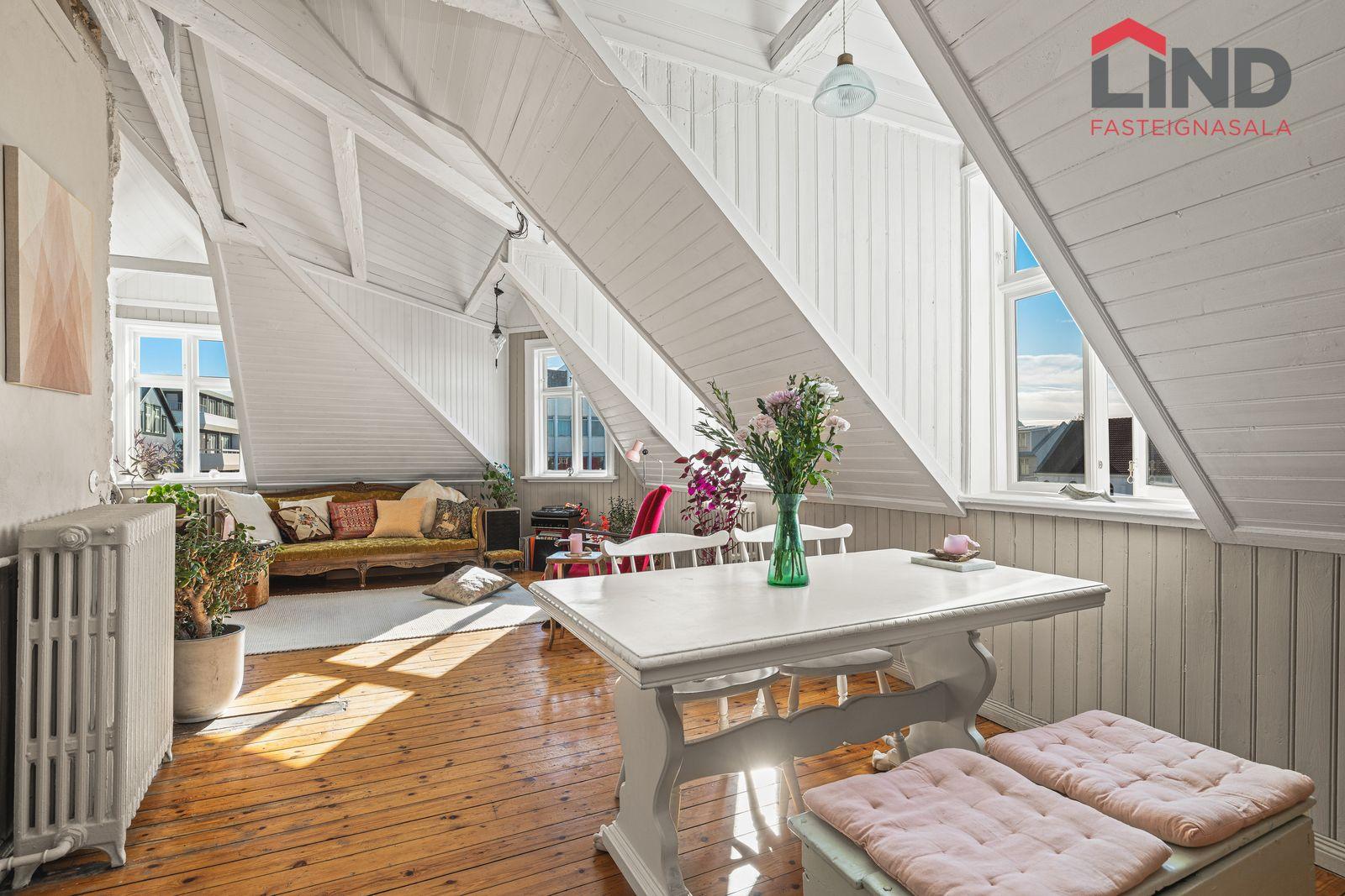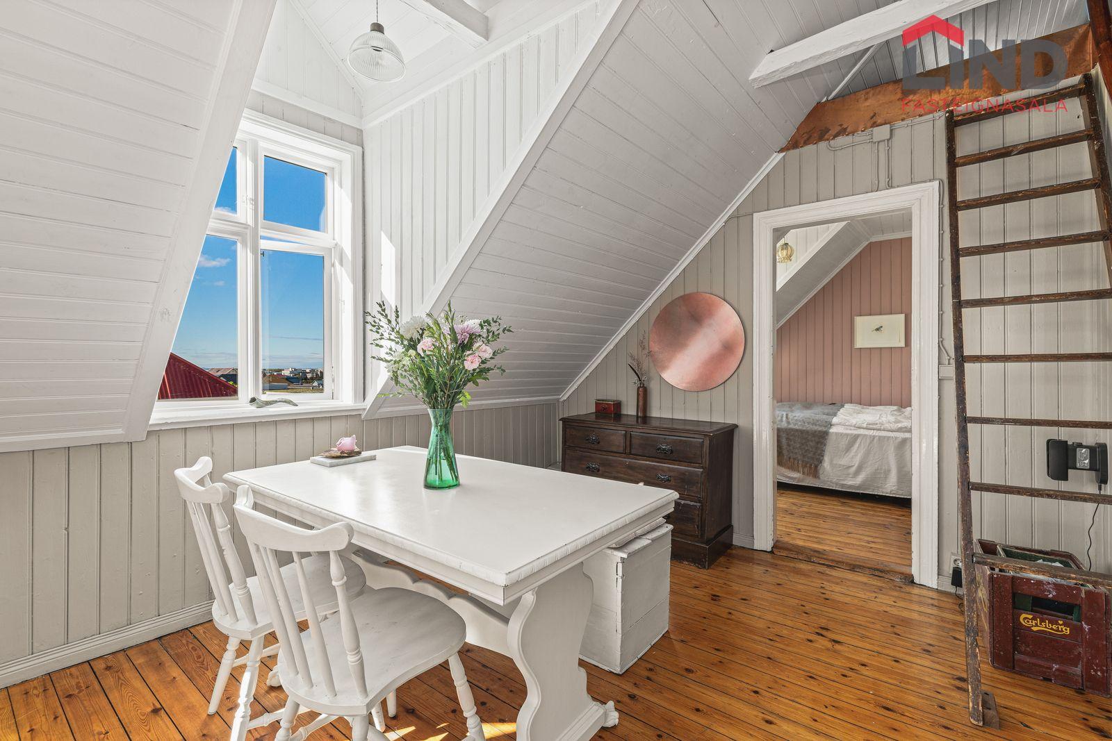 Nánari lýsing: Forstofa: Viðarfjalir á gólfi. Stofa: Er stór með viðarfjölum á gólfum og panelklæddum veggjum/loftum. Aukin lofthæð og sjarmerandi gluggar til austurs og suðurs. Eldhús: Var endurnýjað nýlega á fallegan máta. Nýleg eldhúsinnrétting með fallegum Taj Mahal steini á borðum og glugga til vesturs. AEG bakaraofn, spansuðu helluborð, innb. uppþvottavél og undirfelldur vaskur. Upphaflegar viðarfjalir á gólfum hafa fengið að halda sér. Hjónaherbergi: Er rúmgott með viðarfjölum á gólfum og glugga til norðurs. Svefnherbergi II: Með viðarfjölum á gólfum og glugga til suðurs með fallegu útsýni. Fataherbergi: Með viðarfjölum á gólfi og skápum. Gengið er inn í fataherbergi frá svefnherbergi II. Svalir: Eru afar sjarmerandi þar sem þakið gengur yfir þær að hluta. Glæsilegt útsýni yfir miðborgina og út á sjó. Baðherbergi: Með viðarfjölum á gólfi, baðkari með sturtutækjum og sturtu.Tengi fyrir þvottavél, salerni og vaskur. Gluggi til vesturs. Ný blöndunartæki (Omnires) eru til fyrir baðherbergi sem fylgja íbúð. Risloft: Er yfir hluta af íbúðinni sem skráist ekki inn í fermetratölu íbúðar. Hefur verið nýtt sem svefnloft og geymsluloft. Gluggi til vesturs.
