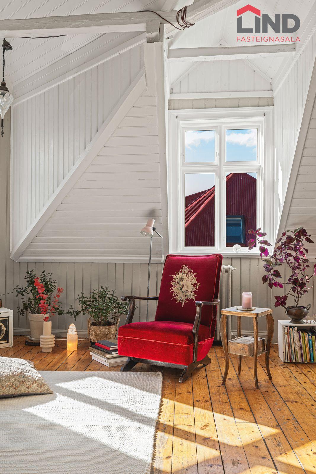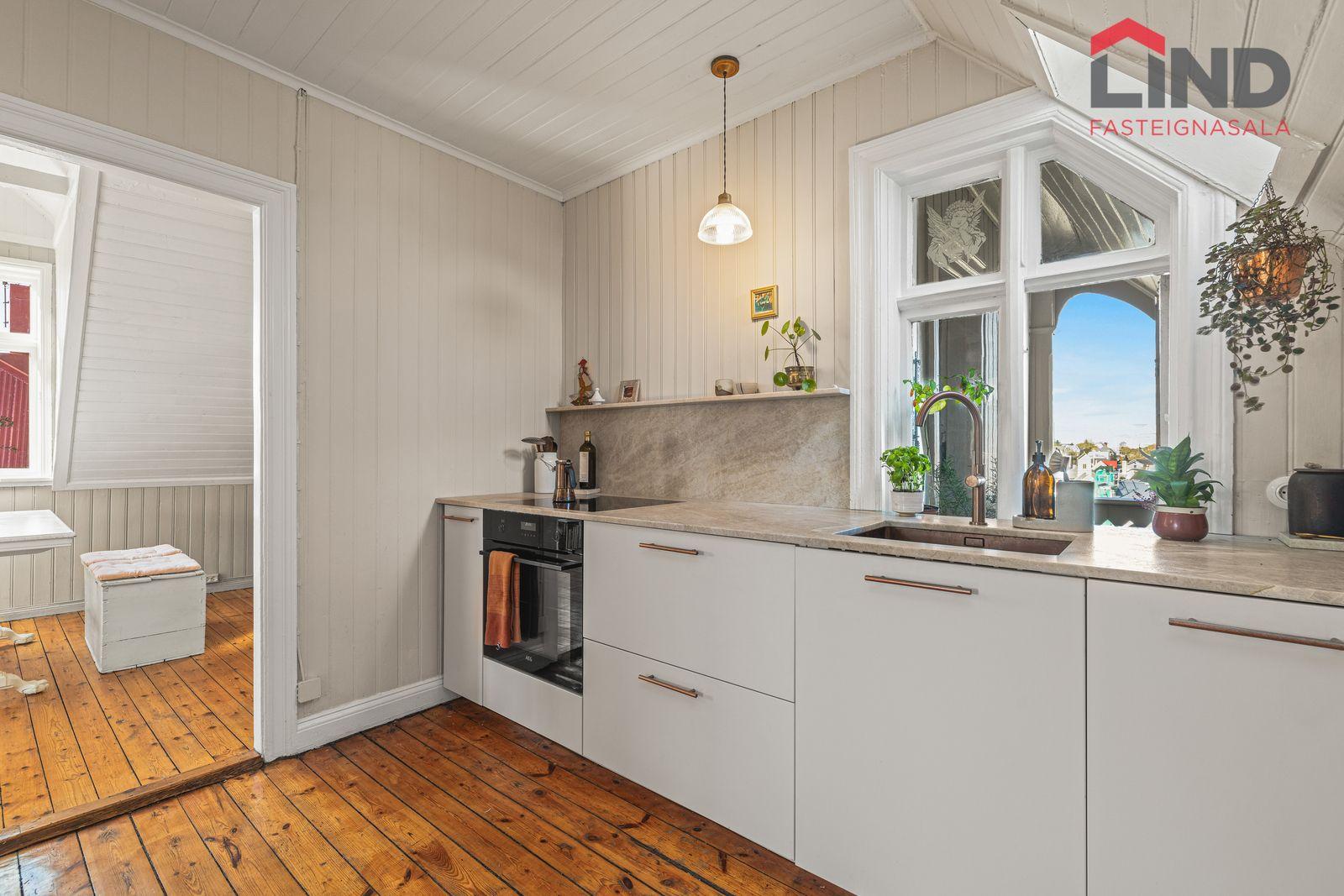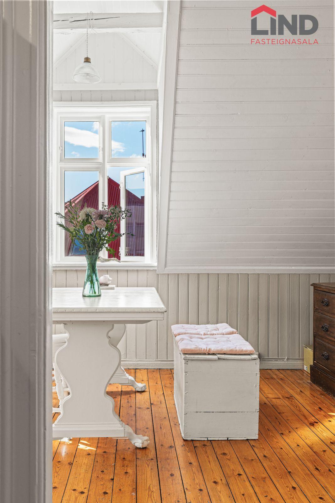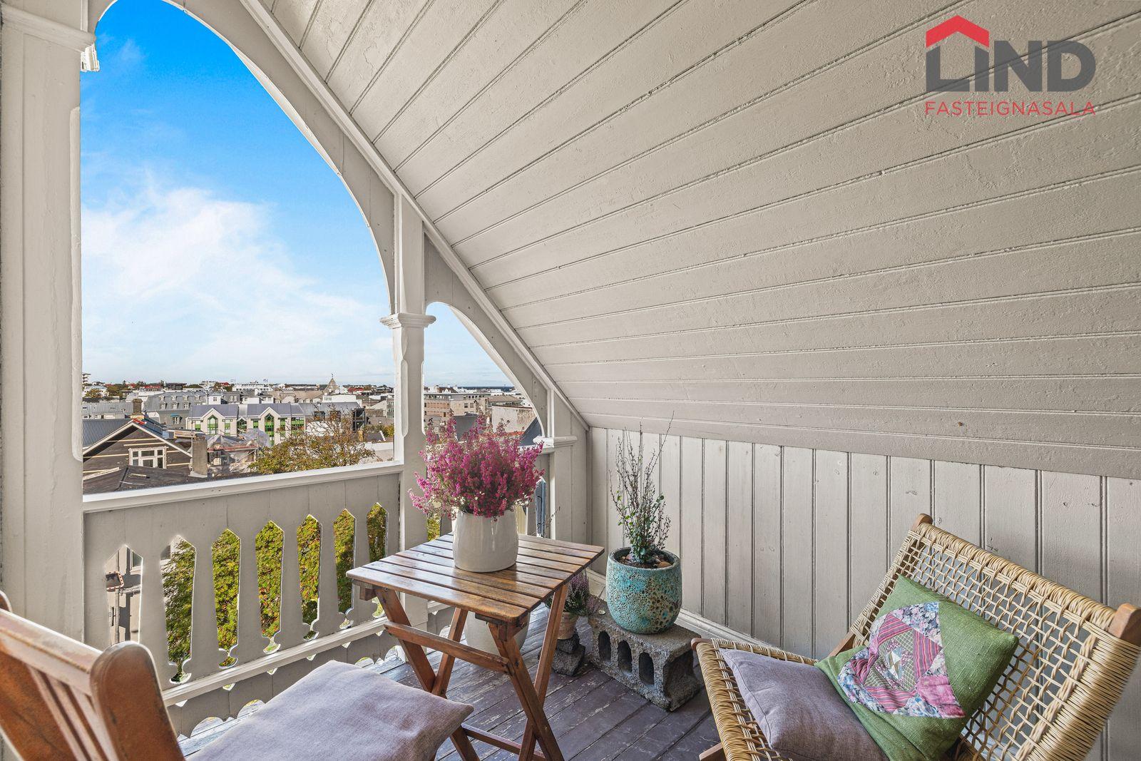 Nánari lýsing: Forstofa: Viðarfjalir á gólfi. Stofa: Er stór með viðarfjölum á gólfum og panelklæddum veggjum/loftum. Aukin lofthæð og sjarmerandi gluggar til austurs og suðurs. Eldhús: Var endurnýjað nýlega á fallegan máta. Nýleg eldhúsinnrétting með fallegum Taj Mahal steini á borðum og glugga til vesturs. AEG bakaraofn, spansuðu helluborð, innb. uppþvottavél og undirfelldur vaskur. Upphaflegar viðarfjalir á gólfum hafa fengið að halda sér. Hjónaherbergi: Er rúmgott með viðarfjölum á gólfum og glugga til norðurs. Svefnherbergi II: Með viðarfjölum á gólfum og glugga til suðurs með fallegu útsýni. Fataherbergi: Með viðarfjölum á gólfi og skápum. Gengið er inn í fataherbergi frá svefnherbergi II. Svalir: Eru afar sjarmerandi þar sem þakið gengur yfir þær að hluta. Glæsilegt útsýni yfir miðborgina og út á sjó. Baðherbergi: Með viðarfjölum á gólfi, baðkari með sturtutækjum og sturtu.Tengi fyrir þvottavél, salerni og vaskur. Gluggi til vesturs. Ný blöndunartæki (Omnires) eru til fyrir baðherbergi sem fylgja íbúð. Risloft: Er yfir hluta af íbúðinni sem skráist ekki inn í fermetratölu íbúðar. Hefur verið nýtt sem svefnloft og geymsluloft. Gluggi til vesturs.