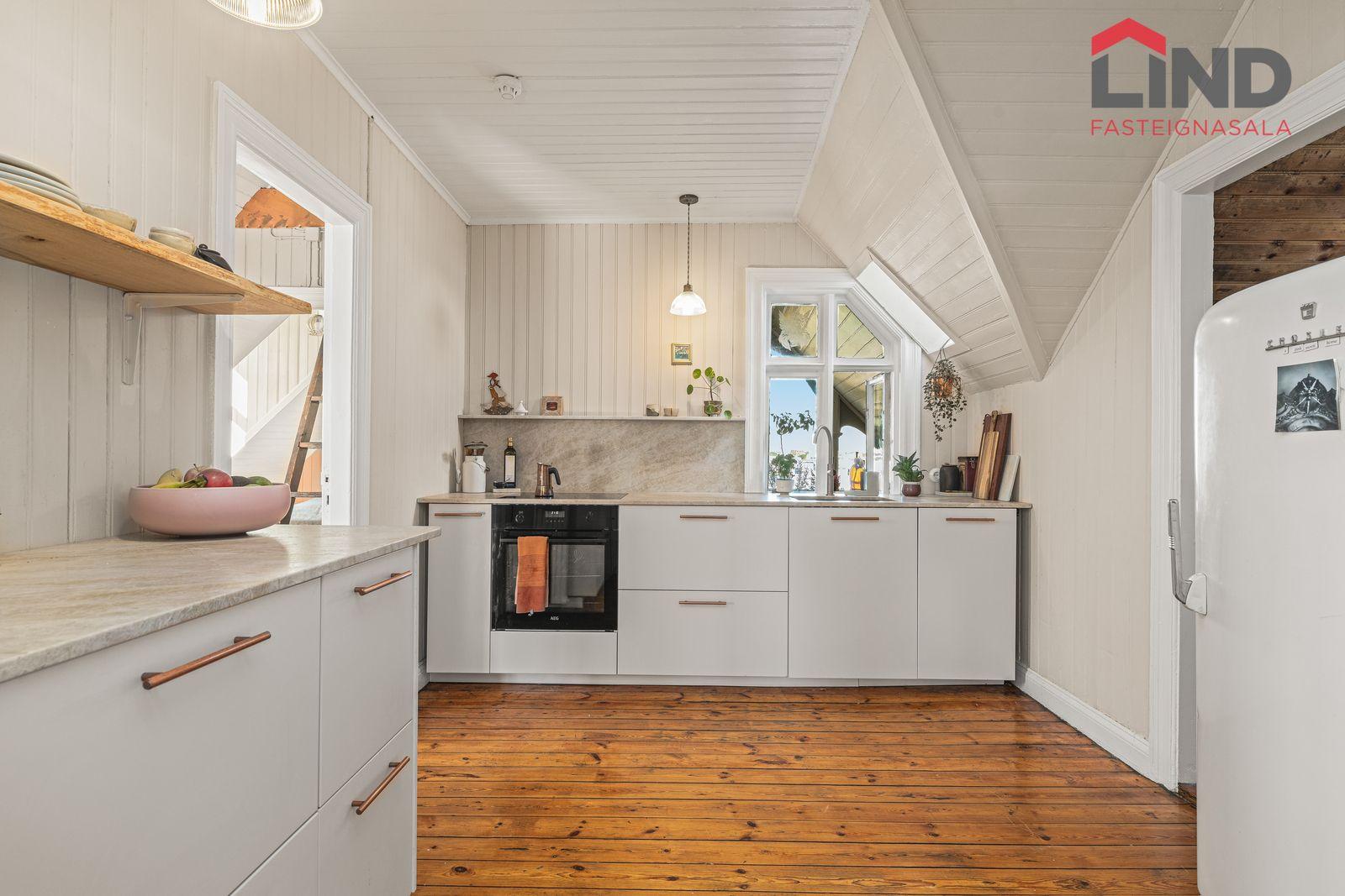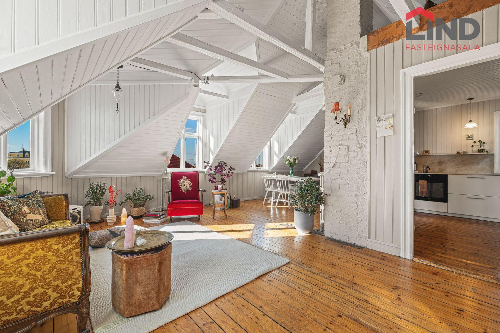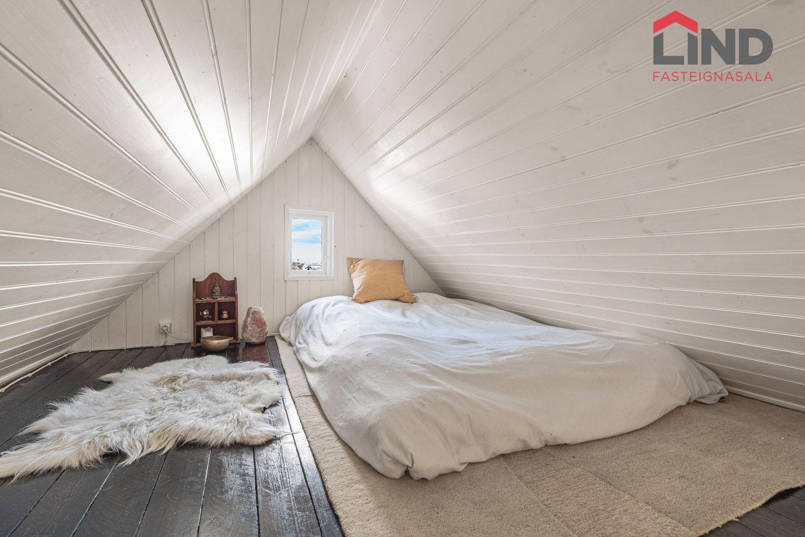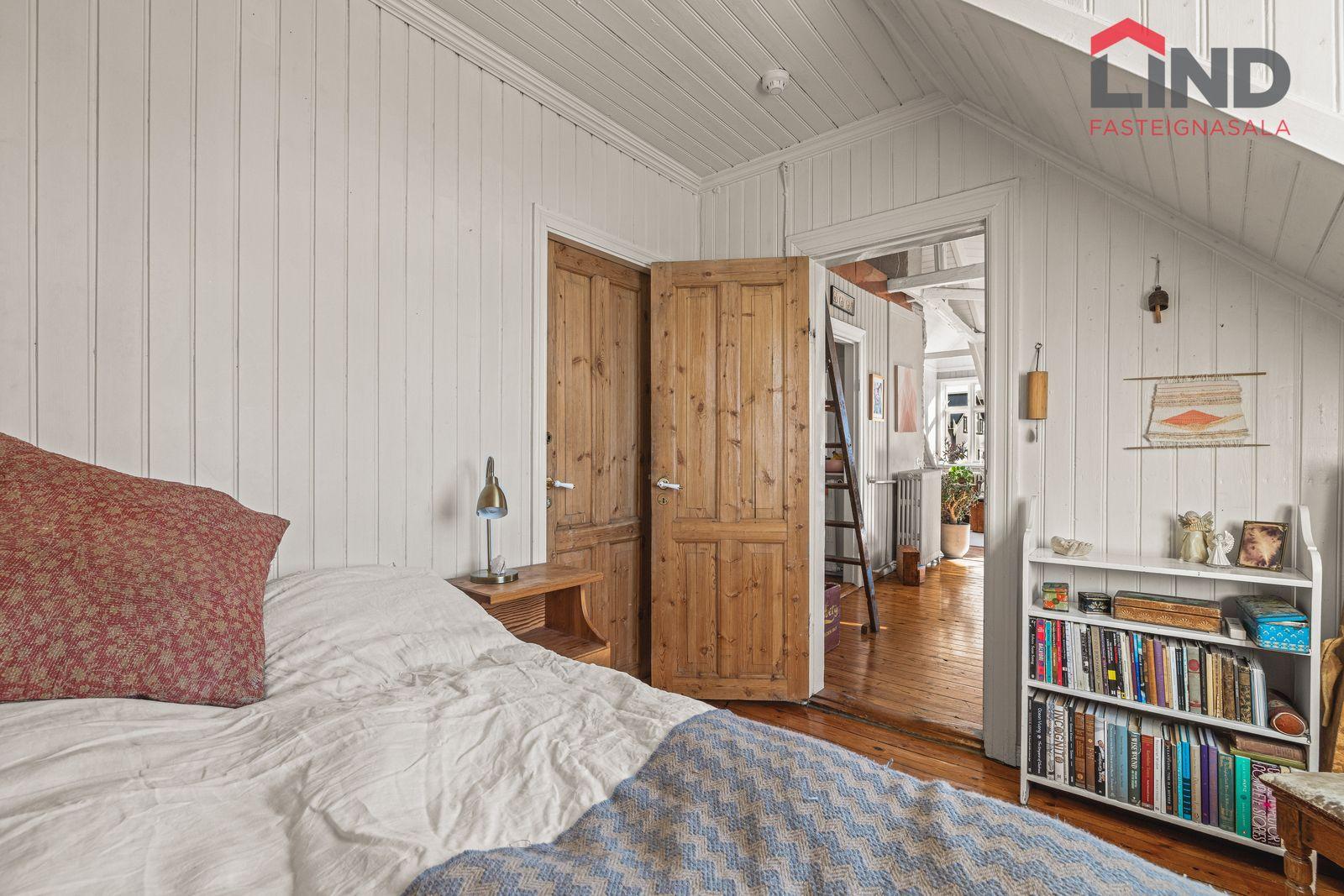 Nánari lýsing: Forstofa: Viðarfjalir á gólfi. Stofa: Er stór með viðarfjölum á gólfum og panelklæddum veggjum/loftum. Aukin lofthæð og sjarmerandi gluggar til austurs og suðurs. Eldhús: Var endurnýjað nýlega á fallegan máta. Nýleg eldhúsinnrétting með fallegum Taj Mahal steini á borðum og glugga til vesturs. AEG bakaraofn, spansuðu helluborð, innb. uppþvottavél og undirfelldur vaskur. Upphaflegar viðarfjalir á gólfum hafa fengið að halda sér. Hjónaherbergi: Er rúmgott með viðarfjölum á gólfum og glugga til norðurs. Svefnherbergi II: Með viðarfjölum á gólfum og glugga til suðurs með fallegu útsýni. Fataherbergi: Með viðarfjölum á gólfi og skápum. Gengið er inn í fataherbergi frá svefnherbergi II. Svalir: Eru afar sjarmerandi þar sem þakið gengur yfir þær að hluta. Glæsilegt útsýni yfir miðborgina og út á sjó. Baðherbergi: Með viðarfjölum á gólfi, baðkari með sturtutækjum og sturtu.Tengi fyrir þvottavél, salerni og vaskur. Gluggi til vesturs. Ný blöndunartæki (Omnires) eru til fyrir baðherbergi sem fylgja íbúð. Risloft: Er yfir hluta af íbúðinni sem skráist ekki inn í fermetratölu íbúðar. Hefur verið nýtt sem svefnloft og geymsluloft. Gluggi til vesturs.