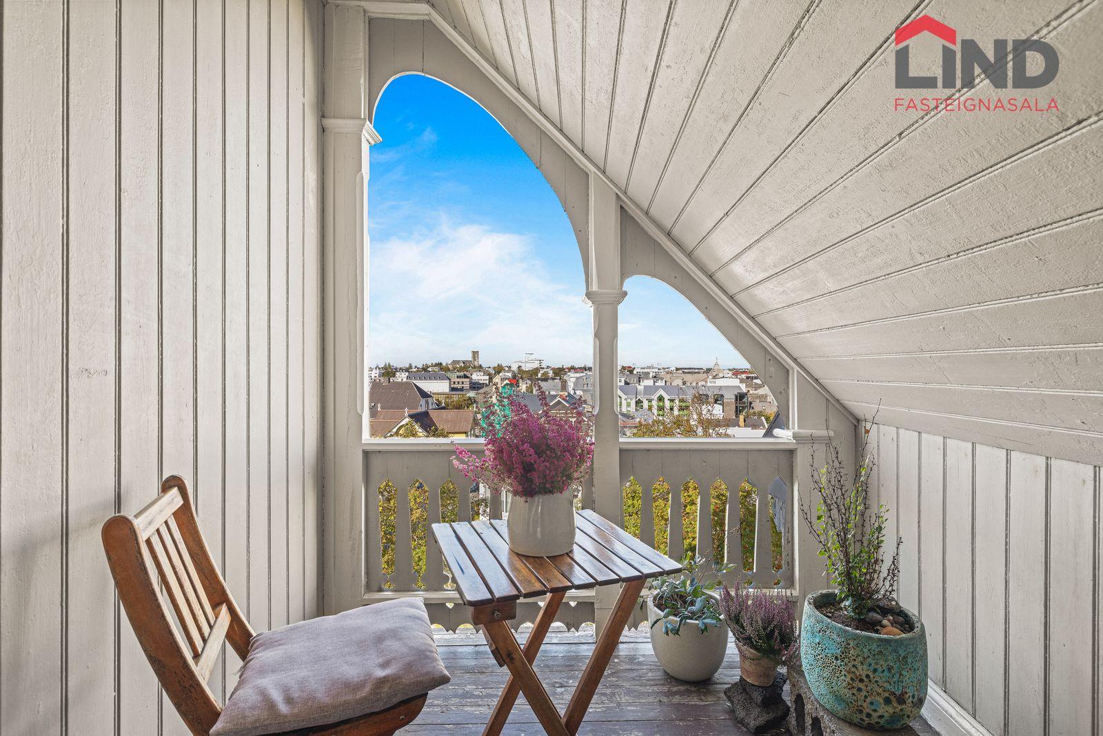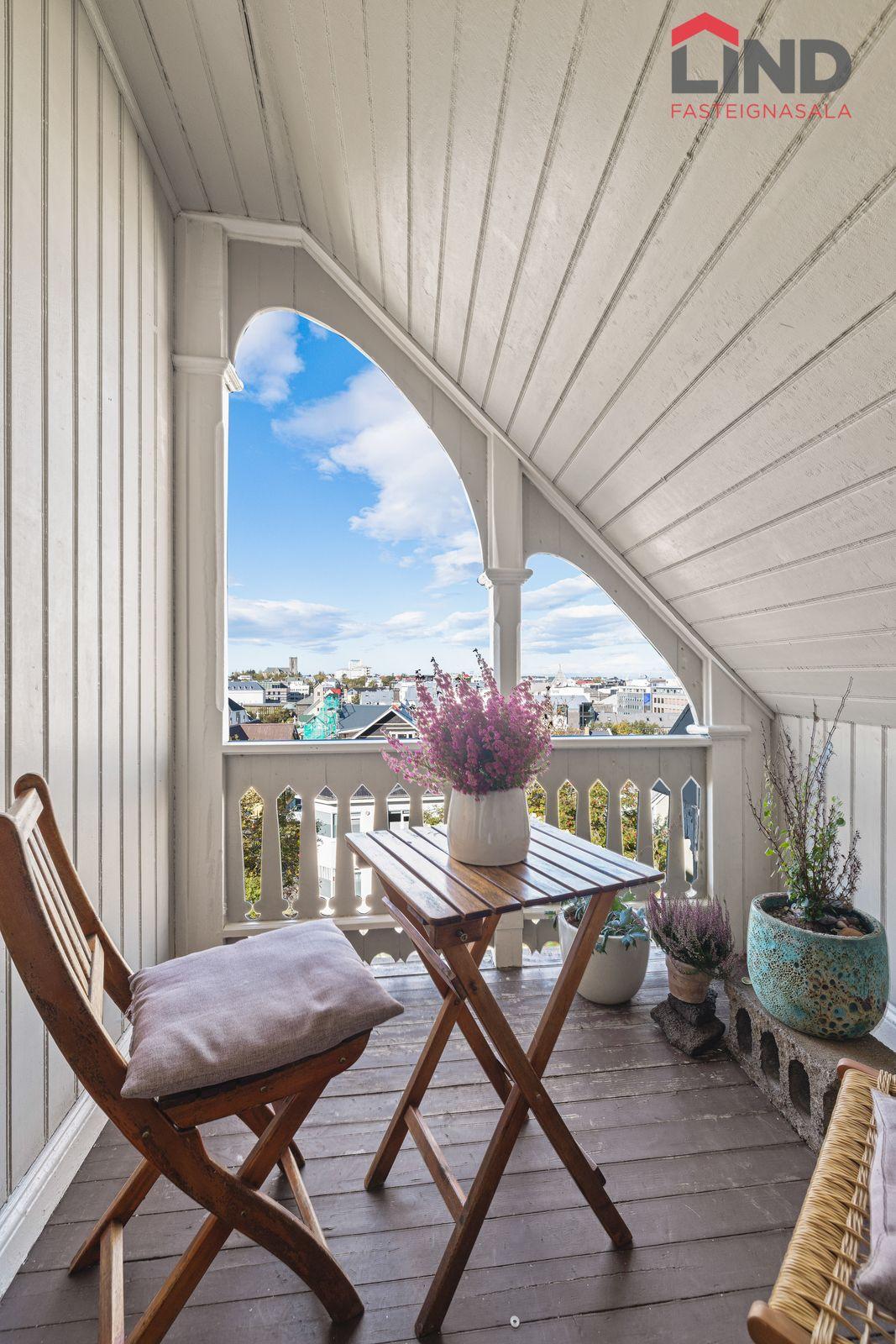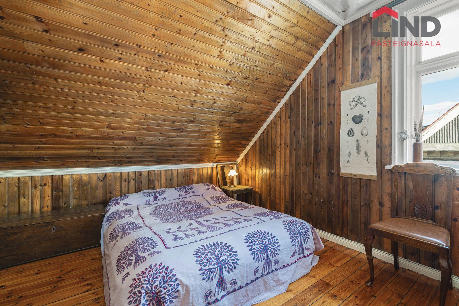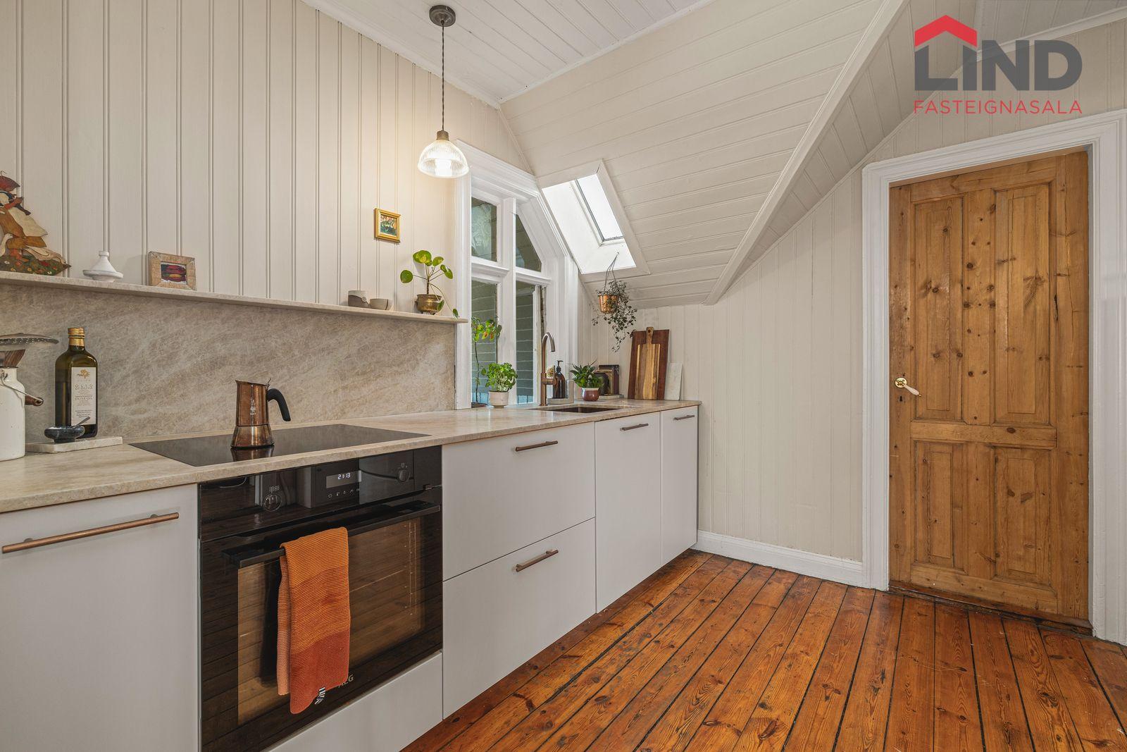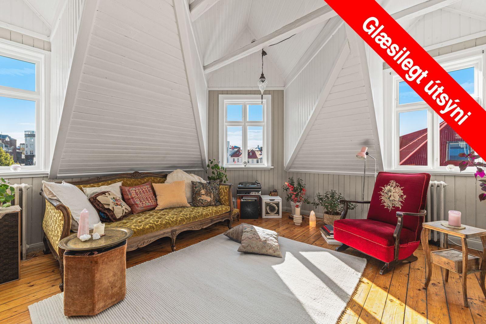 Lind fasteignasala / Heimir Hallgrímsson lögg. fasteignasali kynna til sölu glæsilega og sjarmerandi 3ja herbergja útsýnisíbúð með svölum á 3. hæð í afar fallegu bárujárnsklæddu timburhúsi byggðu árið 1907. Íbúðin er skráð 74,1 fermetrar að stærð en er mun stærri að grunnfleti þar sem hluti íbúðar er undir súð og nýtast þeir fermetrar mjög vel. Íbúðin er með upphaflegum viðarborðum á gólfum og panelklæddum veggjum og loftum. Aukin lofthæð er yfir hluta af stofum með fallegum viðarbitum í lofti. Reynt hefur verið að halda í upprunlegt horf hússins í viðhaldssögu þess. M.a. voru allir gluggar á austur- og suðurhlið endurnýjaðir (sérsmíðaðir) á árinu í upprunalegum stíl hússins. Þá var eldhús endurnýjað nýlega á smekklegan máta. Auk þess er búið að endurnýja mest af neysluvatnslögnum og rafmagnstöflu innan íbúðar.